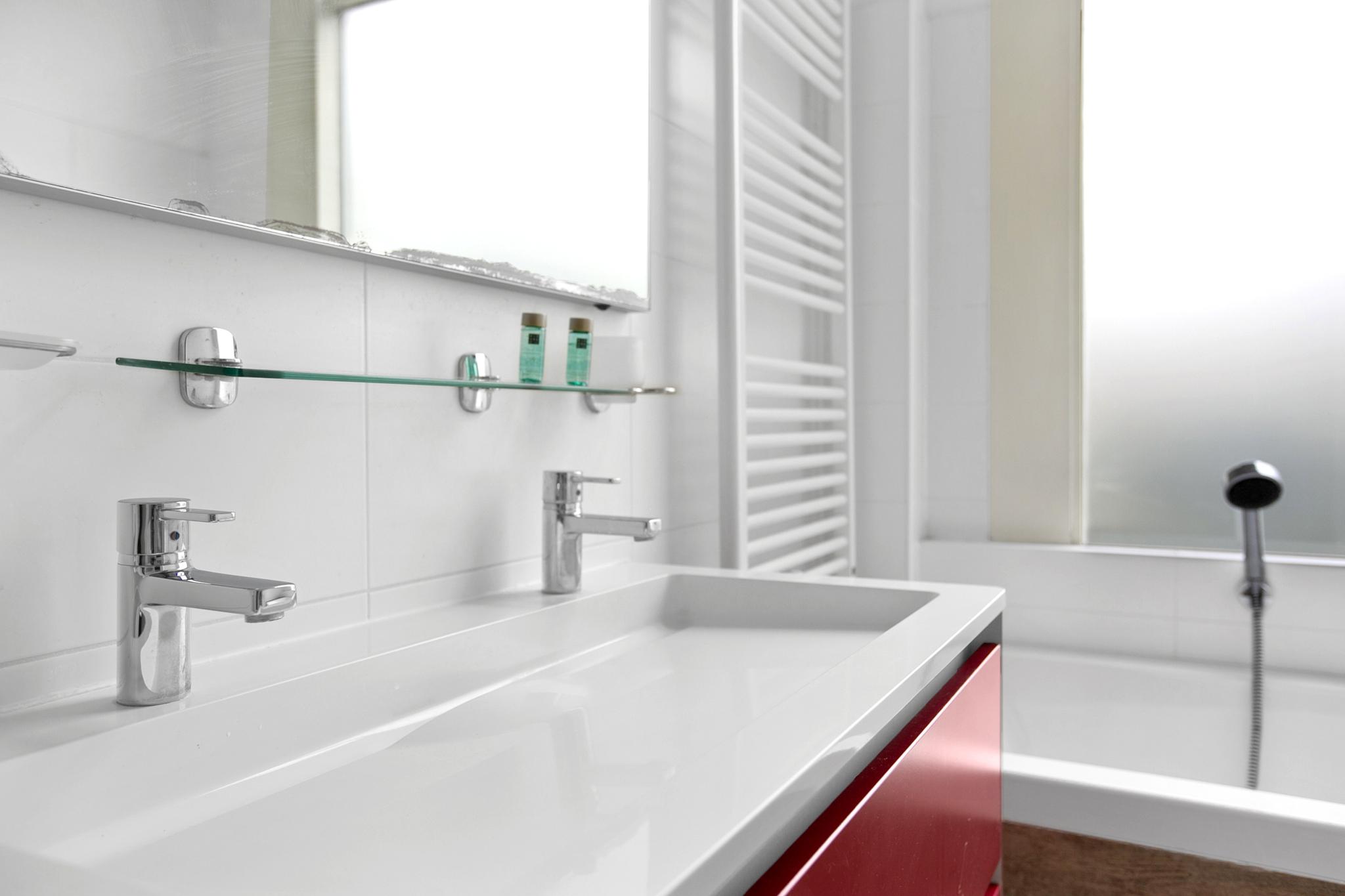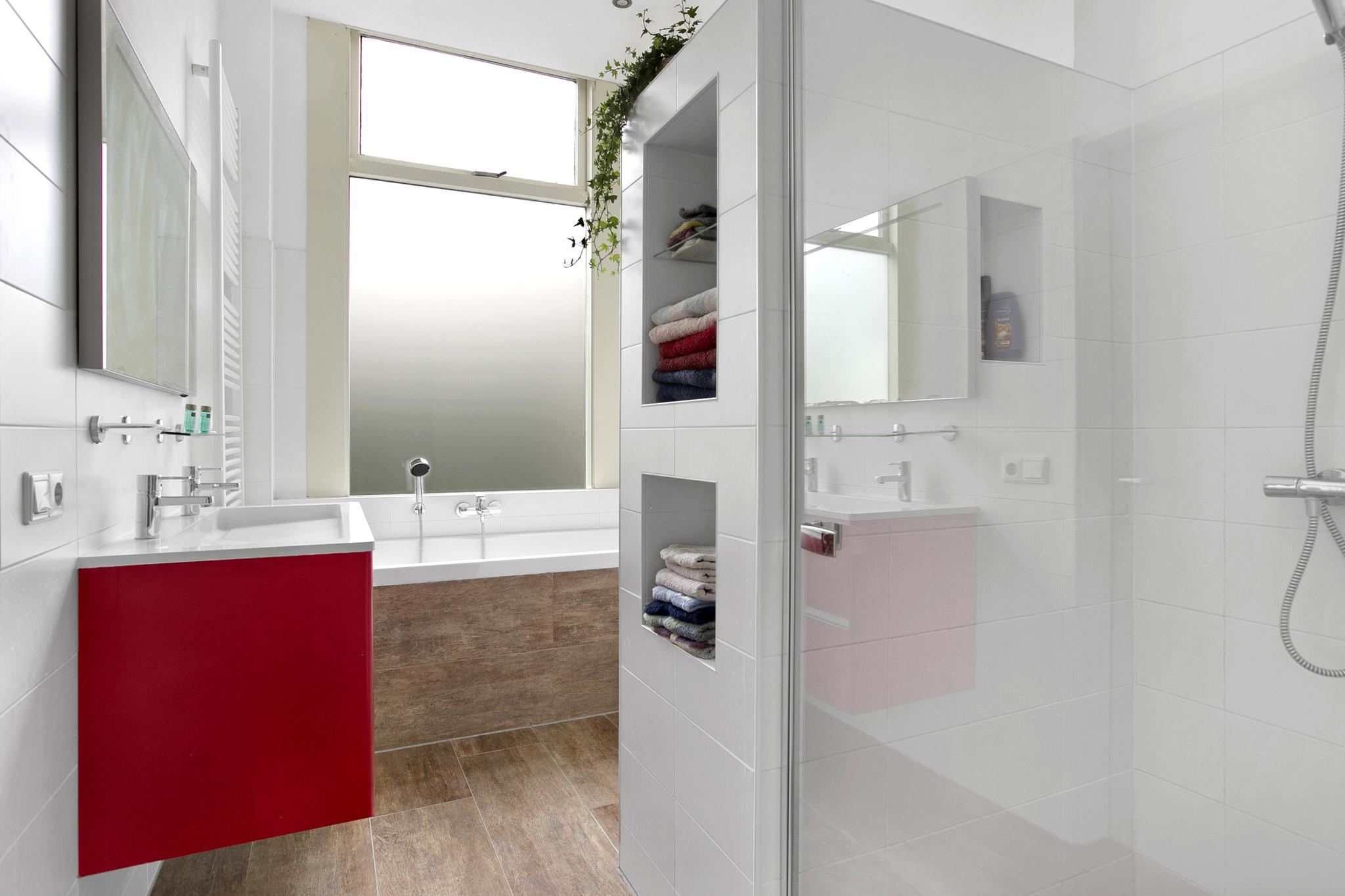 Badkamer met bad, douche, toilet en dubbele wastafel.