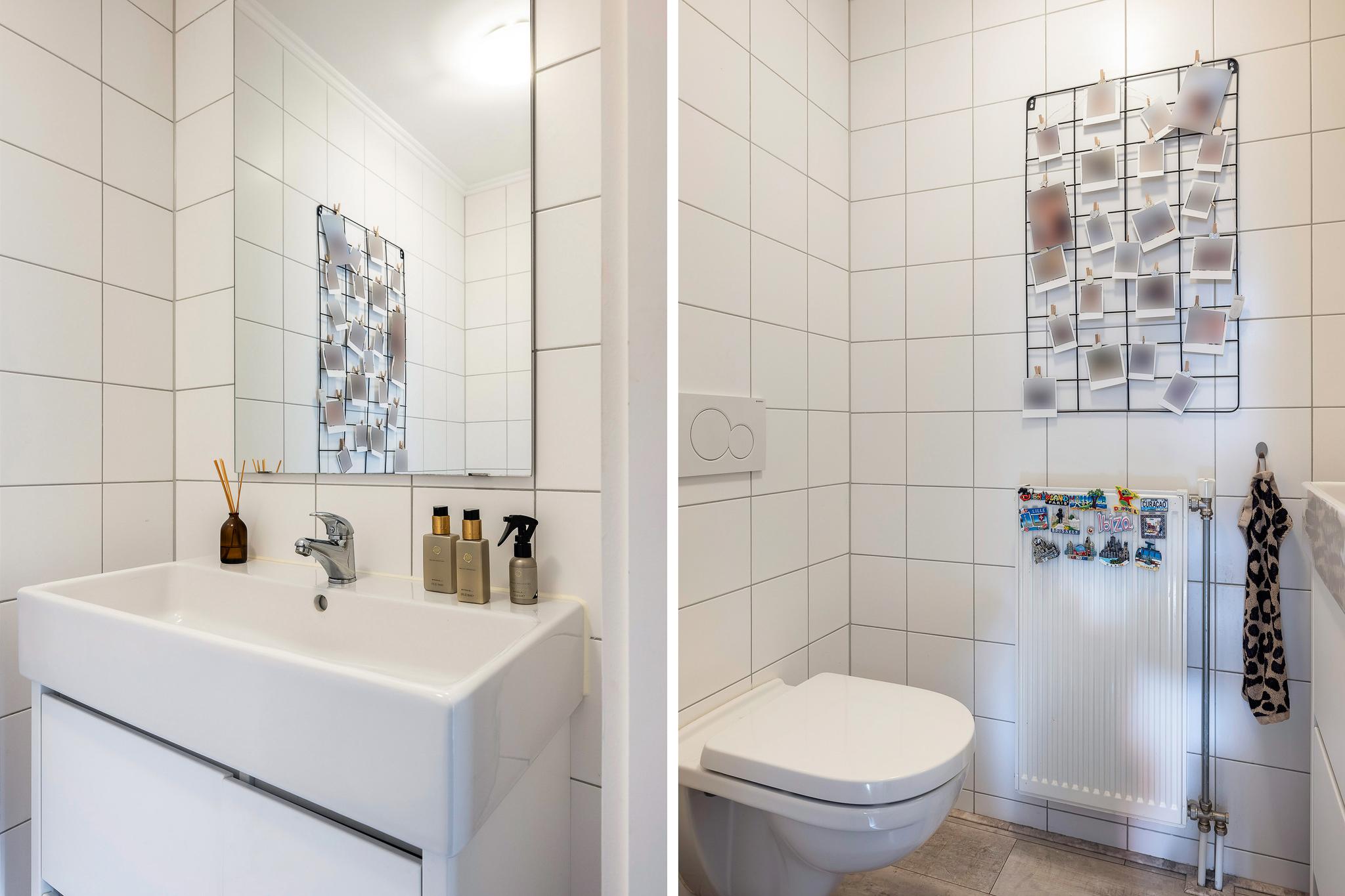 Toilet, vrijhangend met geheel betegelde wanden, fonteintje en meubel.