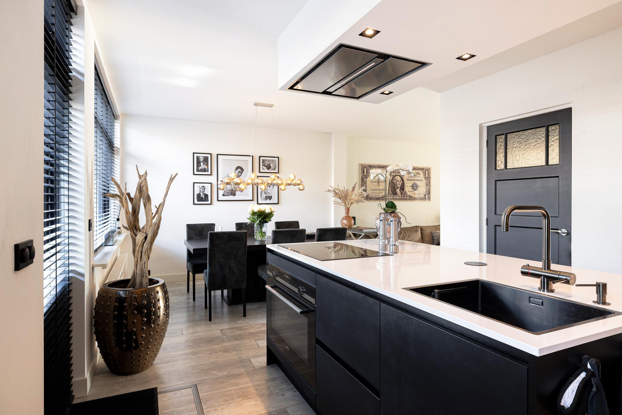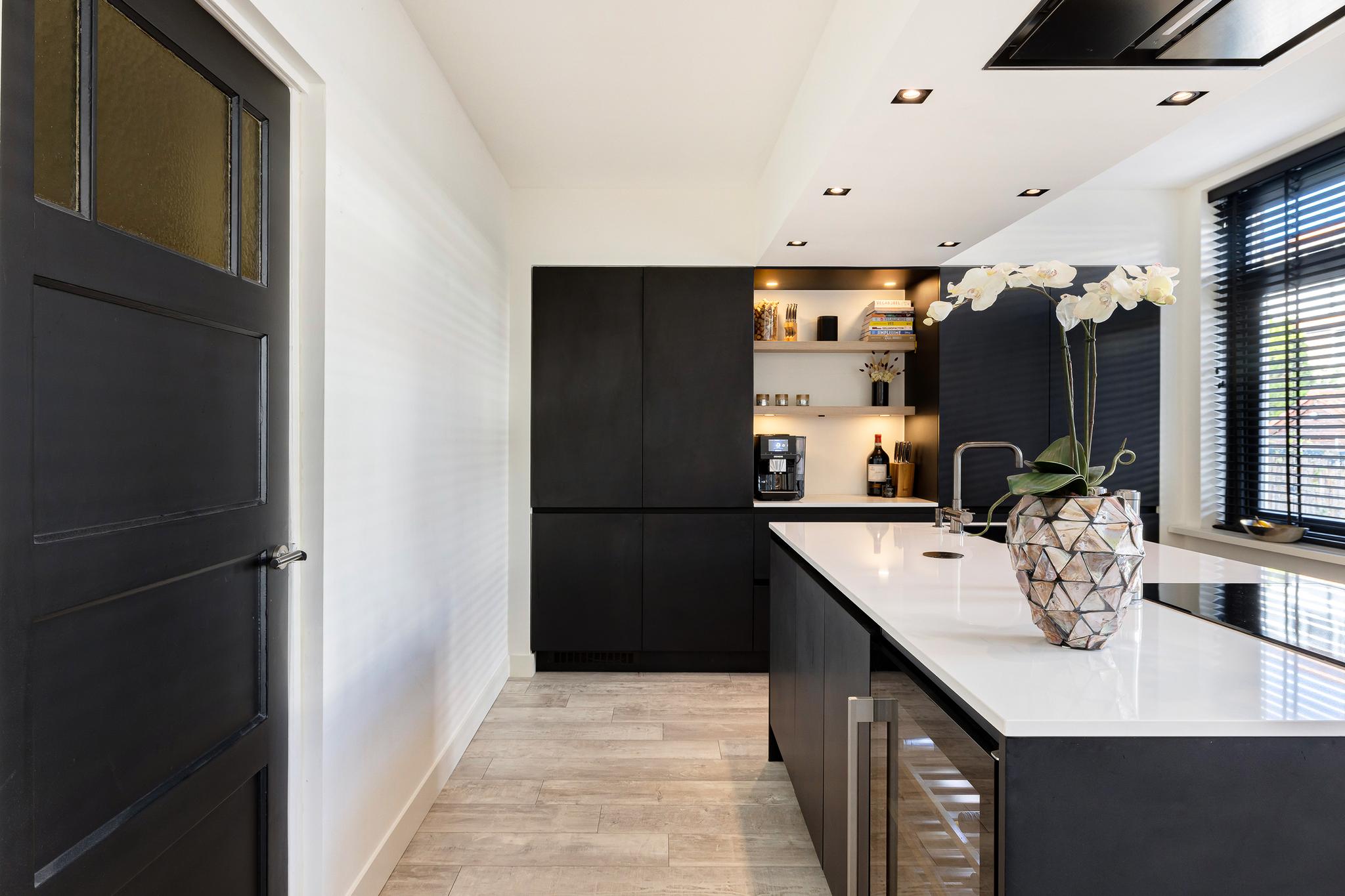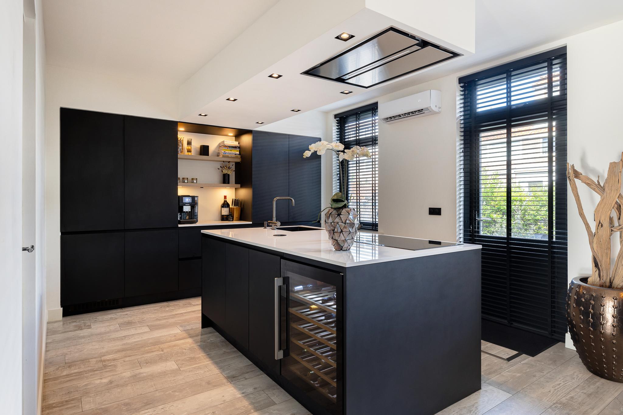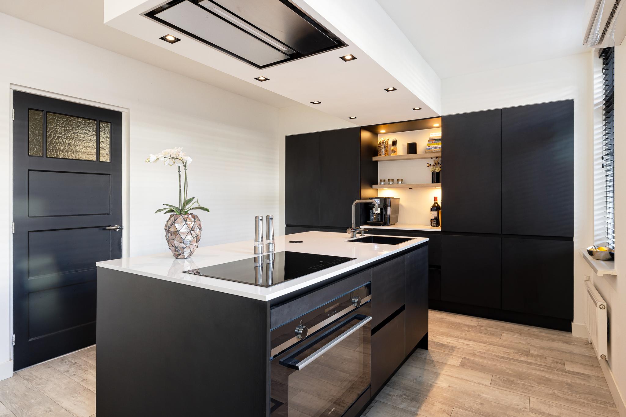 De keuken is echt de eye cather van deze benedenwoning, een enorm eiland met wijnklimaatkast, vaatwasser, grote vriezer en koelkast, spoelbak en kokend water kraan, oven, inductie kookplaat en afzuigkap in het plafond. Voor de liefhebber is er ruimte voor een magnetron. Het geheel is afgewerkt met een composiet blad. Vanuit de keuken is er toegang tot de tuin.