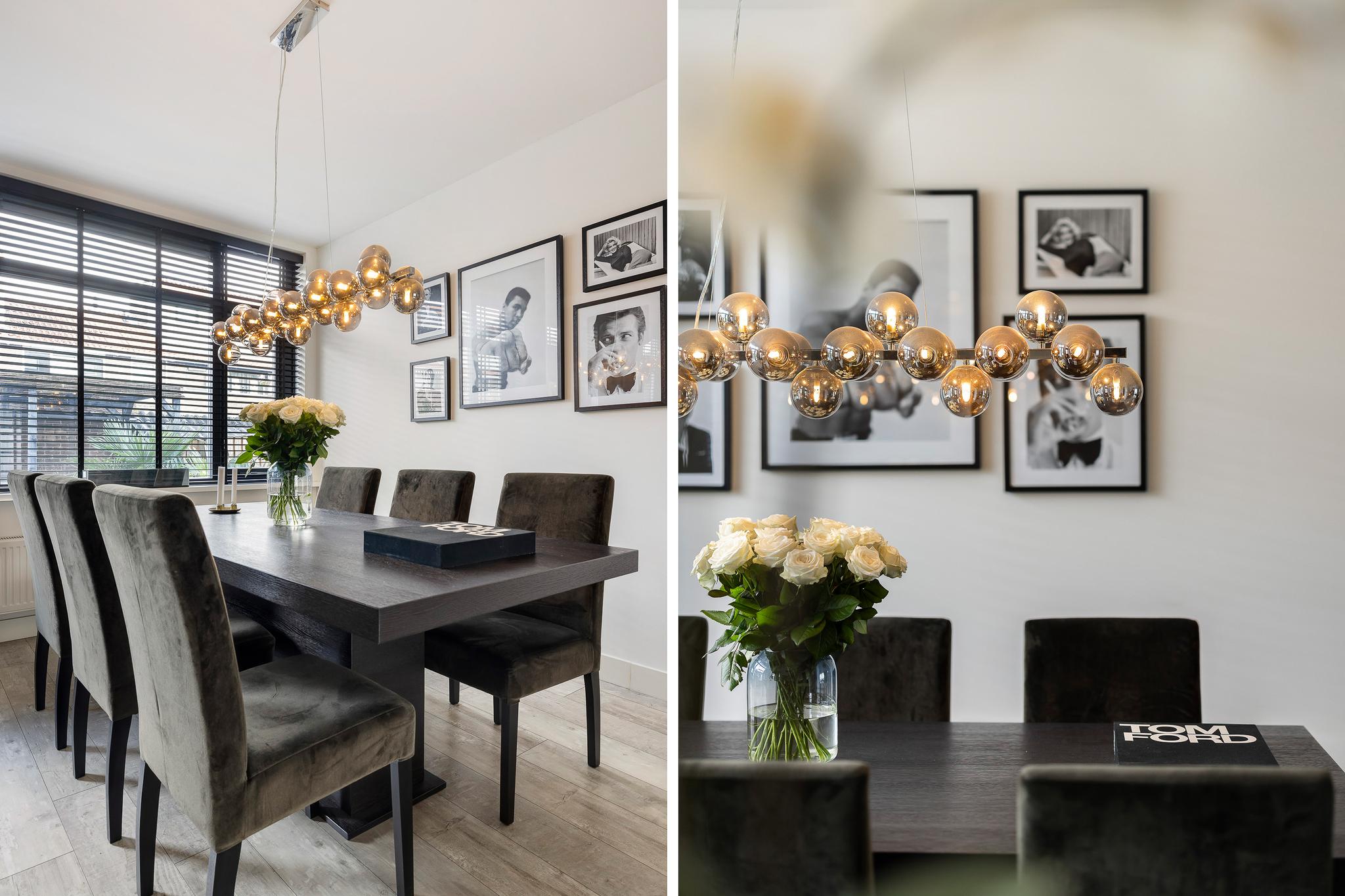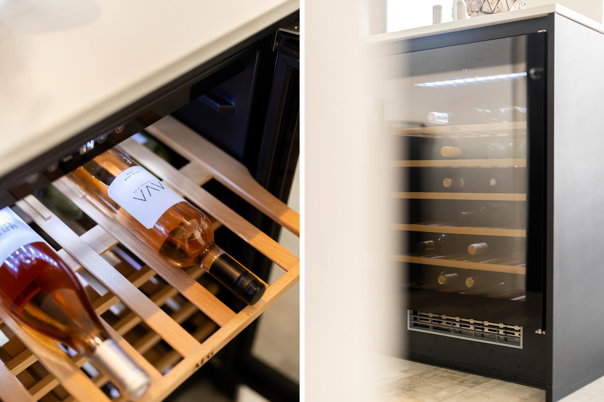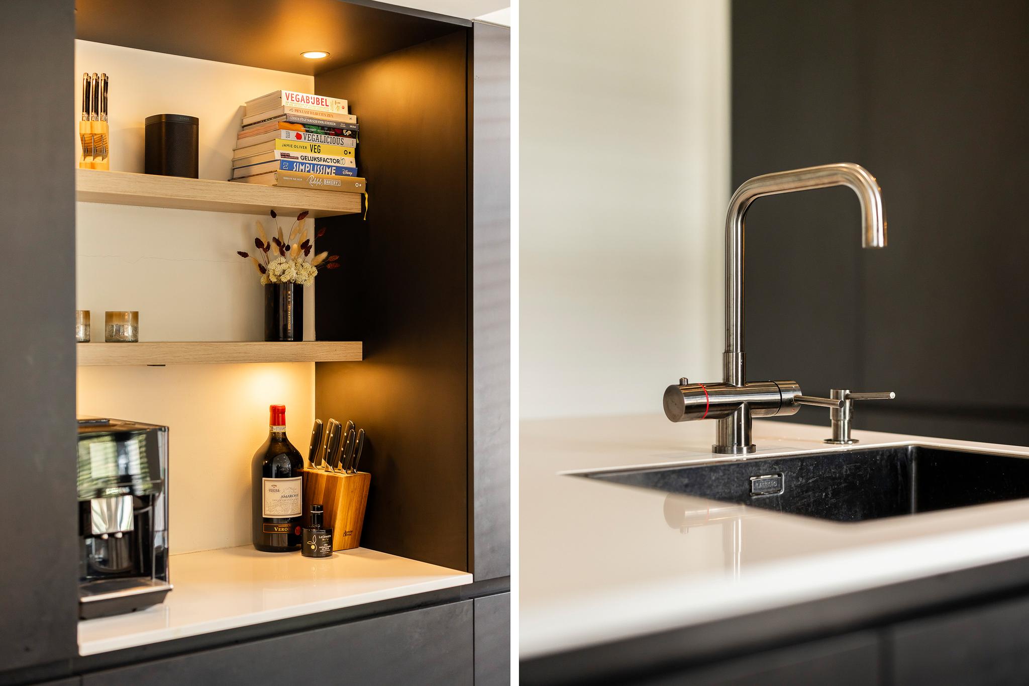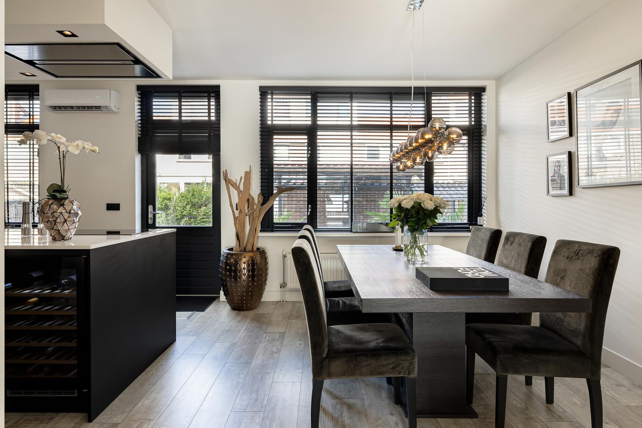 De keuken is echt de eye cather van deze benedenwoning, een enorm eiland met wijnklimaatkast, vaatwasser, grote vriezer en koelkast, spoelbak en kokend water kraan, oven, inductie kookplaat en afzuigkap in het plafond. Voor de liefhebber is er ruimte voor een magnetron. Het geheel is afgewerkt met een composiet blad. Vanuit de keuken is er toegang tot de tuin.