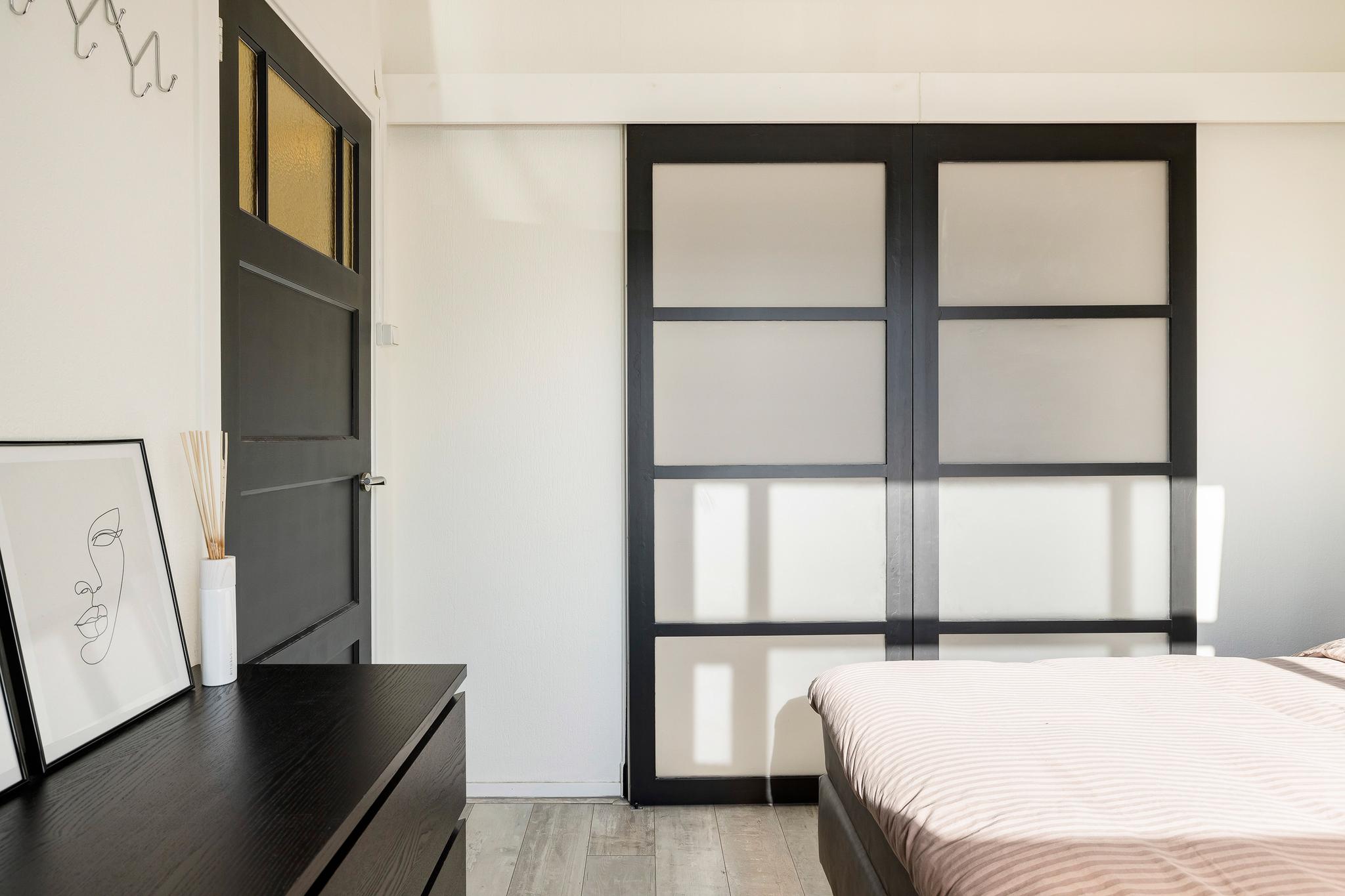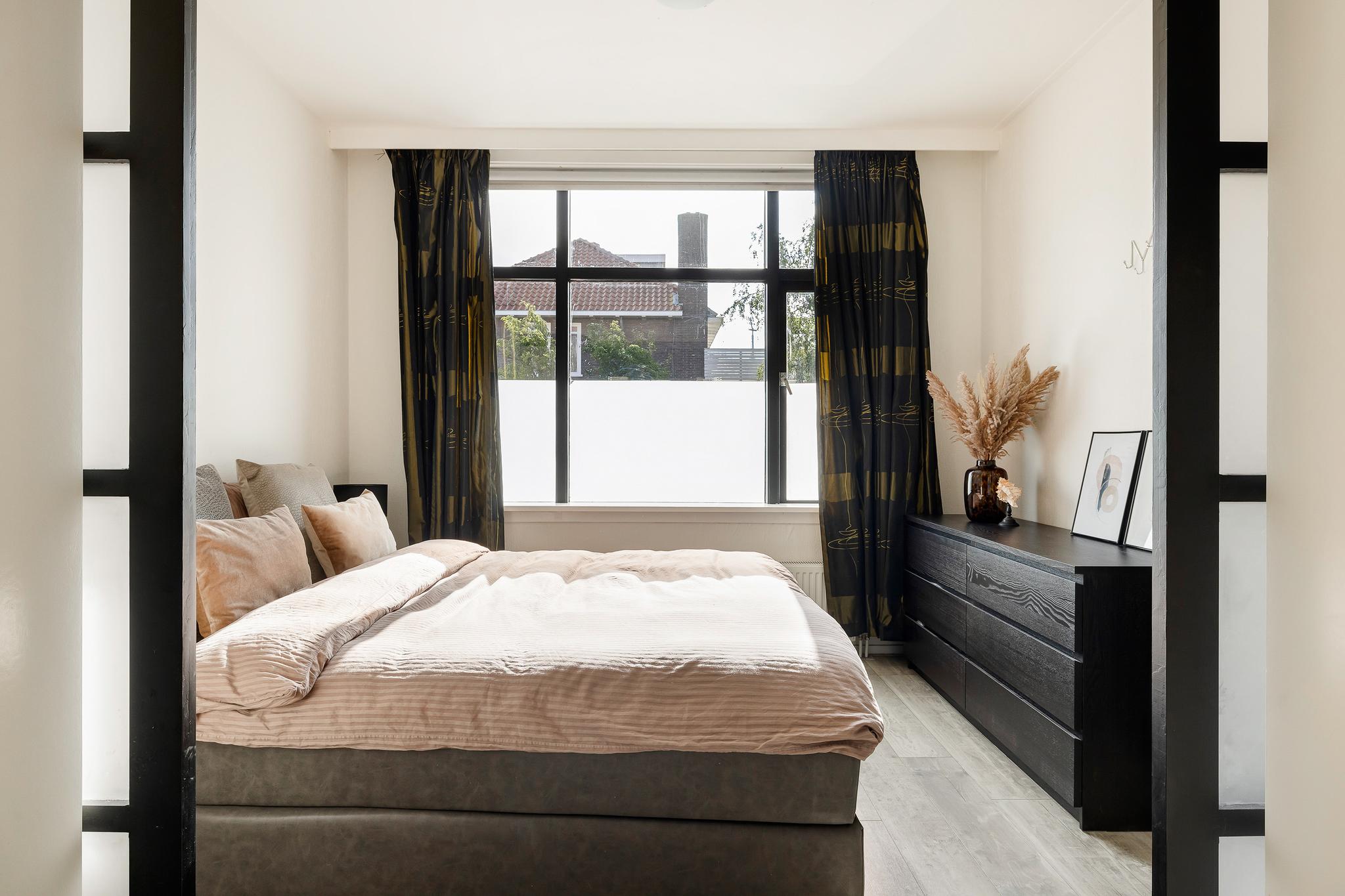Slaapkamer 1 aan de voorzijde is bereikbaar vanuit de hal maar heeft ook een schuifdeur naar de woonkamer.