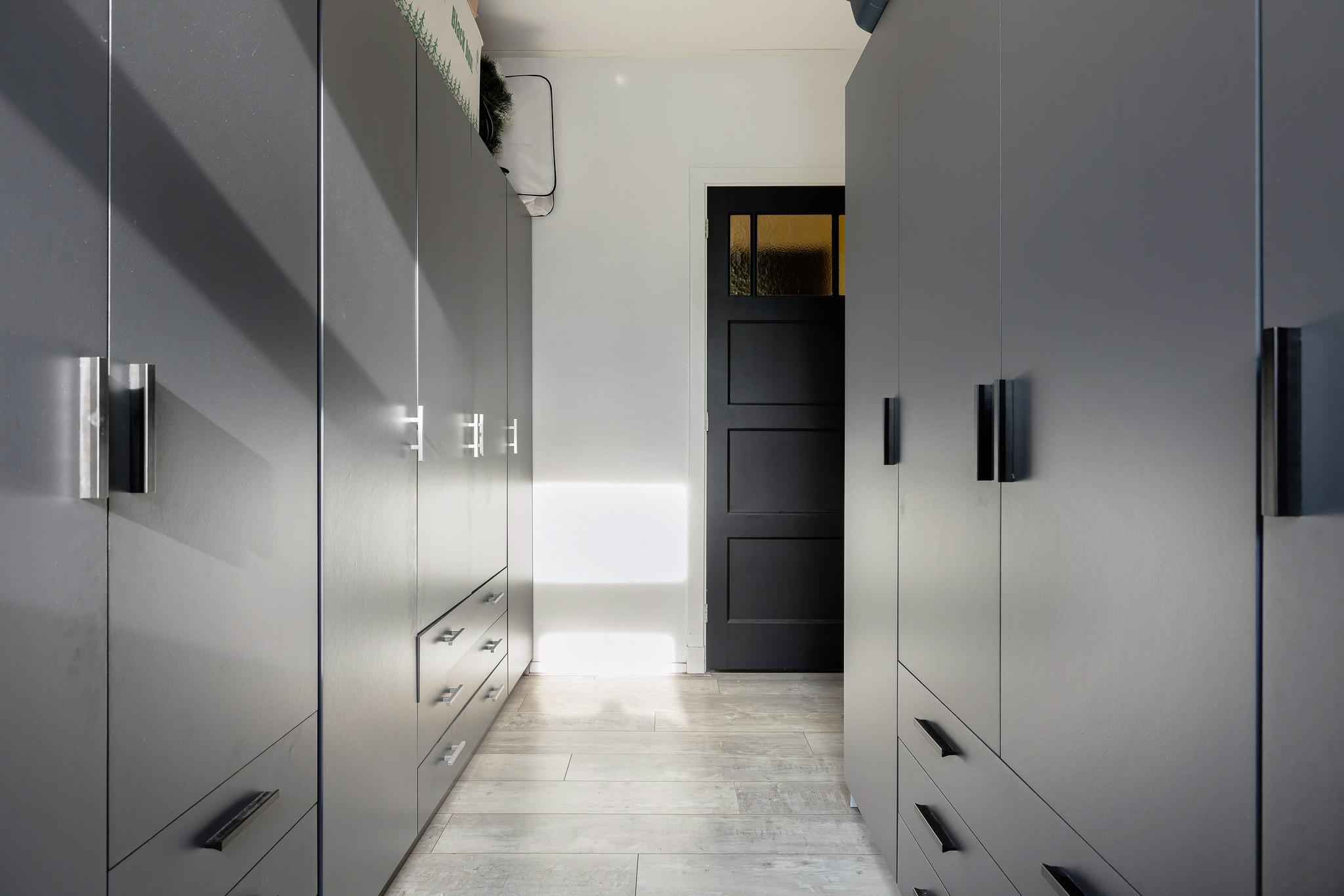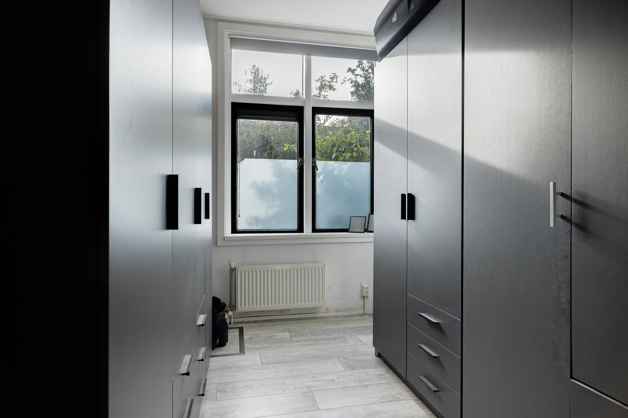 Slaapkamer 2, thans in gebruik als inloopkast, beide slaapkamers zijn voorzien van behang wanden en laminaat vloer.