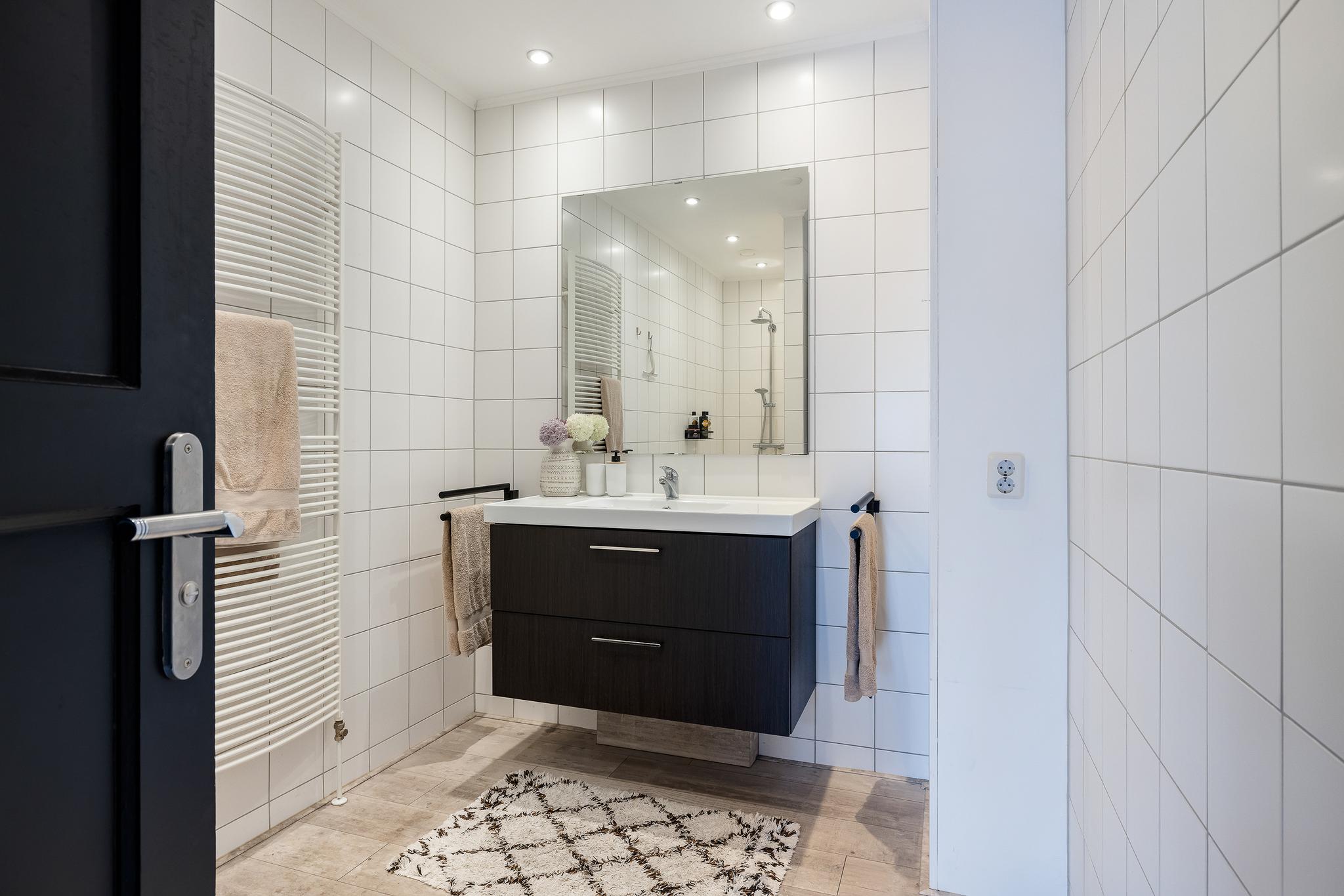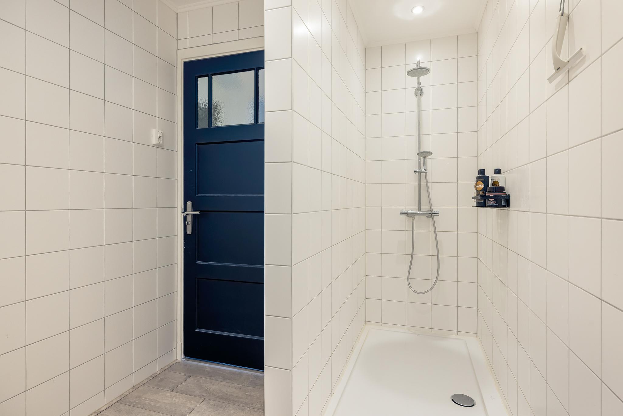 Inpandige badkamer met inloopdouche, thermostaatkraan, designradiator, wastafel en meubel, geheel betegelde wanden en verlaagd plafond met spots. De CV ketel is weggewerkt in een kast (merk Intergas Kombi Kompakt HRE 28/24, bouwjaar 2013)