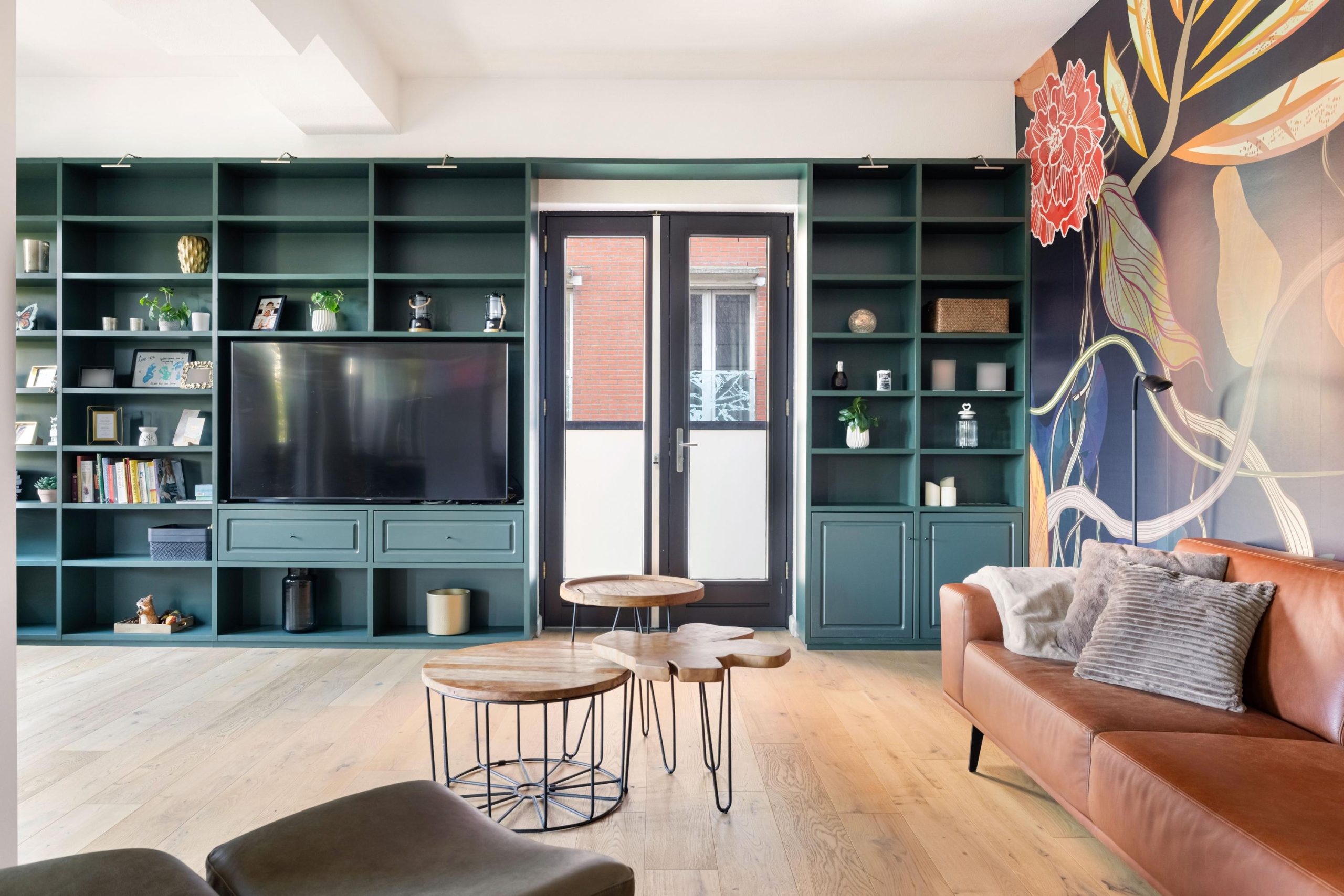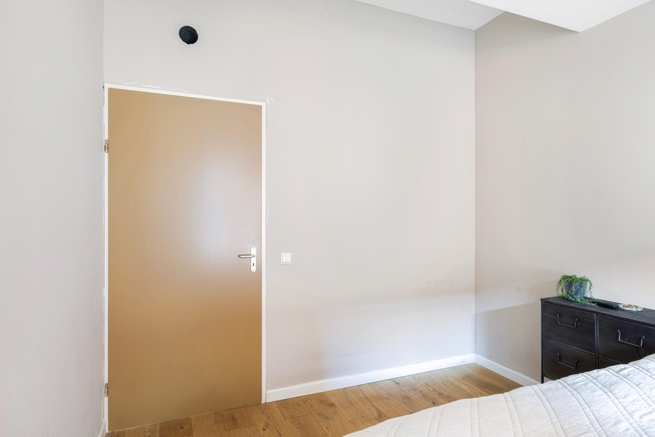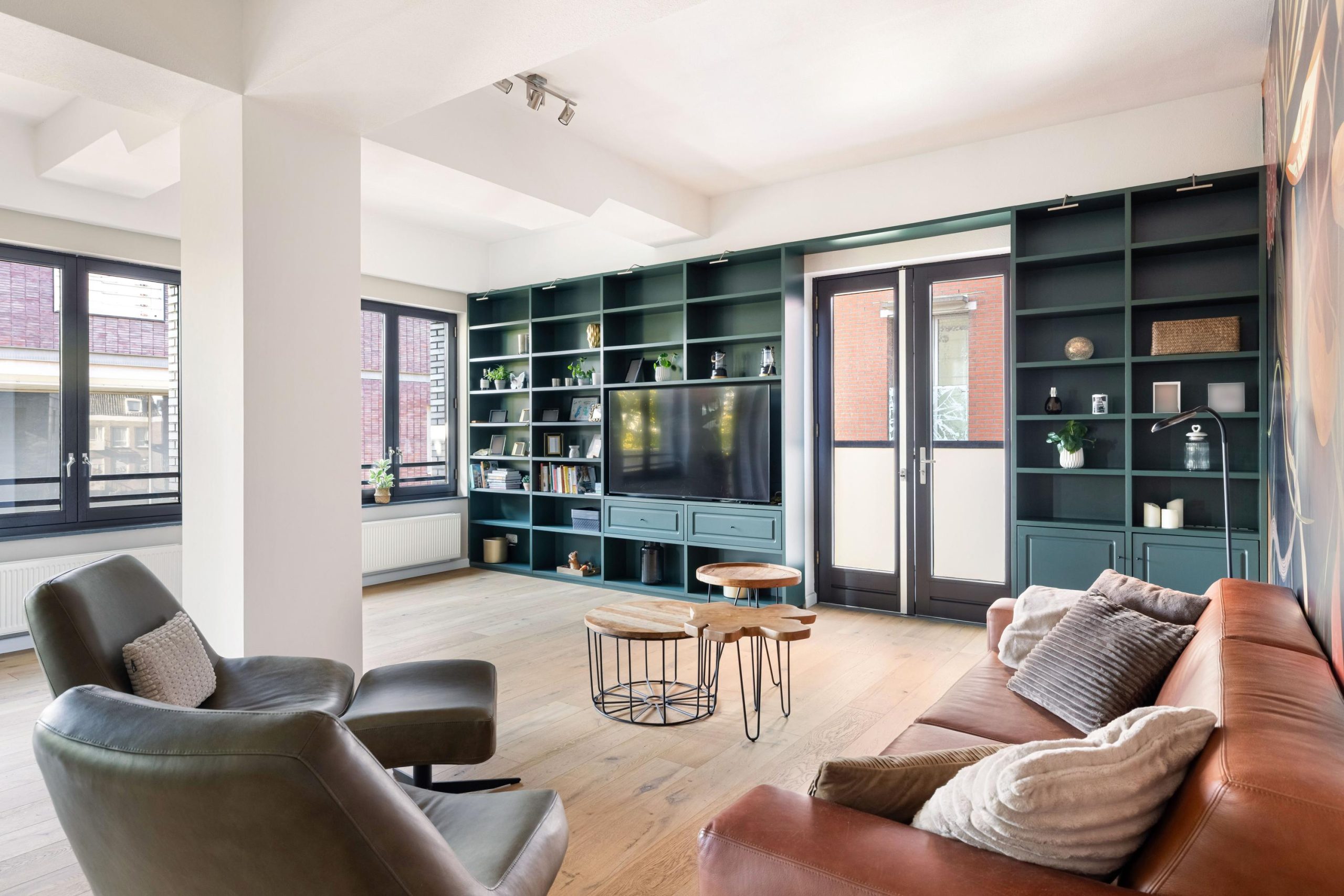 In de kamer is een grote op maat gemaakte vaste kastenwand aanwezig, handig als opbergruimte, boekenkast of om bijvoorbeeld je collectie keramiek uit te stallen. In de woonkamer zijn 2 paar openslaande deuren aanwezig met toegang tot 2 balkons.