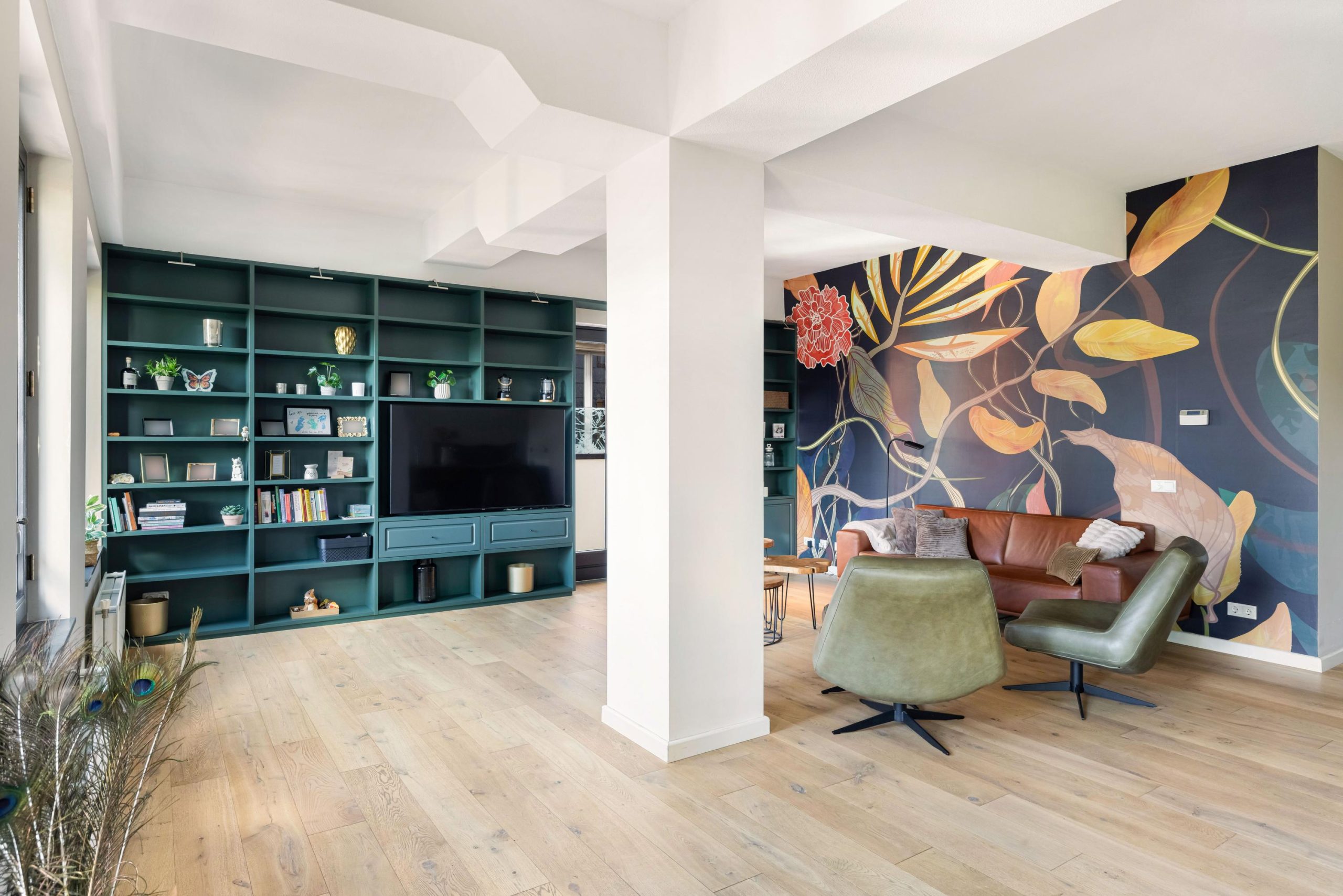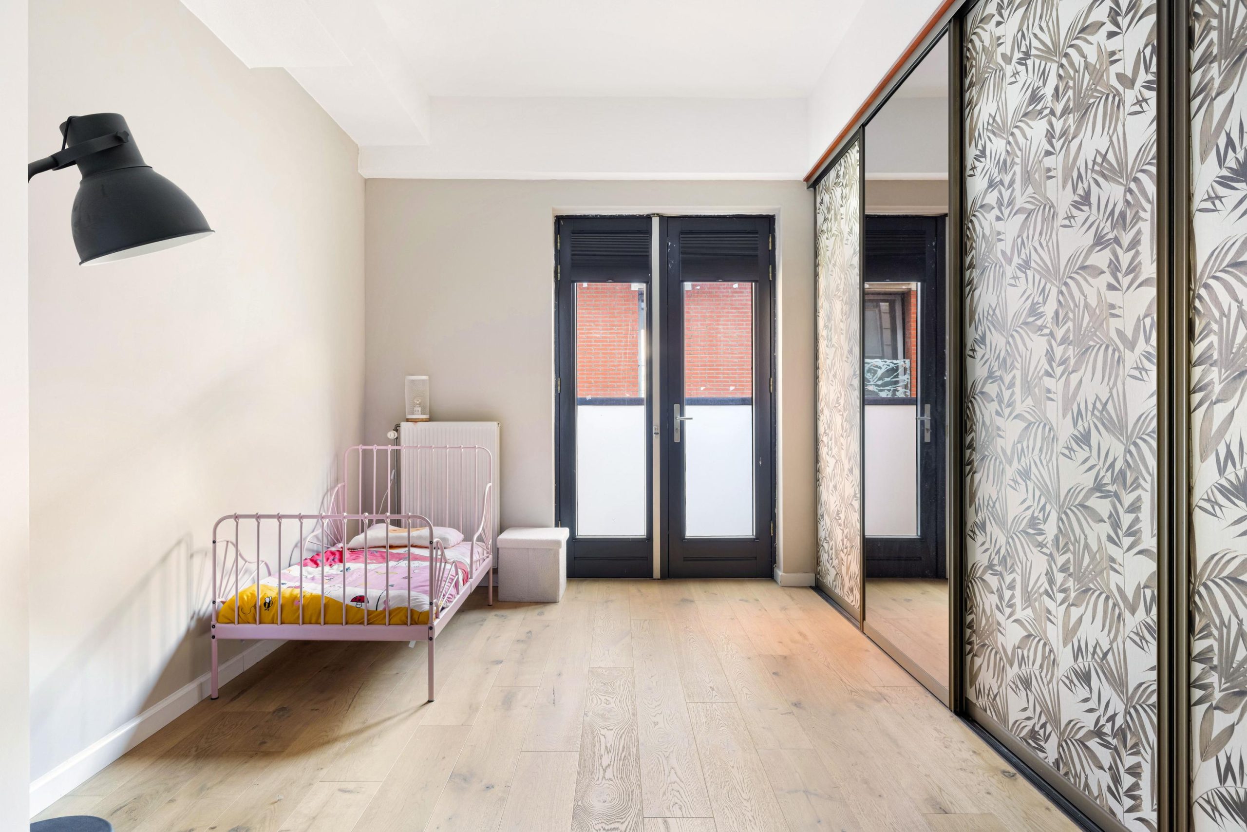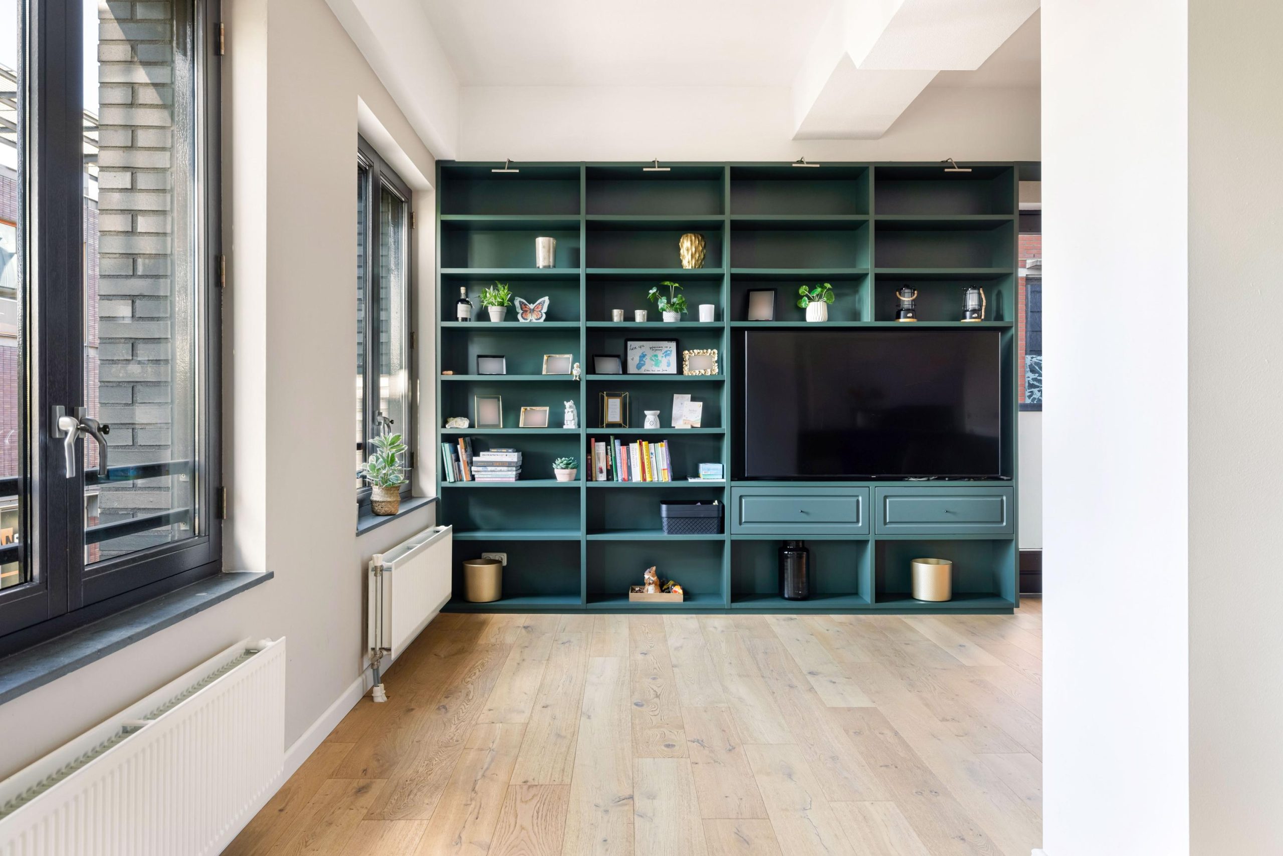 In de kamer is een grote op maat gemaakte vaste kastenwand aanwezig, handig als opbergruimte, boekenkast of om bijvoorbeeld je collectie keramiek uit te stallen. In de woonkamer zijn 2 paar openslaande deuren aanwezig met toegang tot 2 balkons.