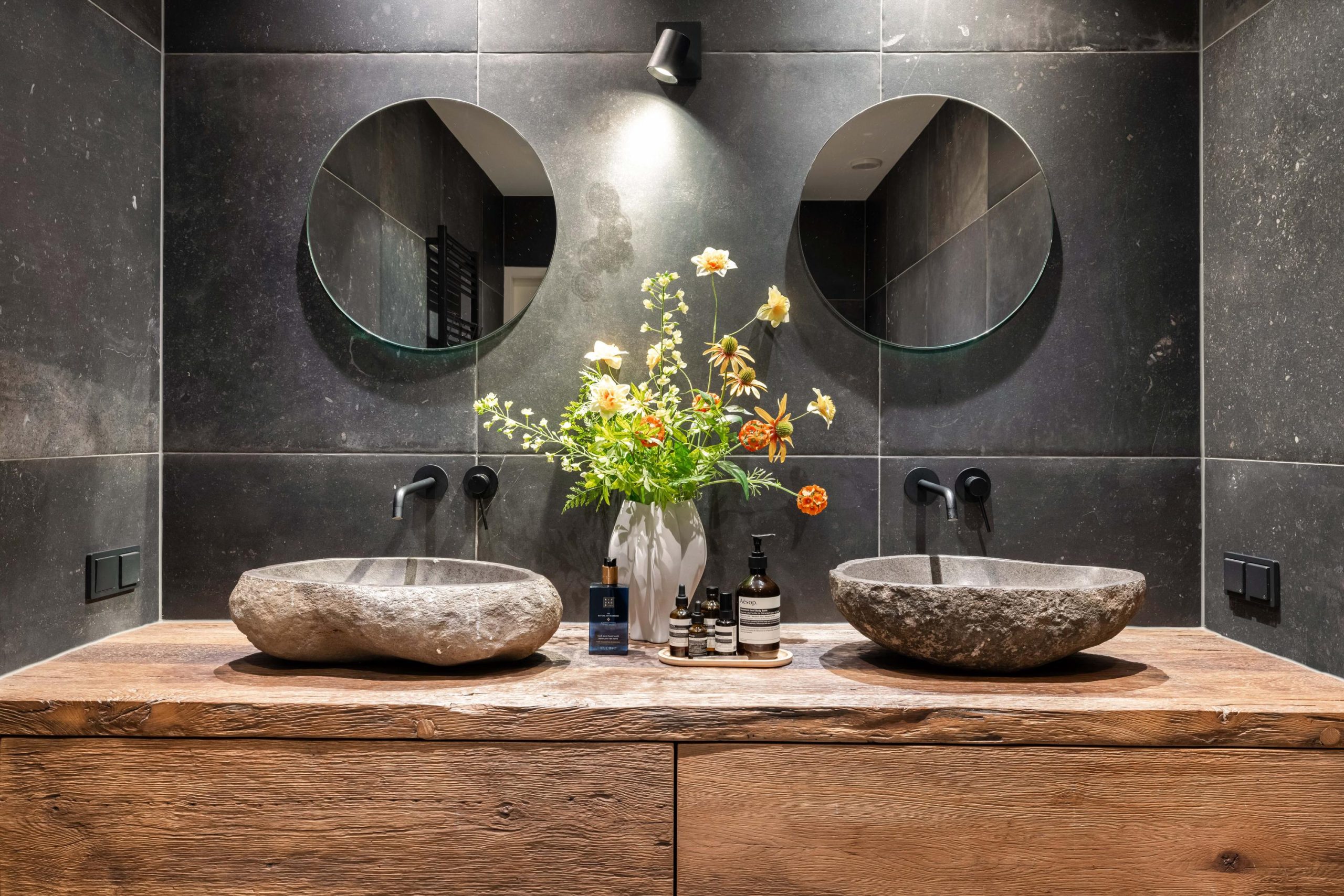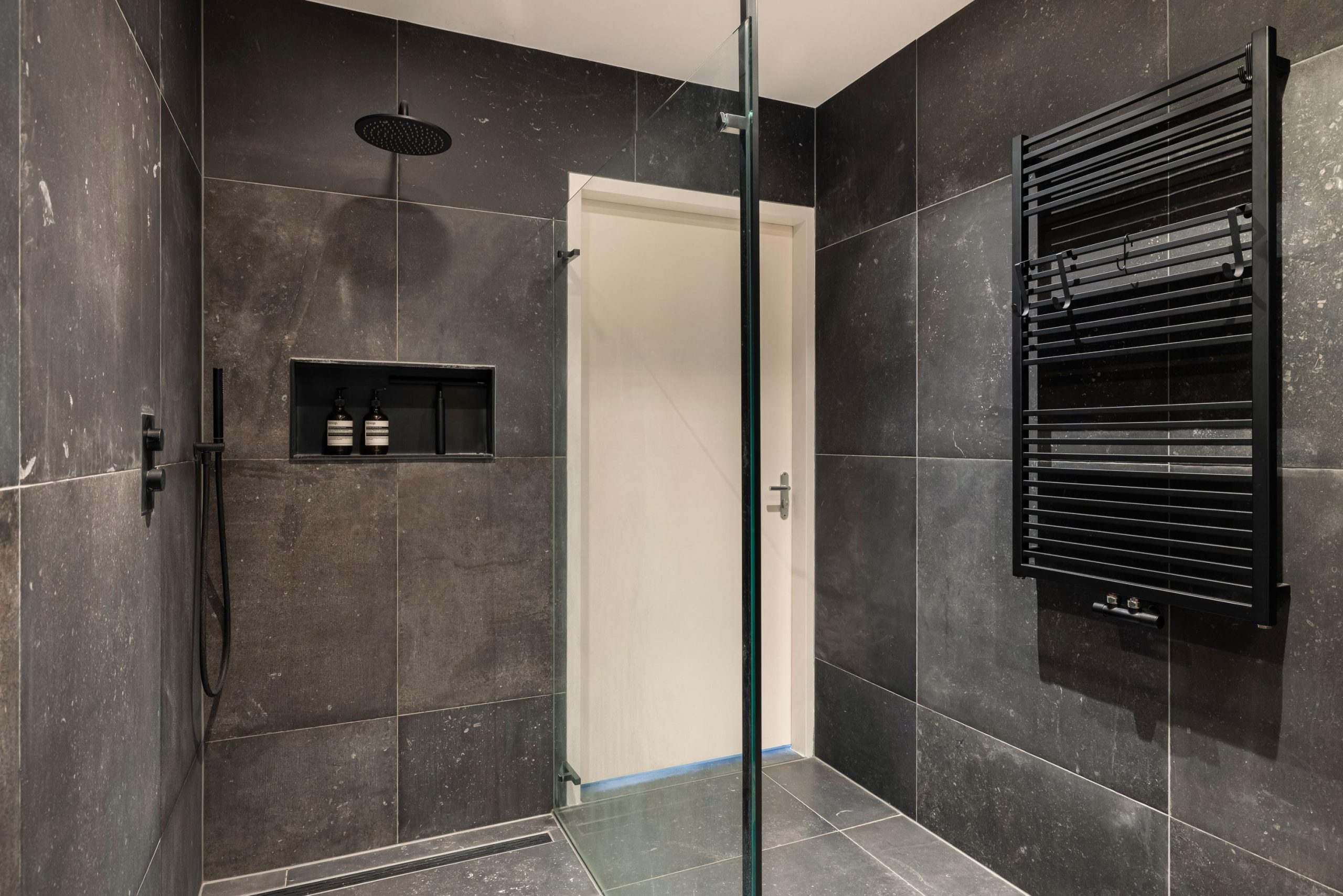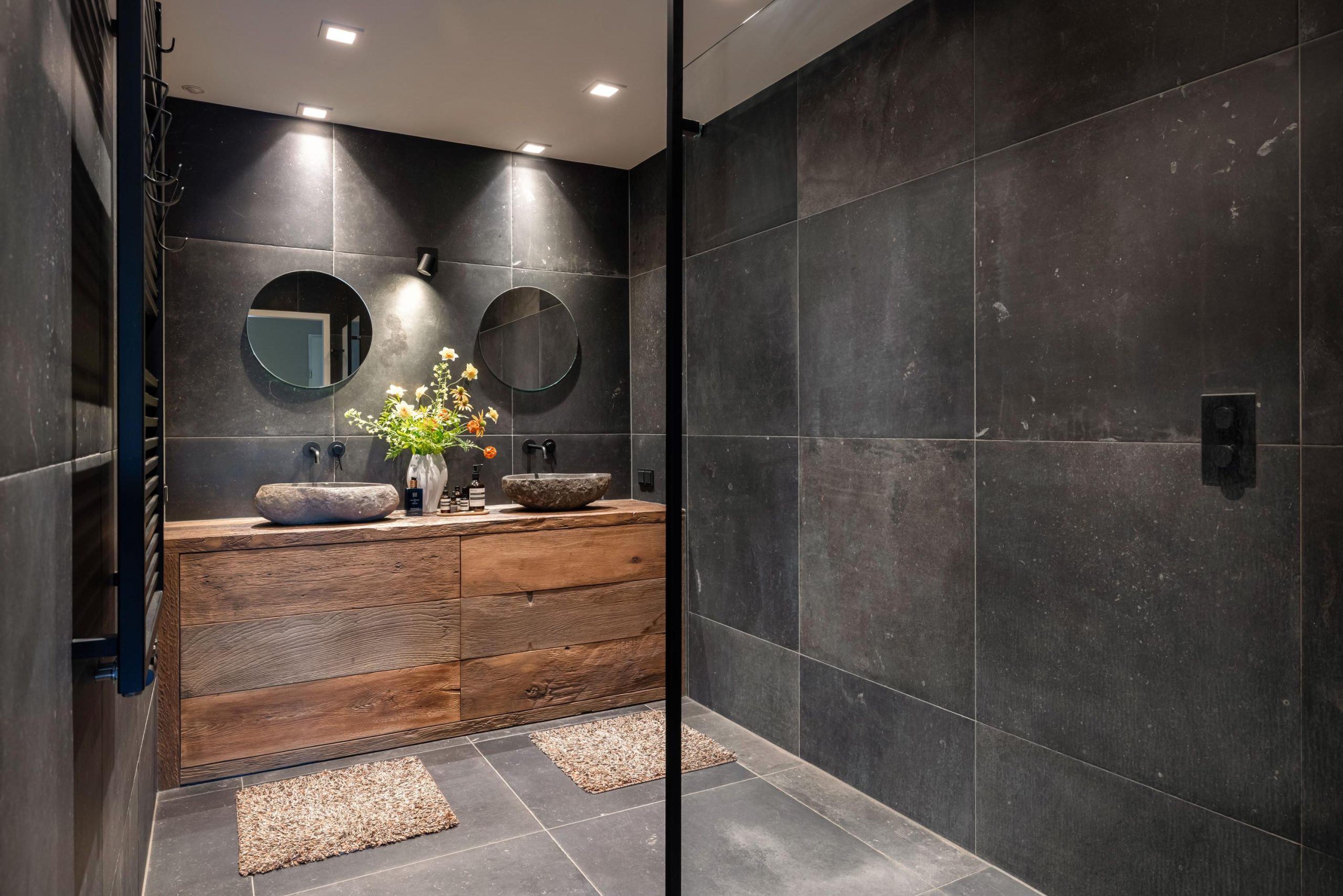 Inpandige en zeer sfeervolle badkamer met dubbele waskom in een op maat gemaakt houten meubel, inloop douche, regendouche en thermostaatkraan, designradiator, geheel betegelde wanden en verlaagd plafond met spots.