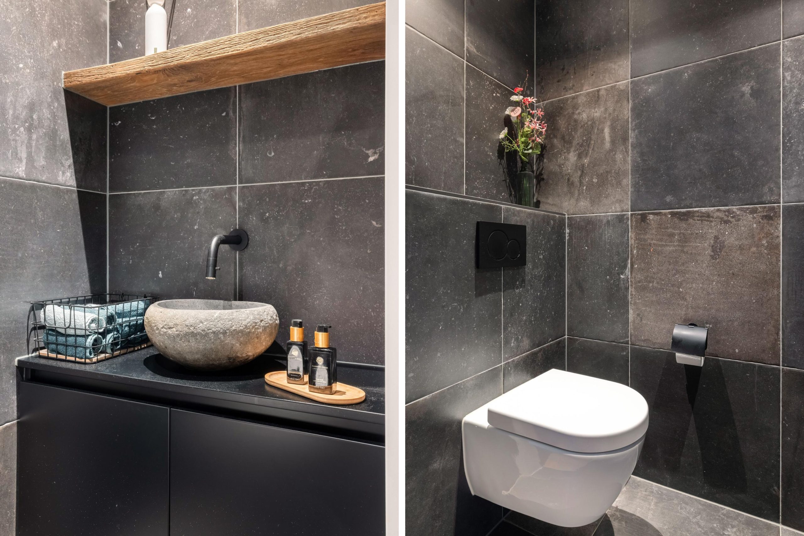 Apart toilet ook hier een hardstenen waskom met een meubel, geheel betegelde wanden en verlaagd plafond met spots.