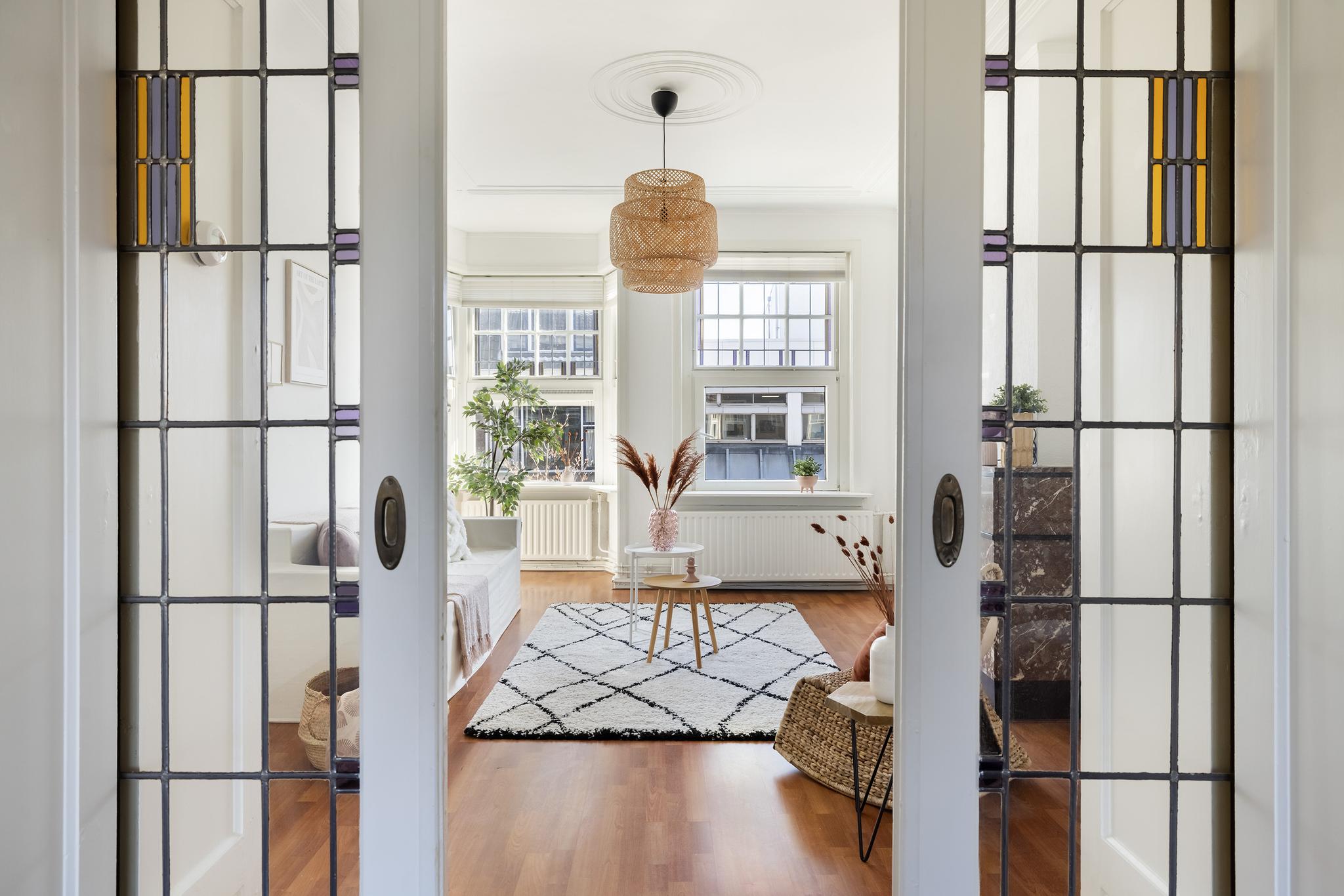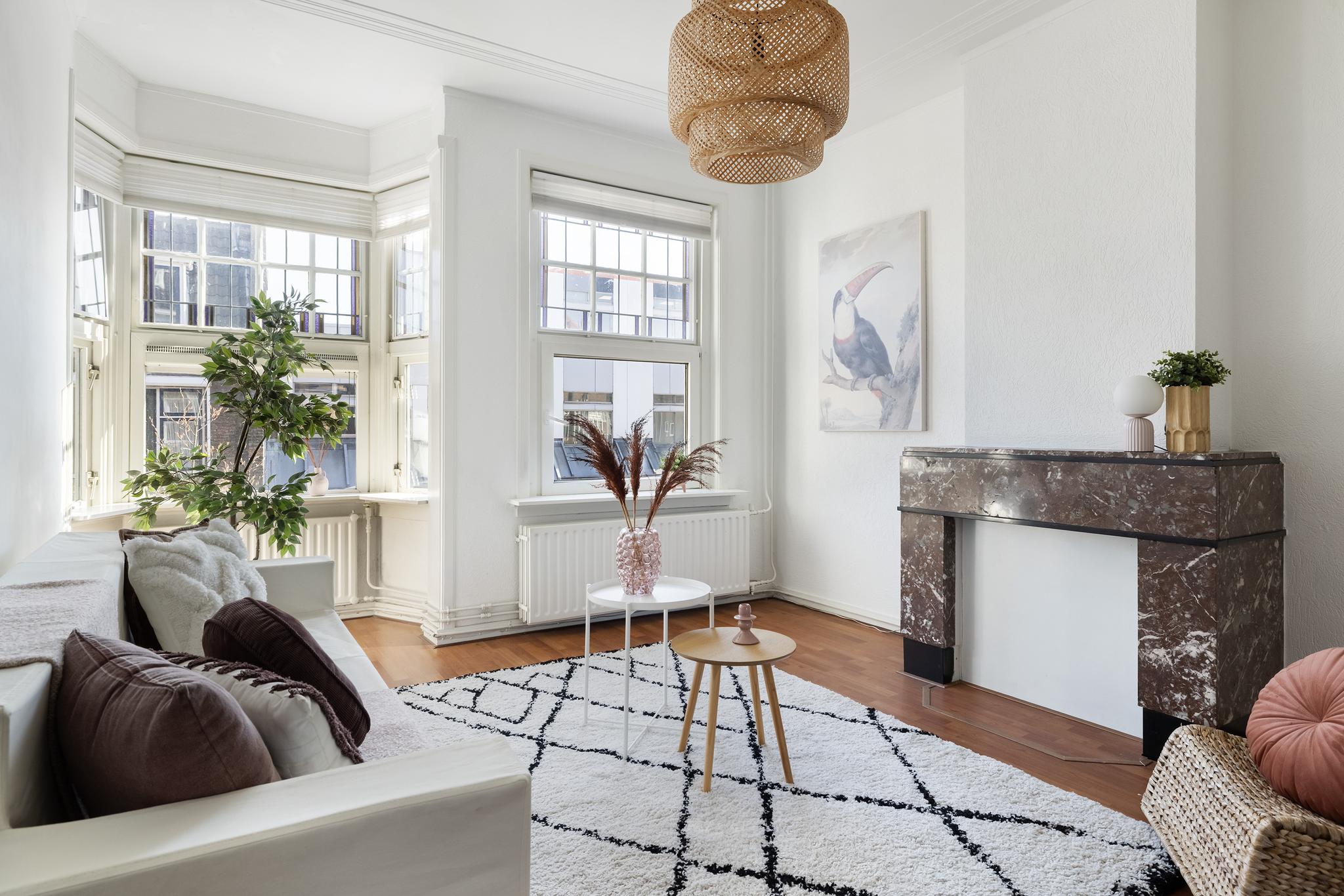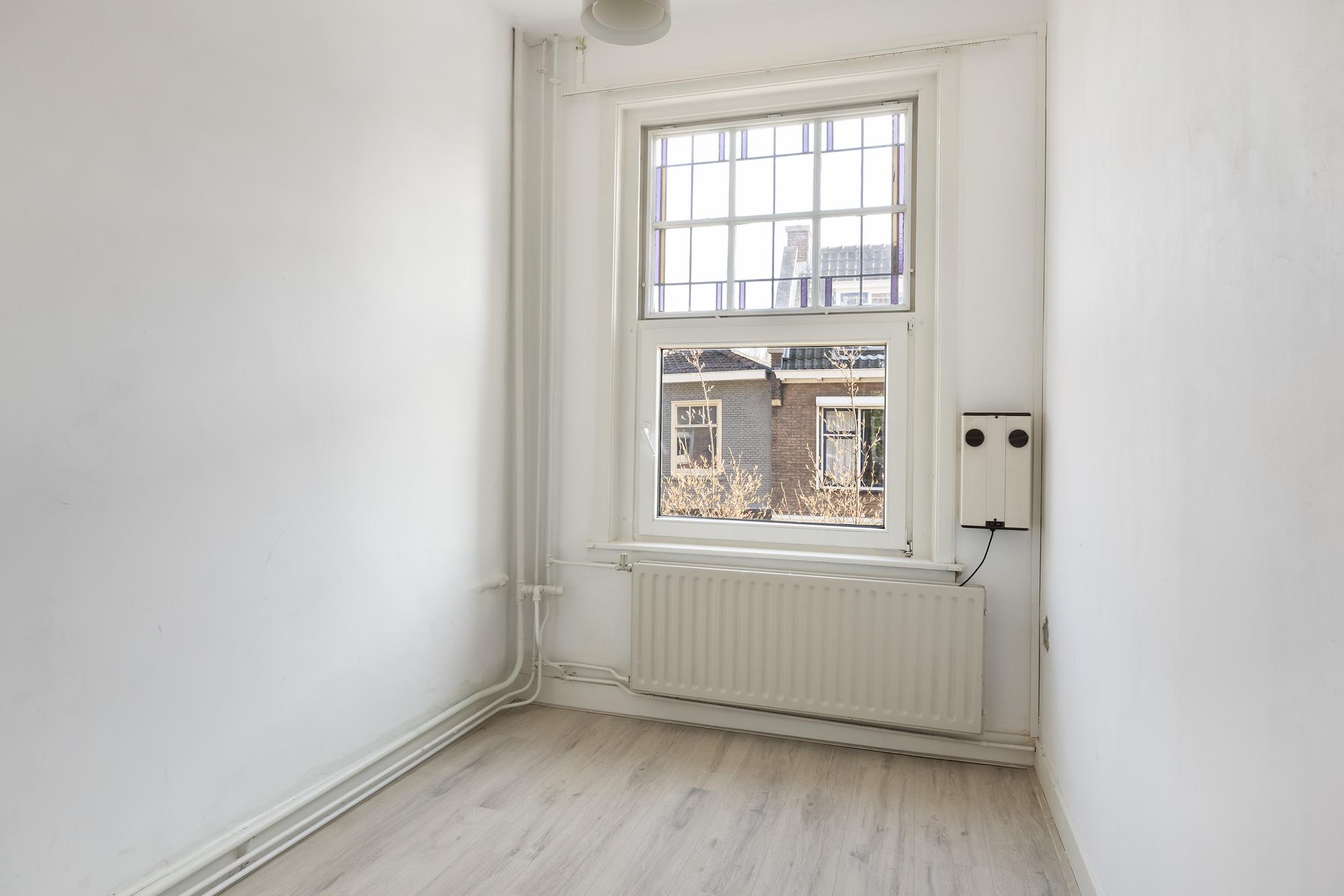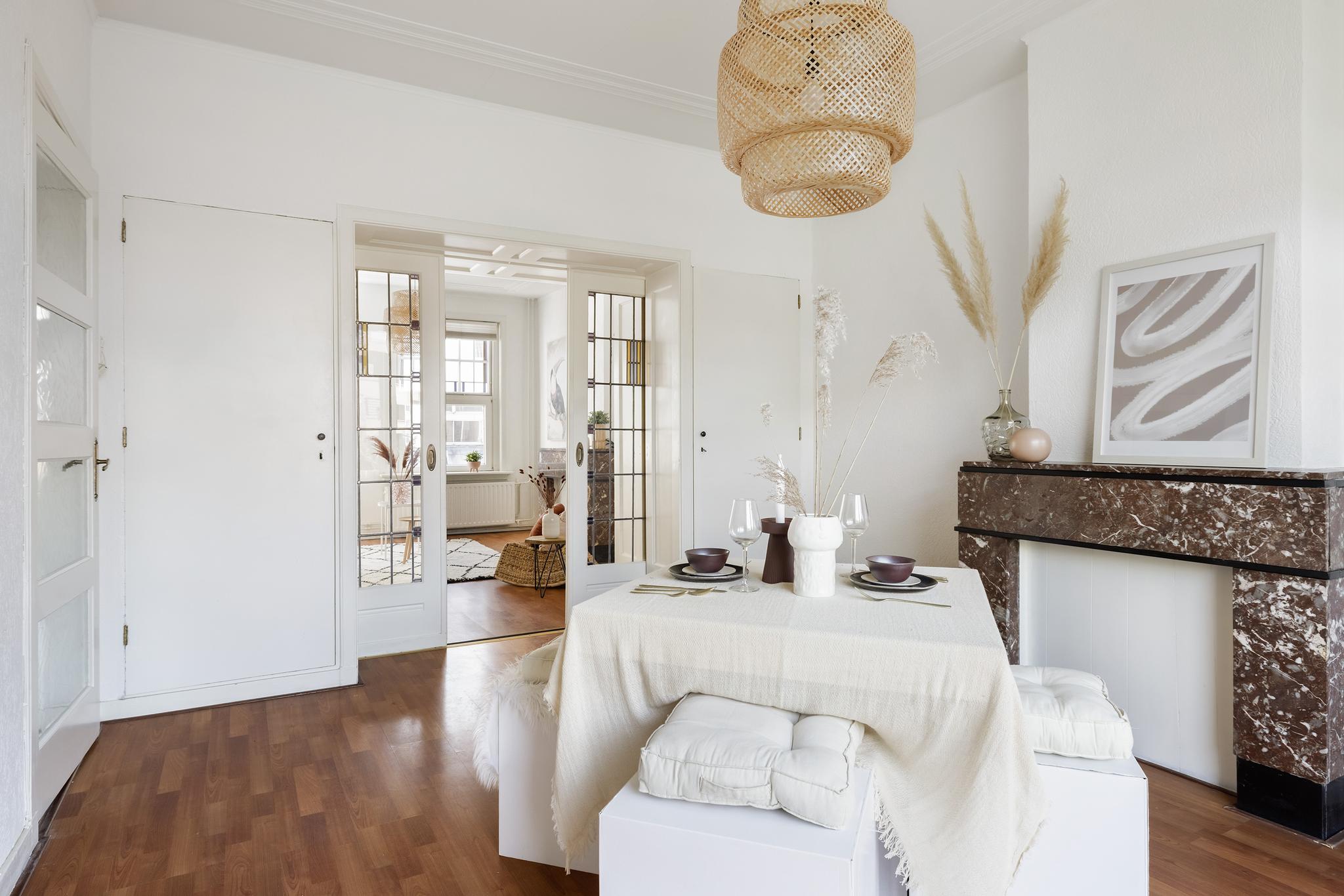 Aan de voorzijde is een heerlijke erker aanwezig en marmeren schouw, glas-in-lood ramen (met voorzet ramen) en ornamenten plafond. Vloer is afgewerkt met laminaat.