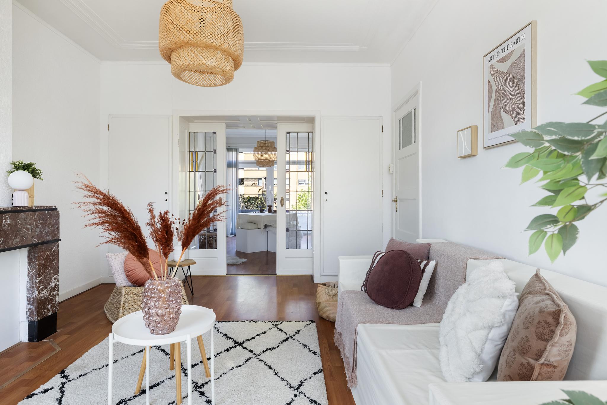 Heerlijk ruime woonkamer met en-suite scheiding met vaste kasten en grote schuifpui naar het pandbrede balkon aan de achterzijde.
