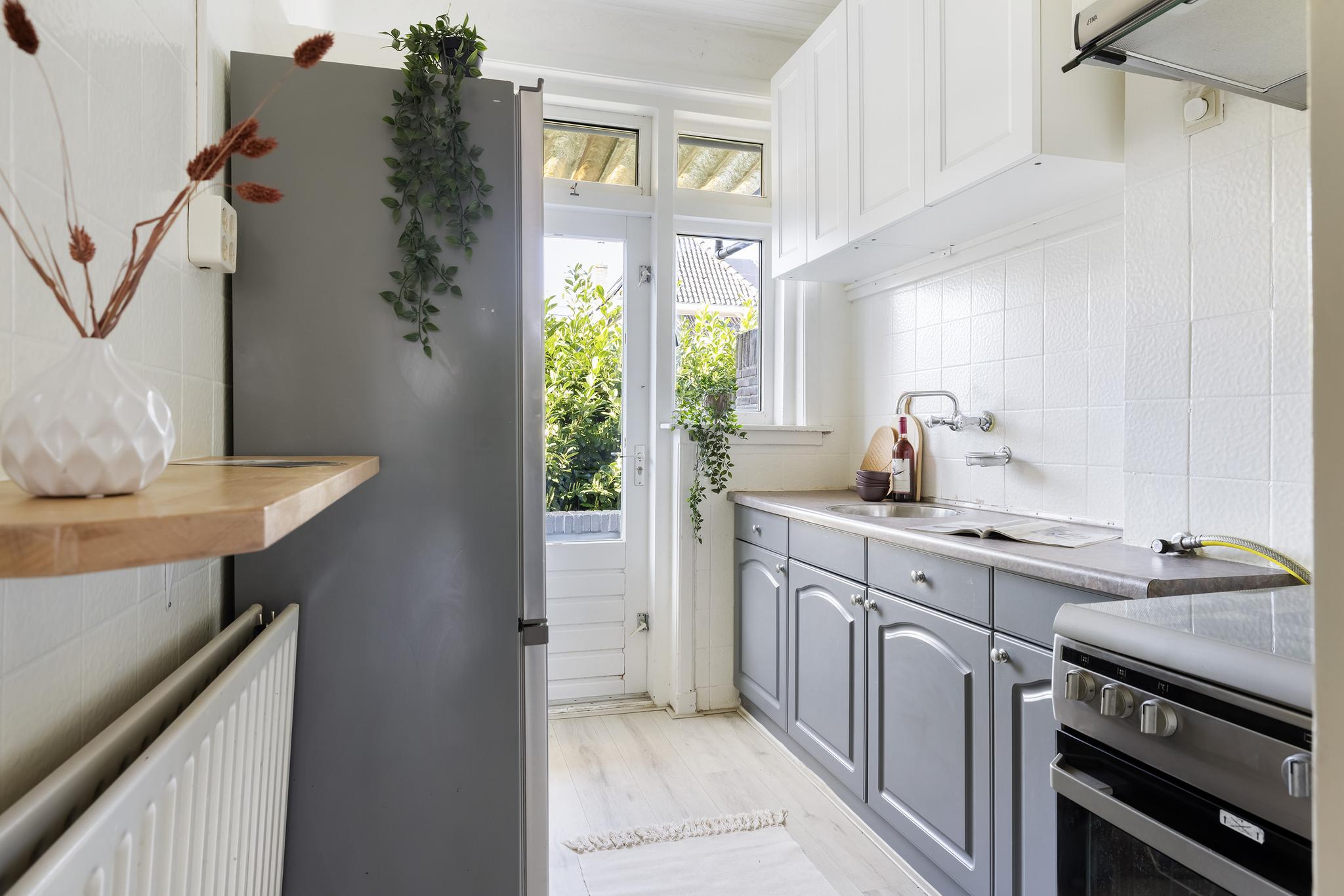 Keuken in eenvoudige wandopstelling met spoelbak, oven, 4 pits gaskookplaat, afzuiging, koelkast en vriezer, vaste kast. Ook vanuit de keuken kun je naar het balkon. Er is een optie om de (draag) muur tussen keuken en woonkamer te verwijderen waardoor een grote keuken te maken is.