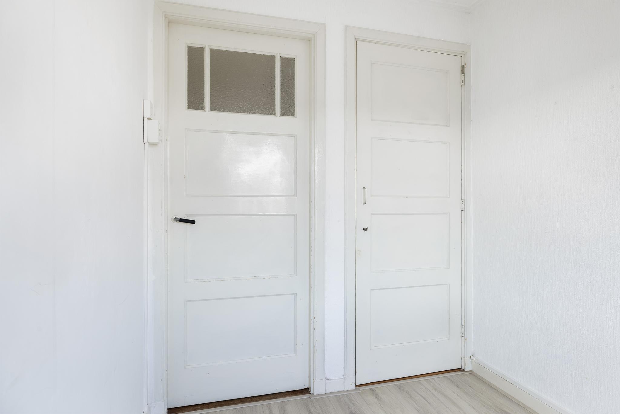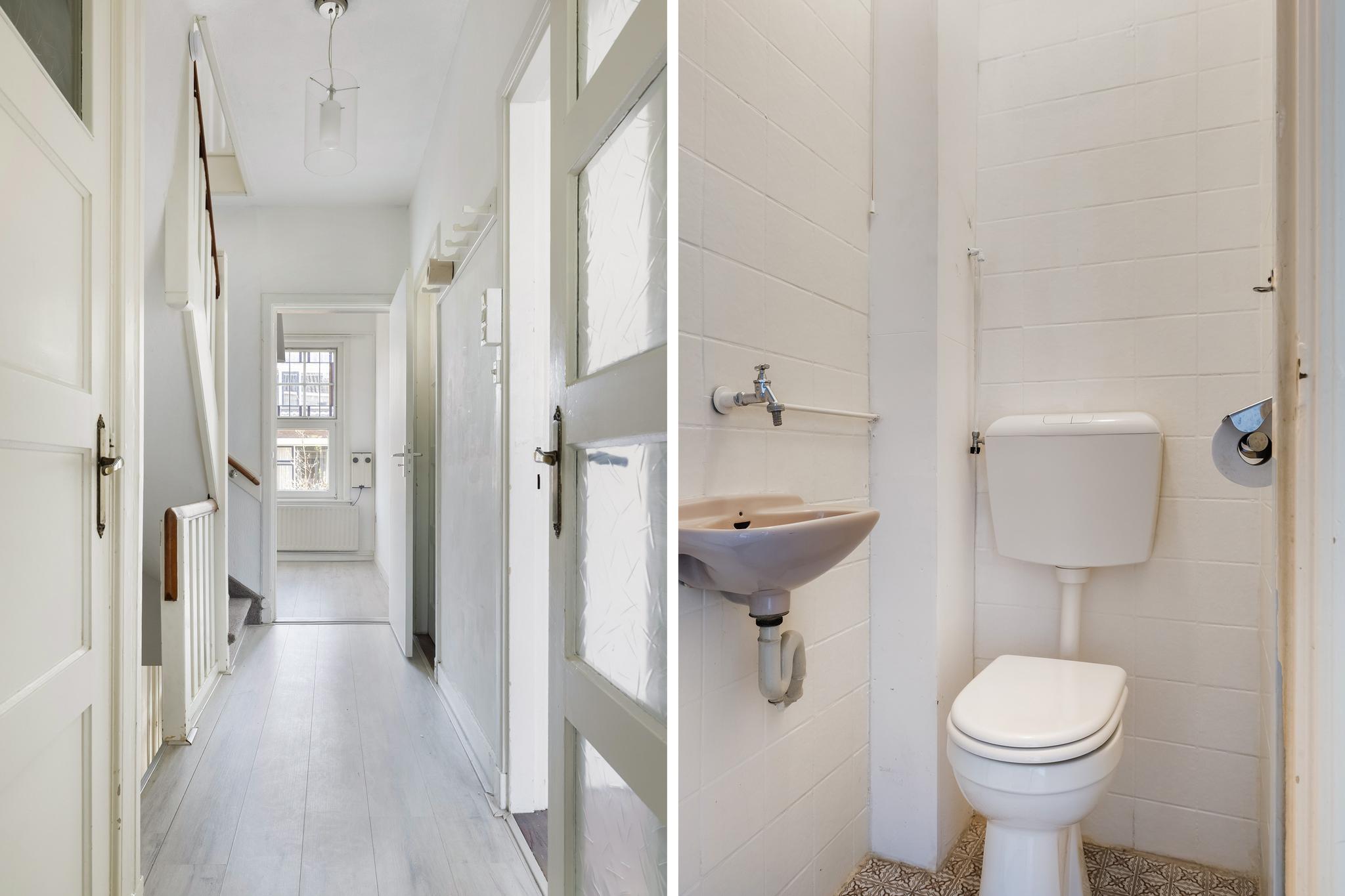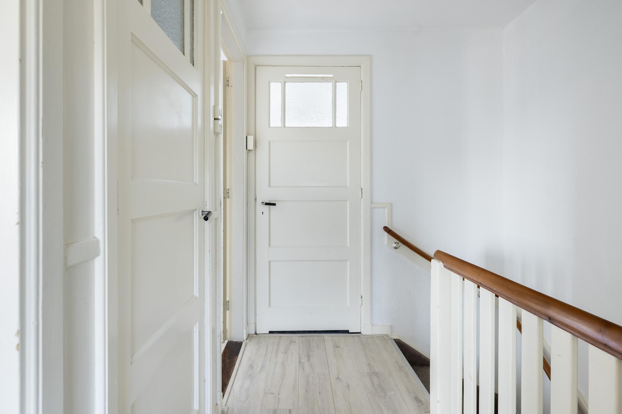 Hal met trapopgang naar de tweede verdieping, toegang tot de keuken, het toilet, de woonkamer en extra zij- kamer.