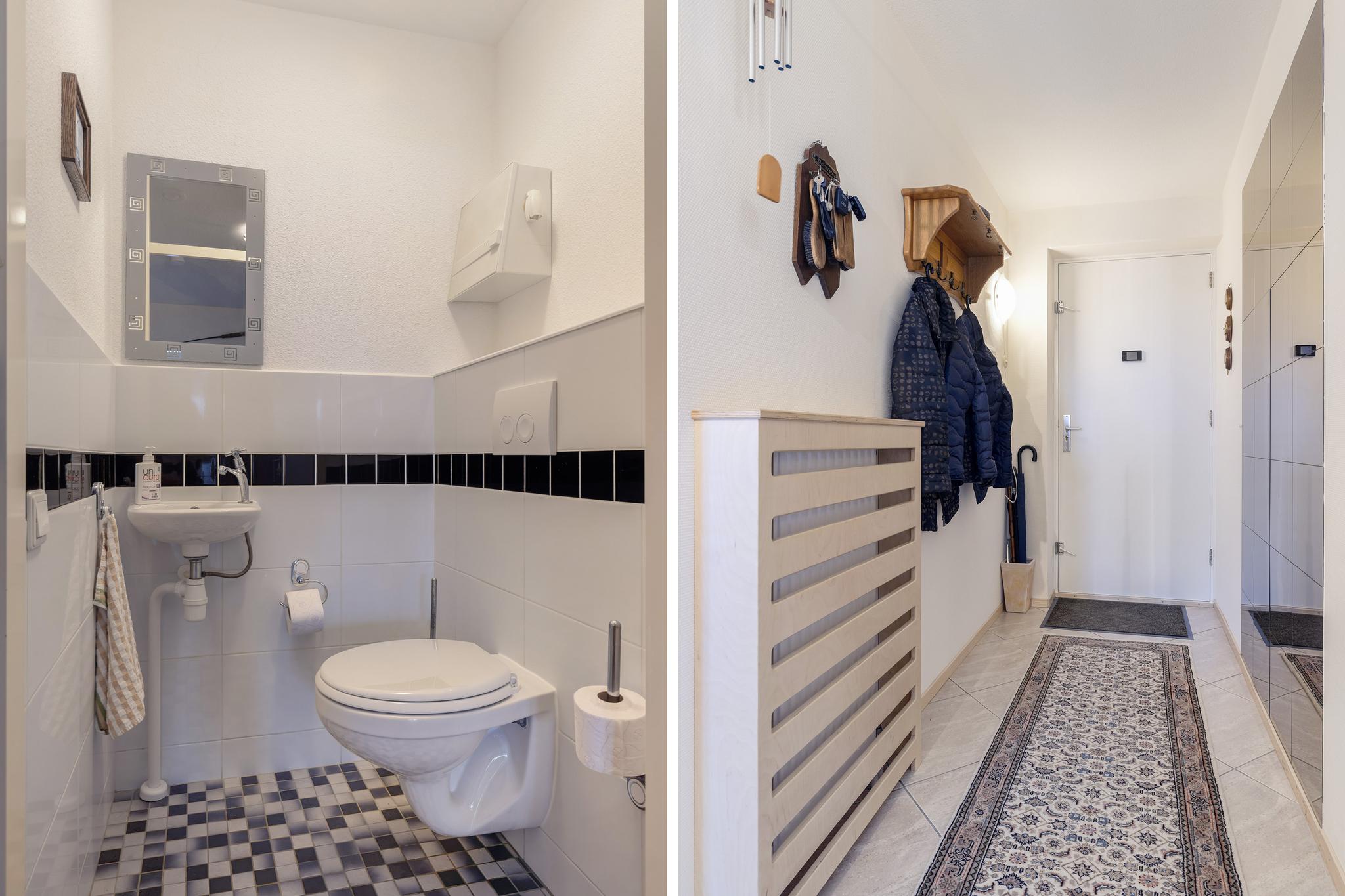 Toilet, vrijhangend met fonteintje en gedeeltelijk betegelde wanden, de vloer is in 2018 opgehoogd en voorzien van nieuwe afwerking.