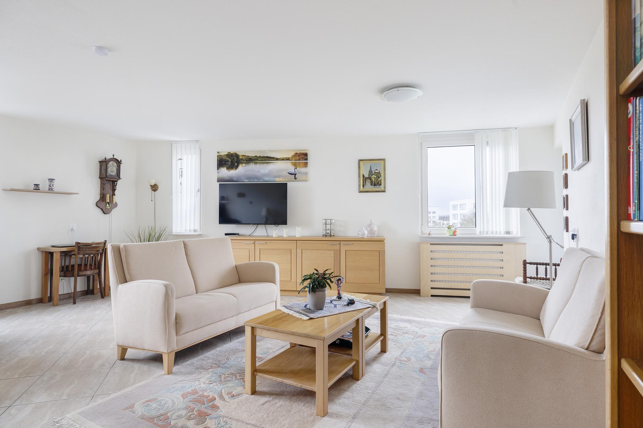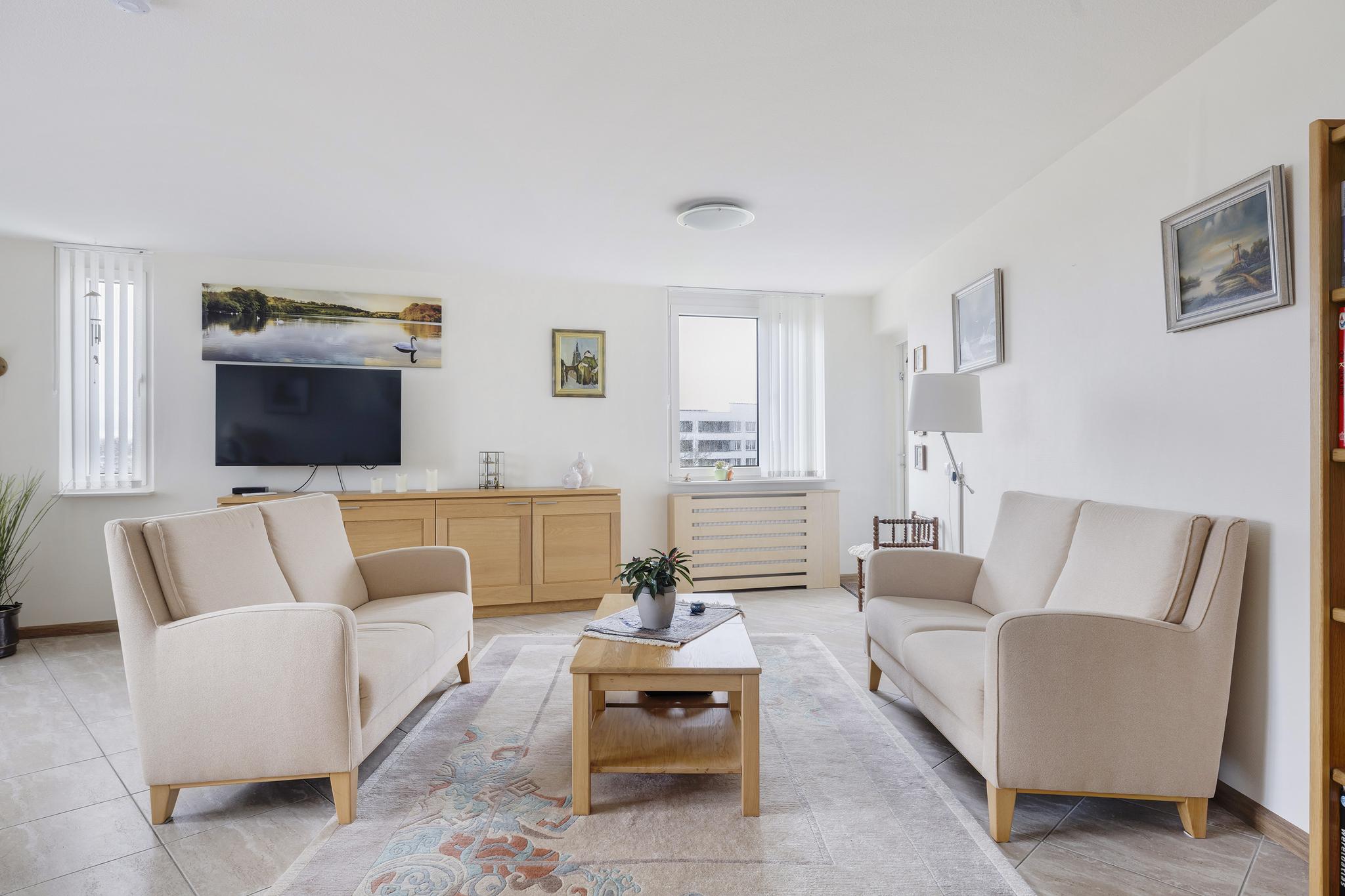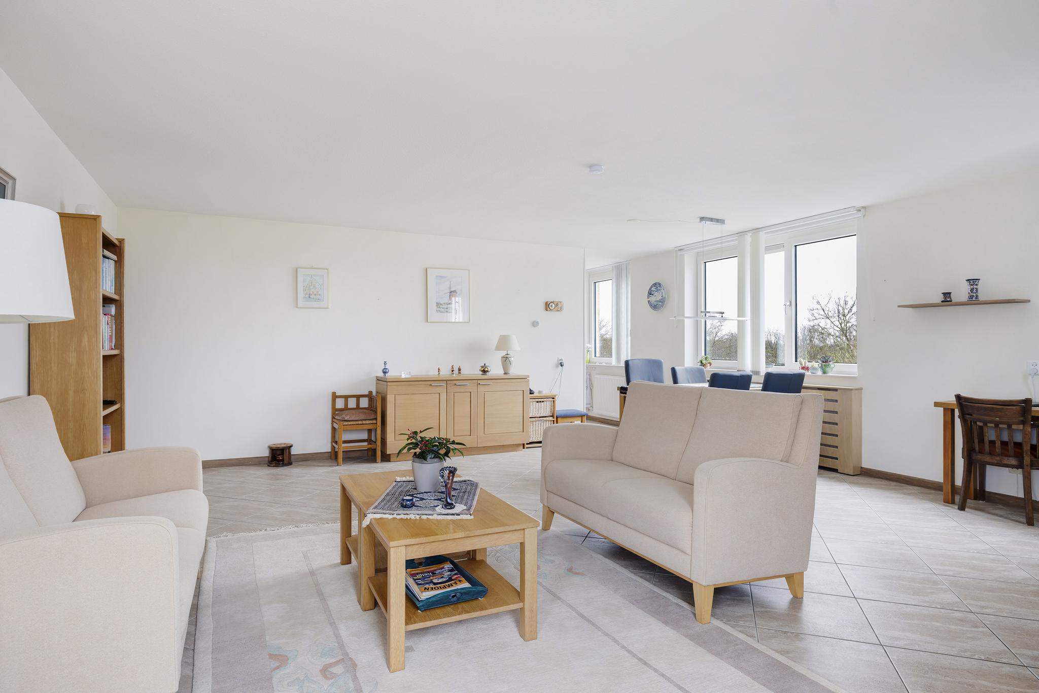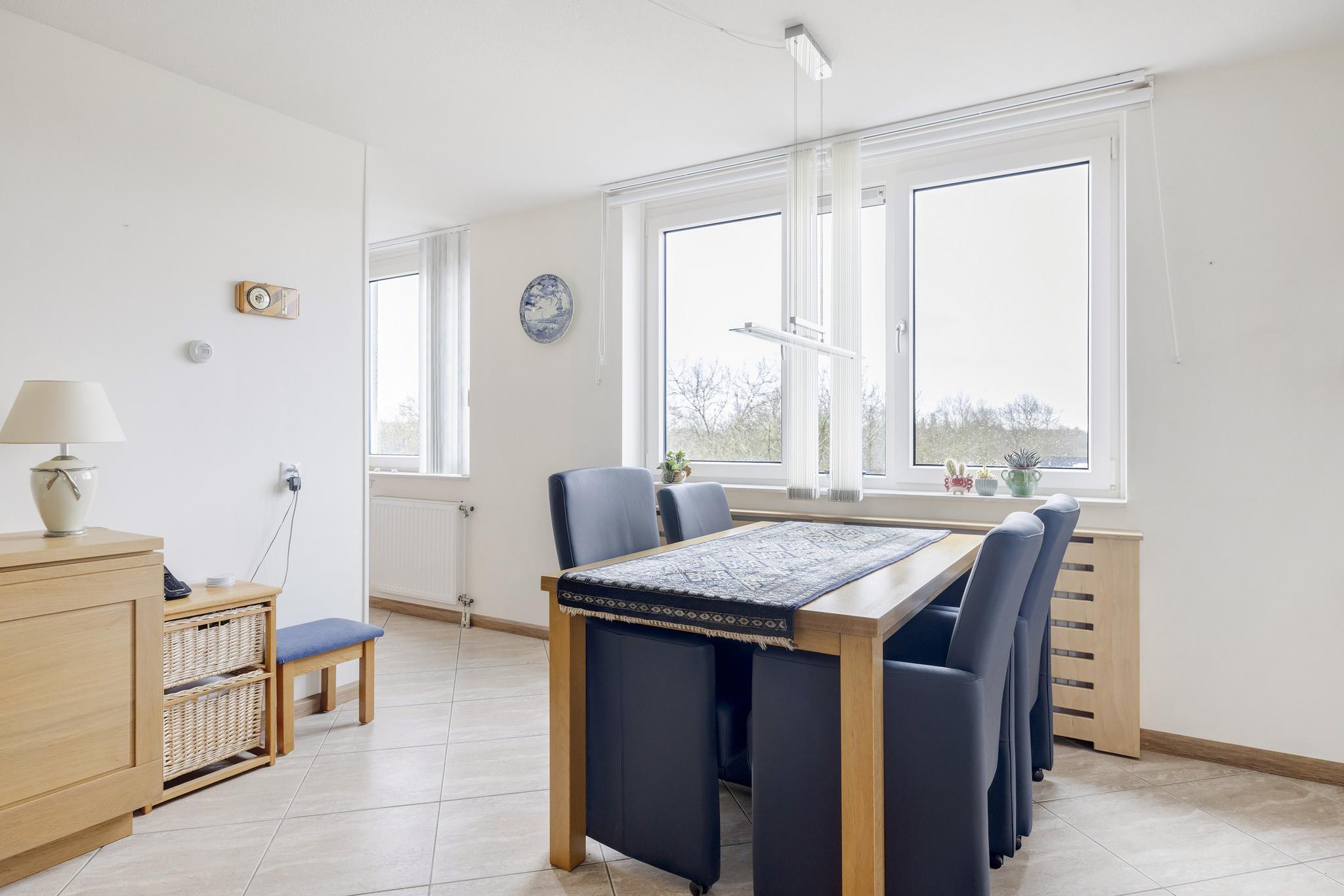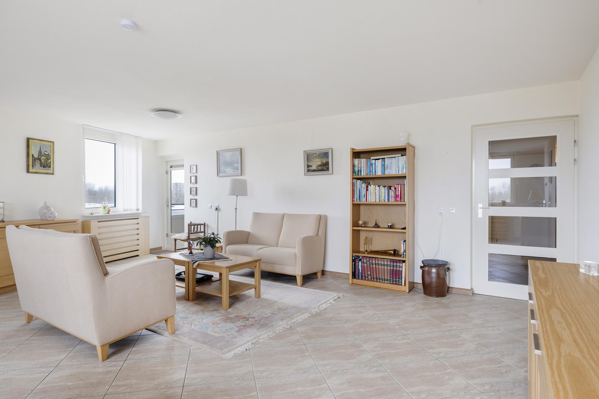 Heerlijk grote woonkamer, door de ligging op de 4de verdieping ook een mooi vrij uitzicht. Alle ramen van de woonkamer en de keuken zijn vervangen door kunststof en dubbel glas. Via een houten deur is er toegang tot het ruime balkon.