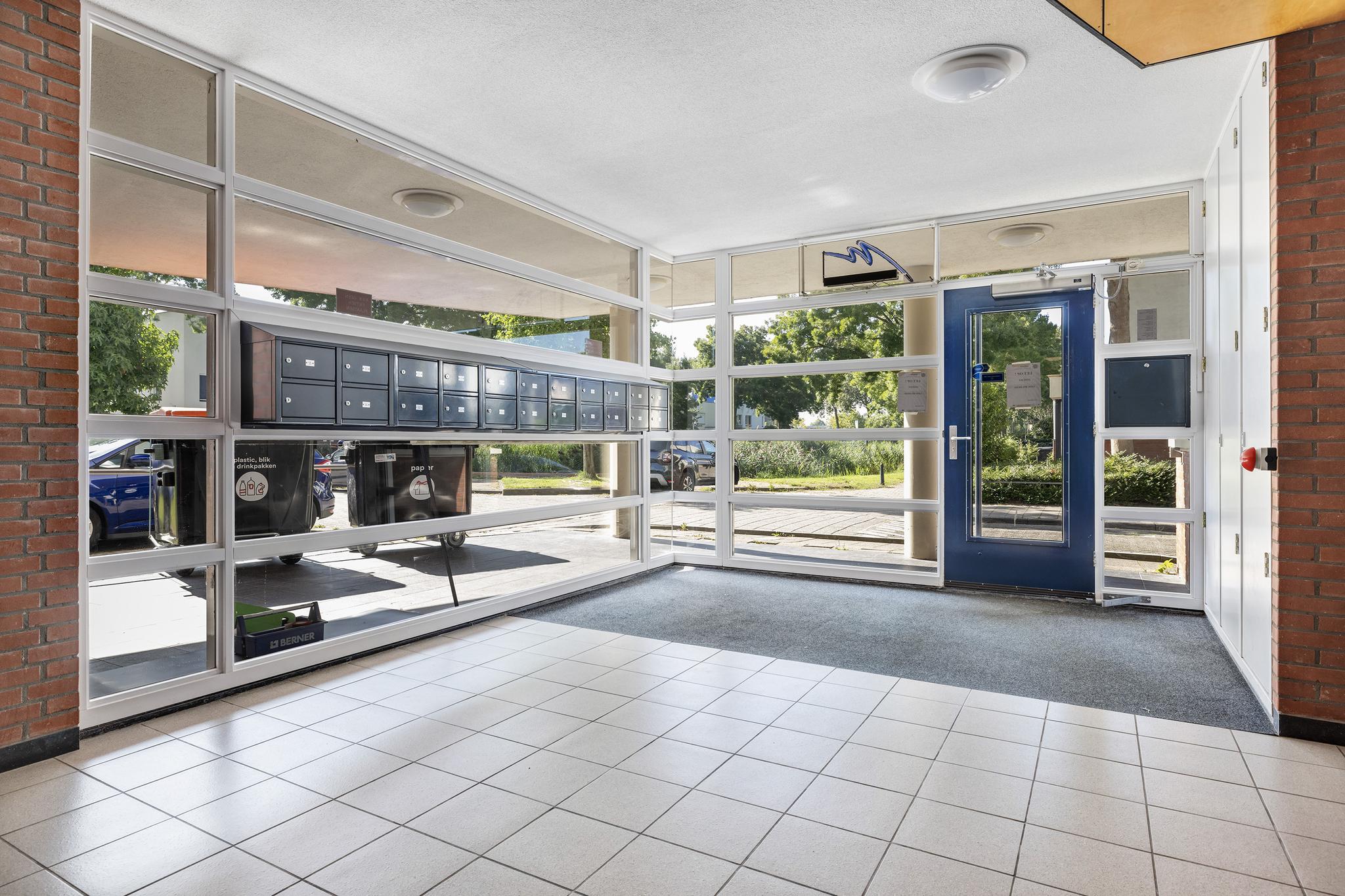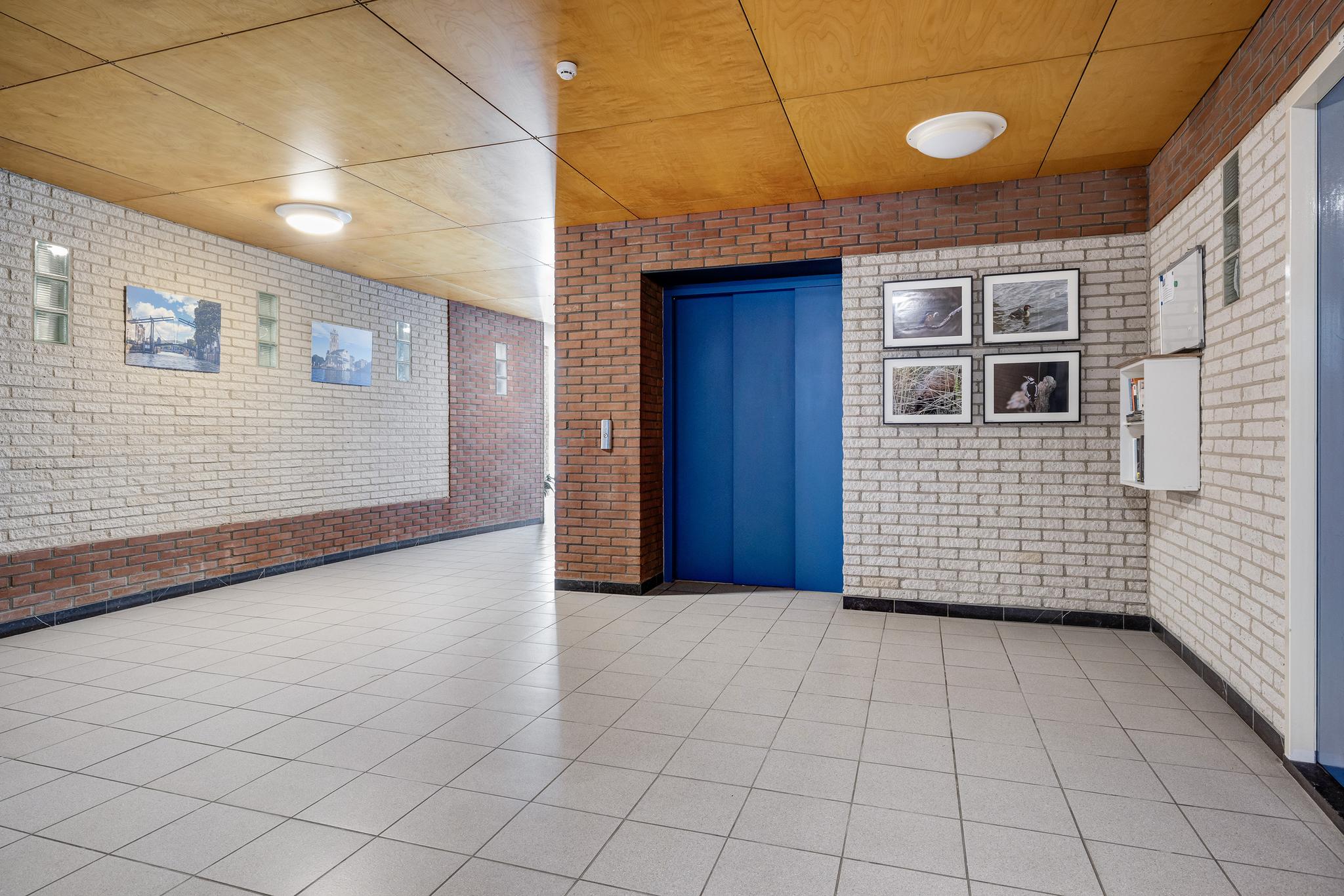 Afgesloten entree met brievenbussen en bellen tableau, trapopgang, toegang tot de bergingen en lift naar de verdiepingen.