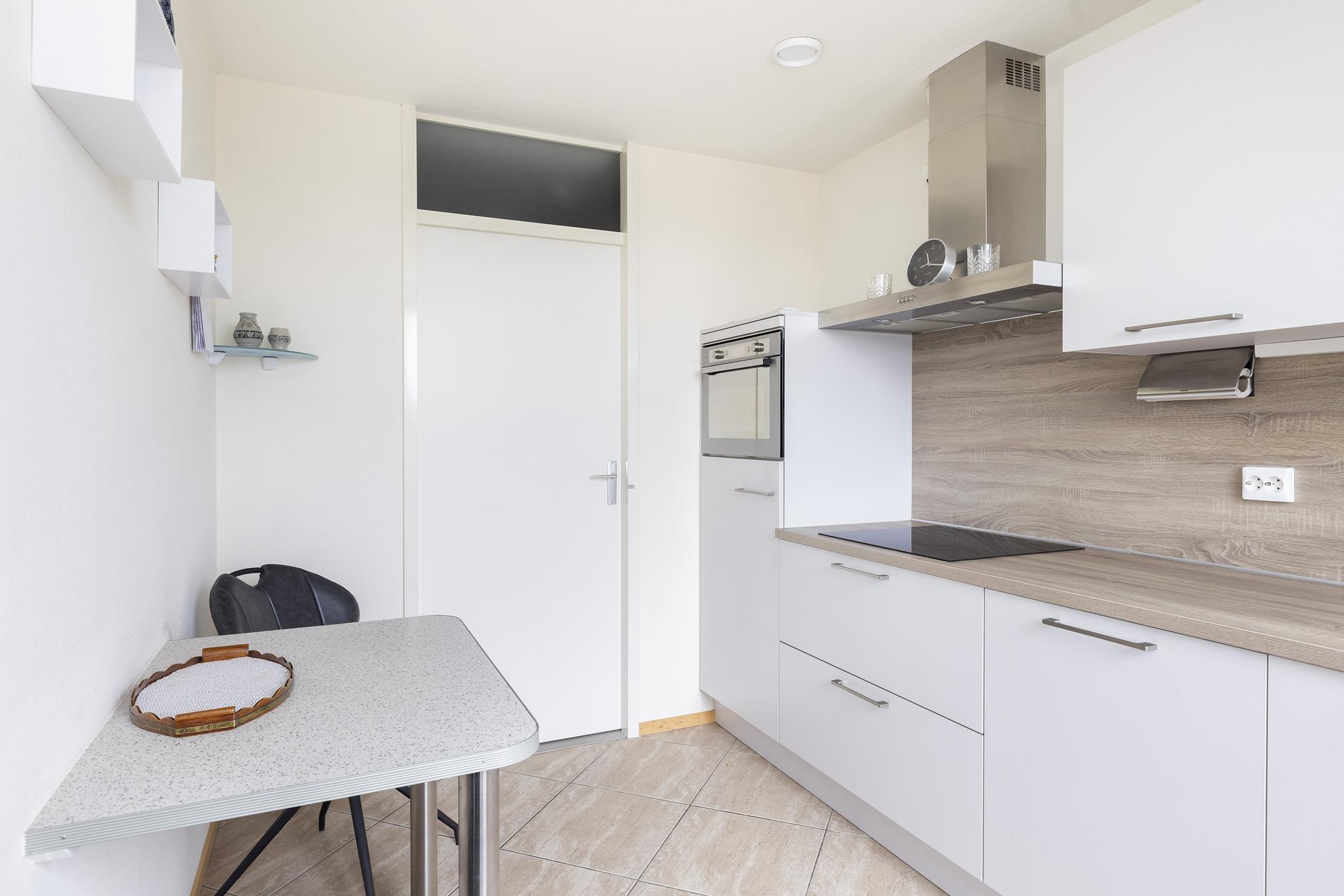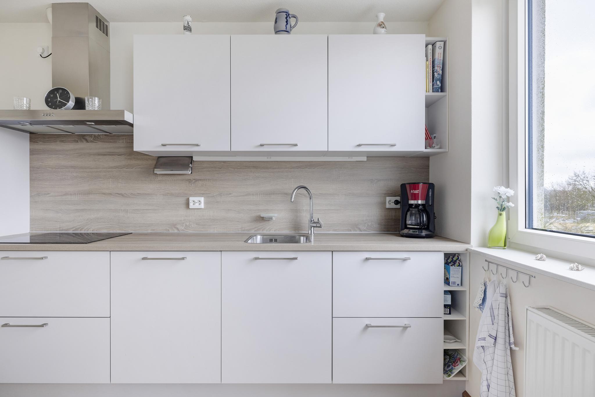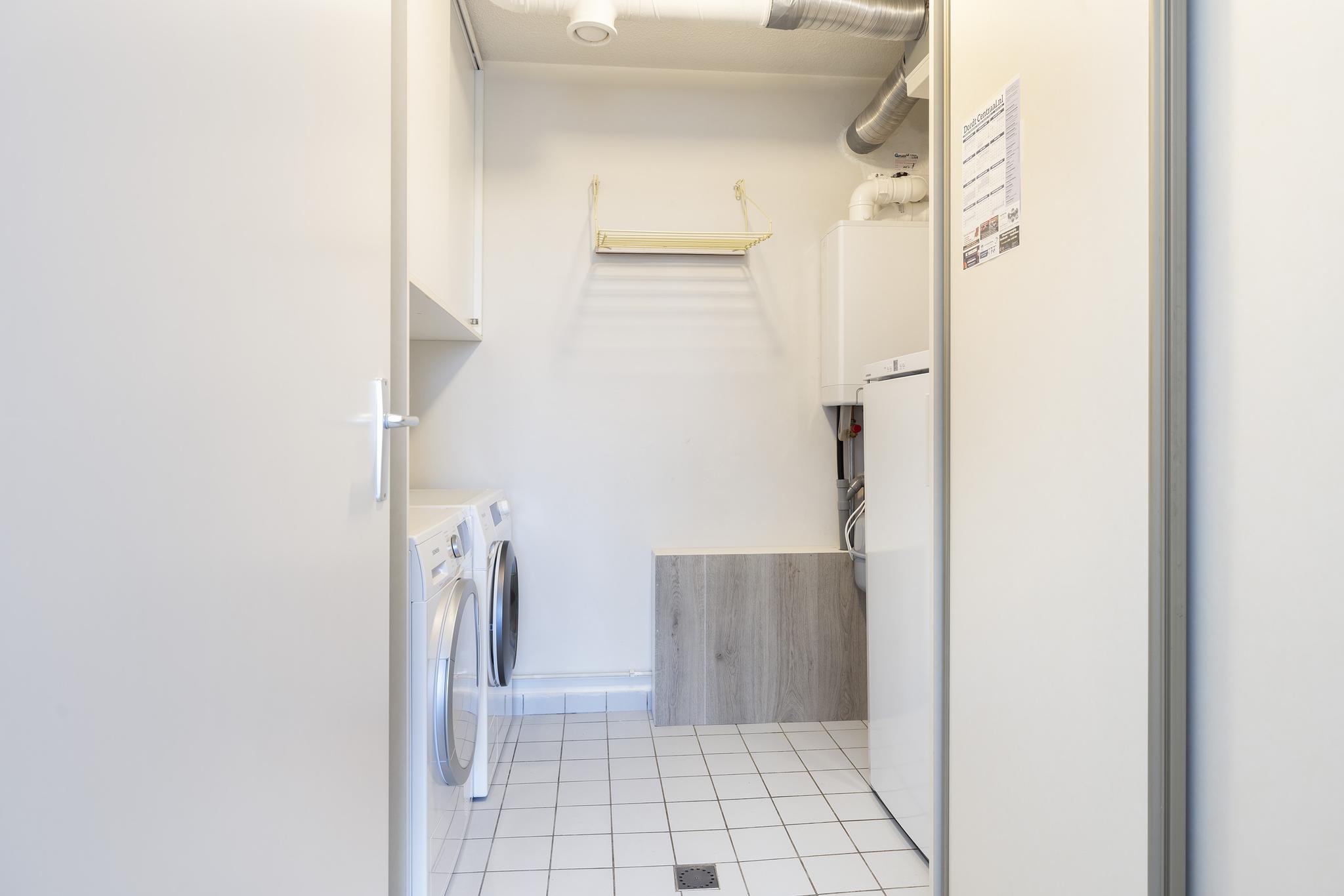 Keuken in ruime wandopstelling met spoelbak, afzuigkap, inductie kookplaat, koelkast, combimagnetron, vaatwasser en deur naar de bijkeuken. Super ruime bijkeuken met meer dan voldoende ruimte voor de was apparatuur, de mechanische ventilatie (bouwjaar 2018) en de CV ketel (merk Intergas HRE, bouwjaar augustus 2023). Naast de apparatuur is er voldoende bergruimte aanwezig.