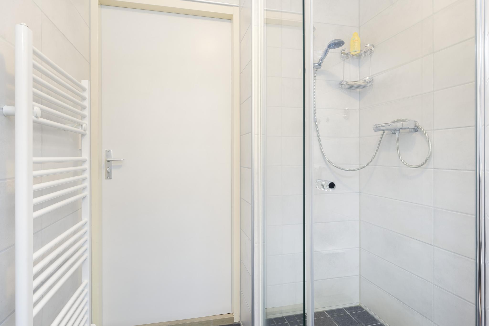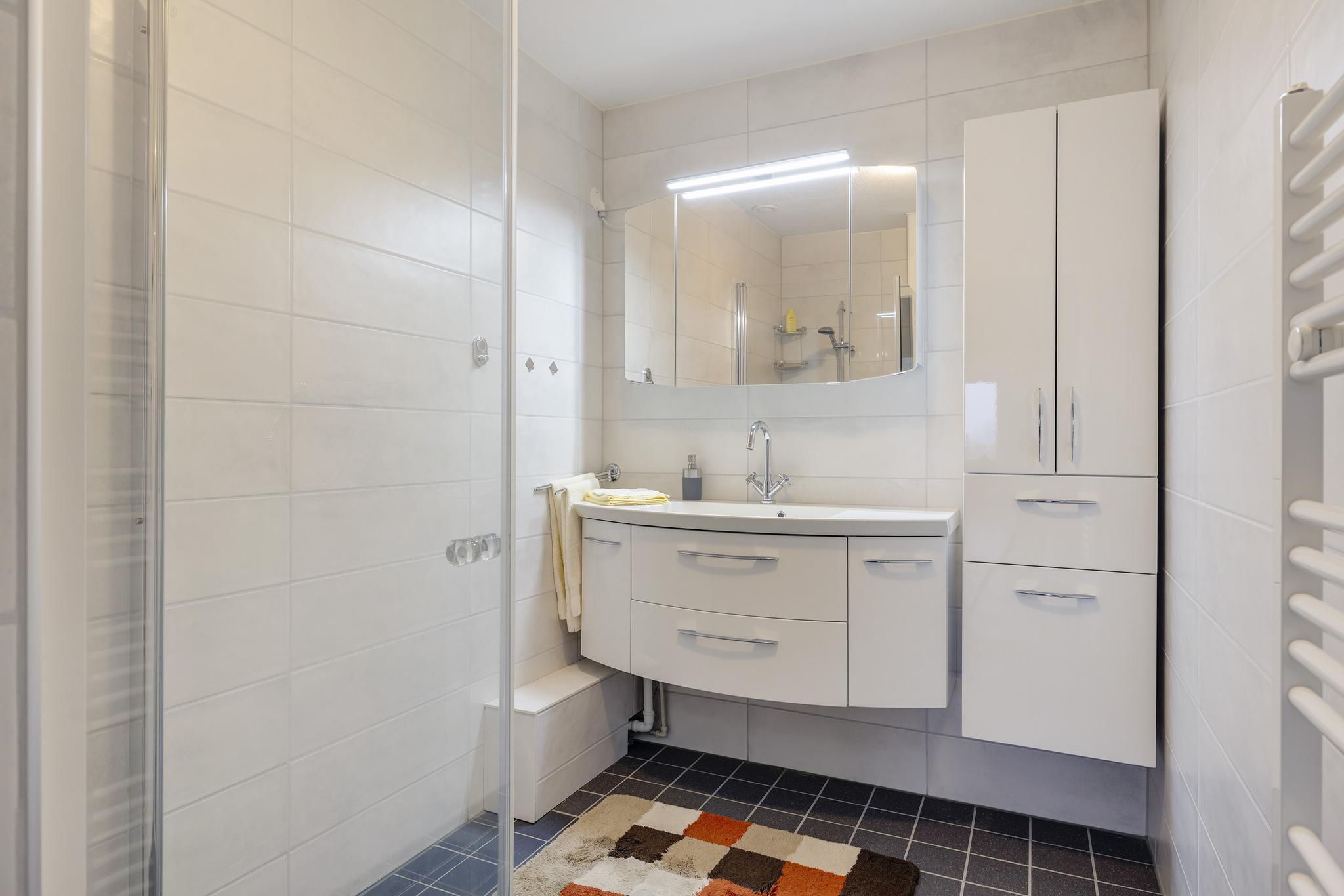 Inpandige badkamer met ruime inloopdouche, wastafel in een ombouw met veel bergruimte.