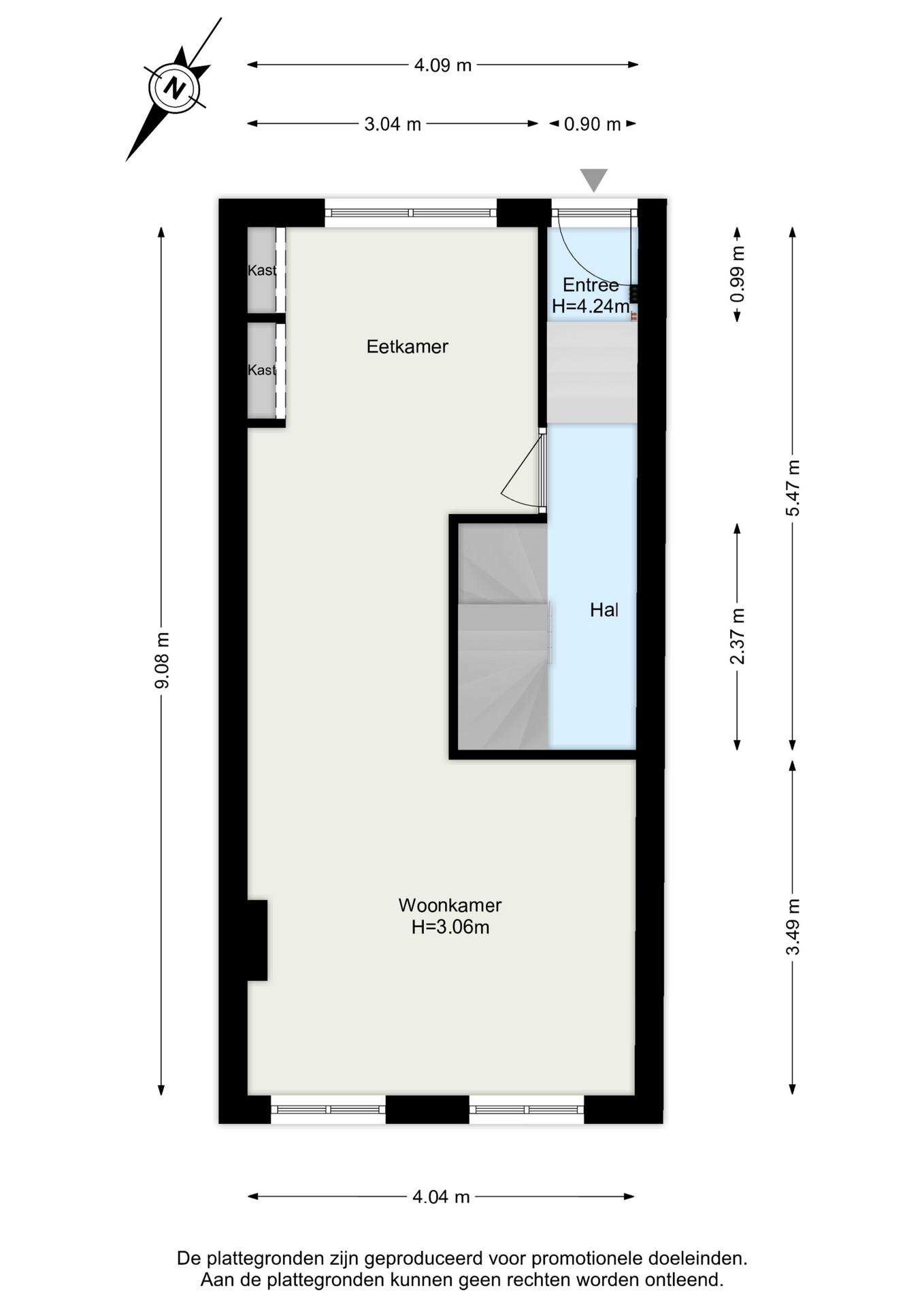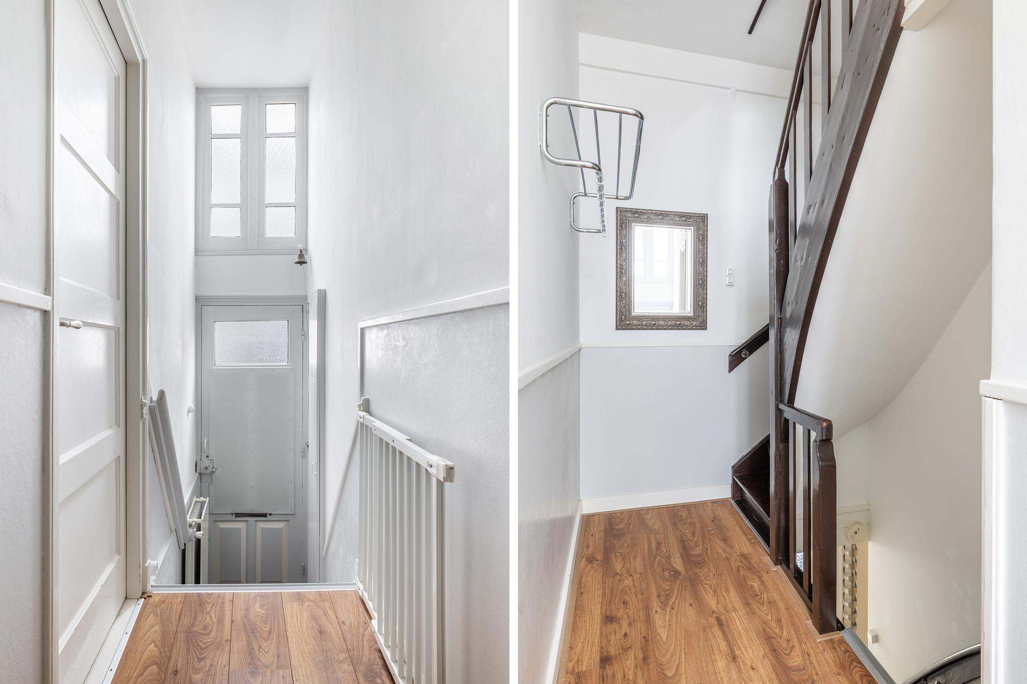 Entree met meterkast (6 groepen, 2 aardlekschakelaars, slimme meters), trapje naar hal met toegang tot de woonkamer, trap naar het souterrain en naar de verdieping.