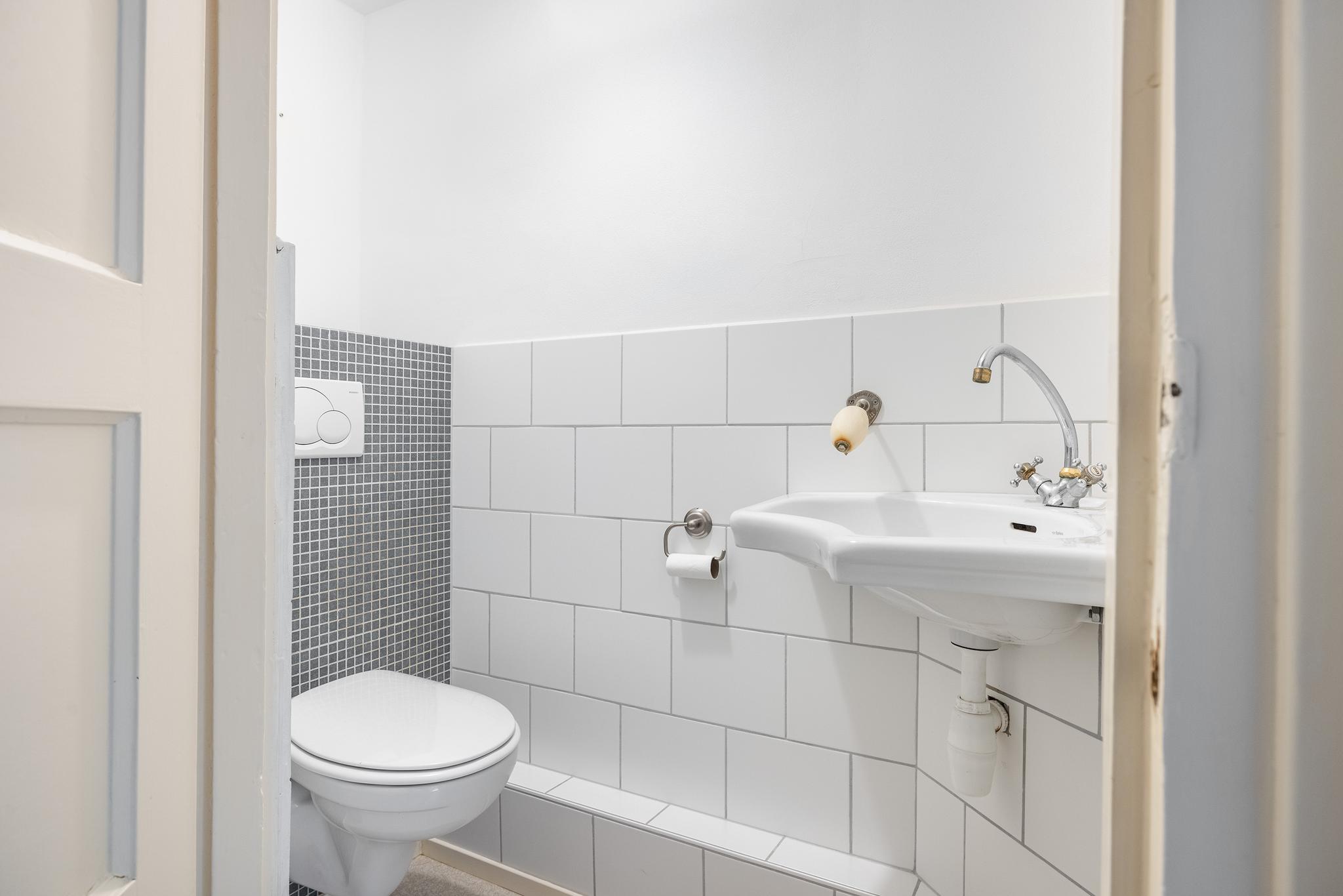 Hal met toilet (half betegeld, met fonteintje) en toegang tot de woonkeuken aan de achterkant en de inpandige berging aan voorzijde.