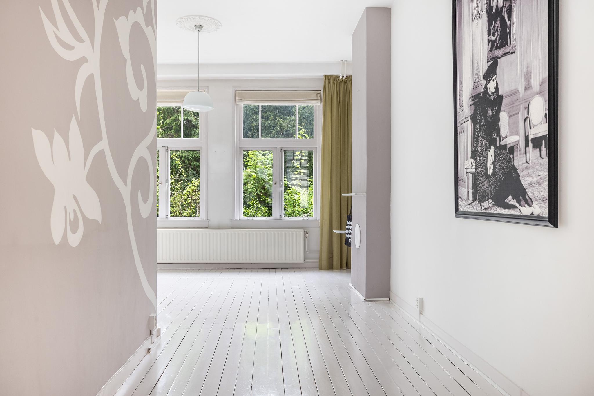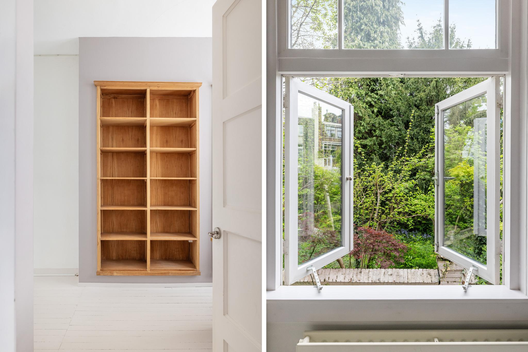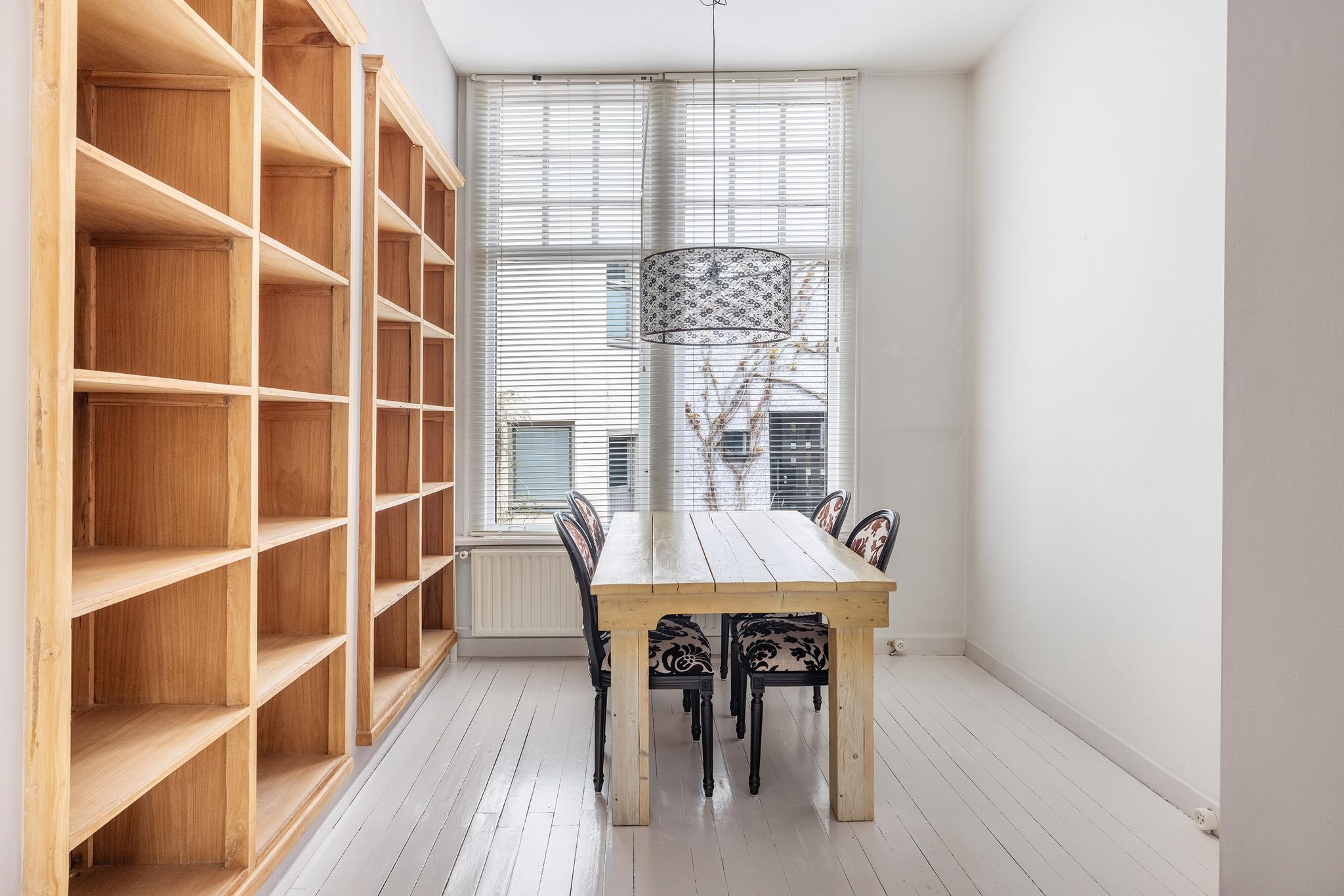 Heerlijk lichte en sfeervolle woonkamer gelegen aan achterzijde, met aan voorzijde een fijne plek voor een eetruimte, een werkplek of een leeshoek. De vaste kast biedt in ieder geval veel ruimte om je boeken of juist je mooiste spullen en herinneringen in uit te stallen. Voorheen bevond zich in deze ruimte de keuken, de leidingen hiervoor zijn nog aanwezig zodat de keuken eenvoudig weer kan worden teruggeplaatst.