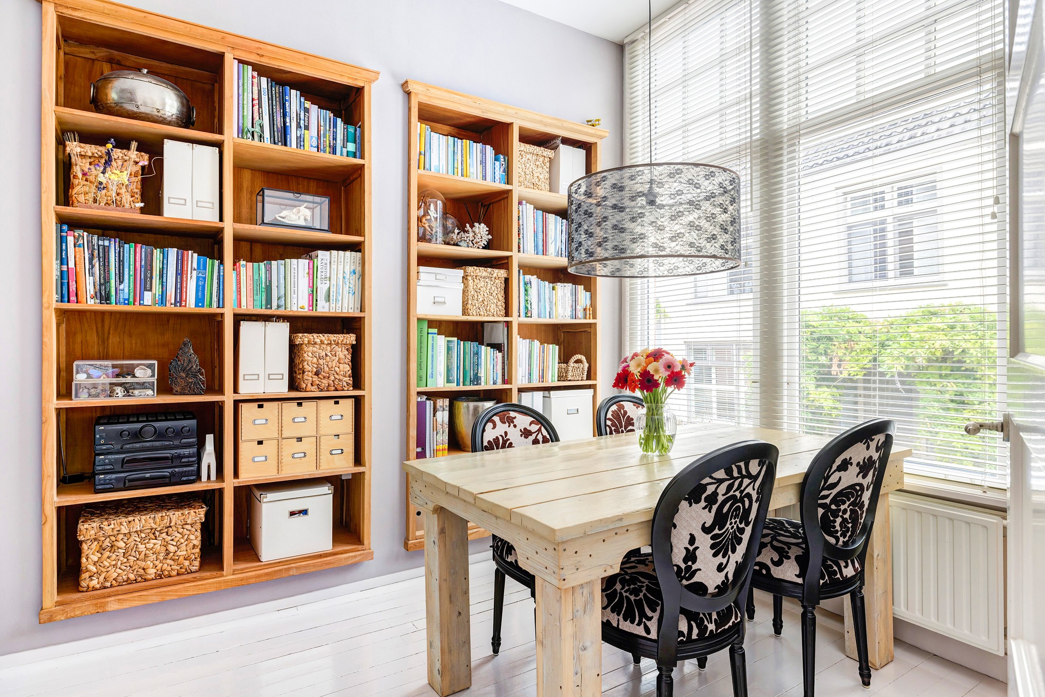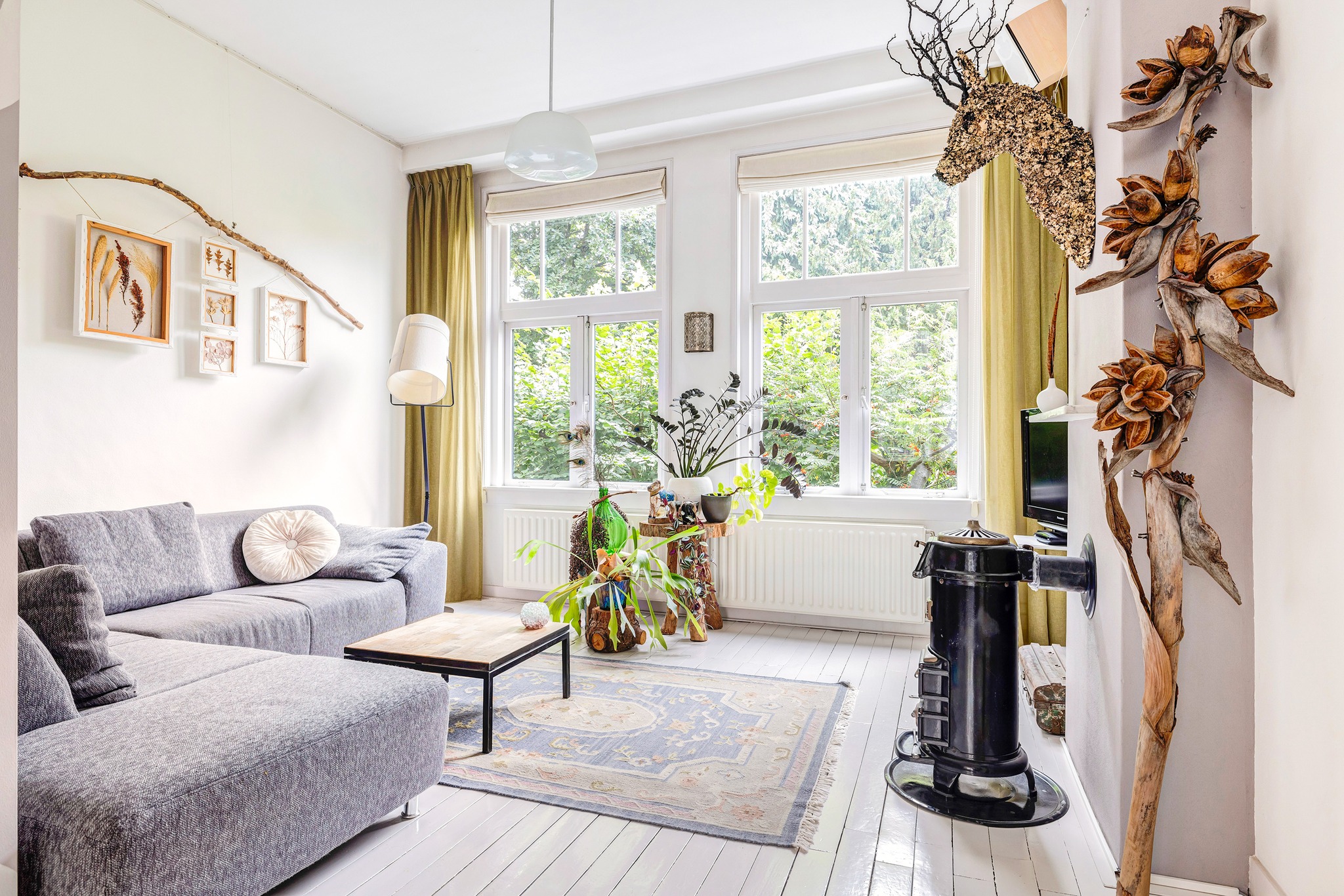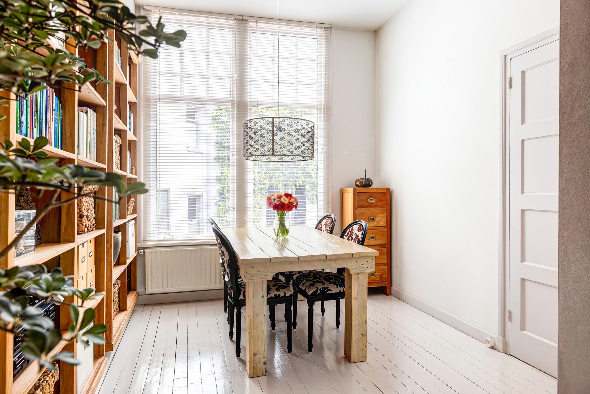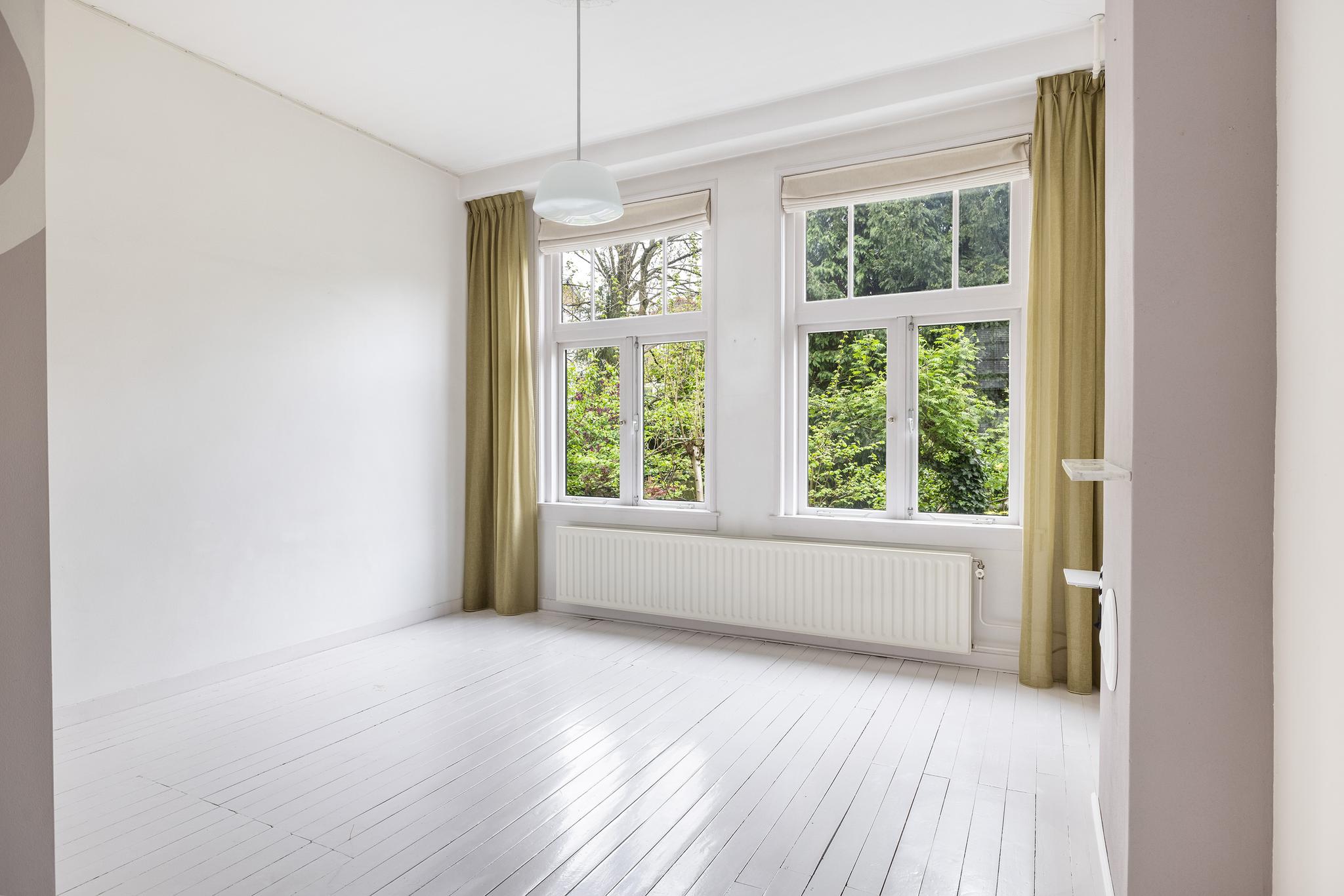 Heerlijk lichte en sfeervolle woonkamer gelegen aan achterzijde, met aan voorzijde een fijne plek voor een eetruimte, een werkplek of een leeshoek. De vaste kast biedt in ieder geval veel ruimte om je boeken of juist je mooiste spullen en herinneringen in uit te stallen. Voorheen bevond zich in deze ruimte de keuken, de leidingen hiervoor zijn nog aanwezig zodat de keuken eenvoudig weer kan worden teruggeplaatst.