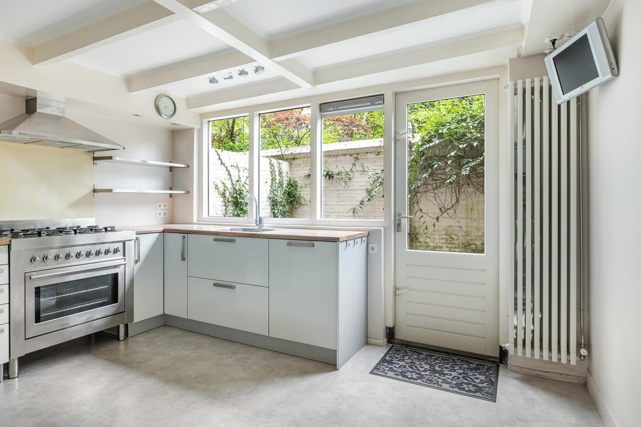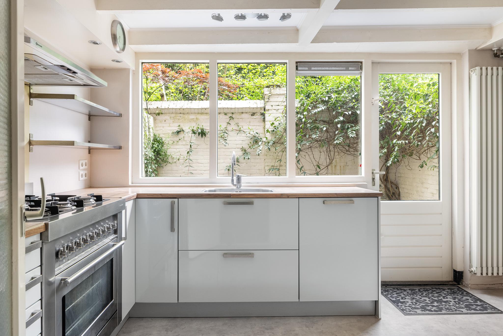 Op een paar treden vanaf straatniveau bevindt zich de ruime woonkamer met een gezellige ruimte aan de voorzijde, ideaal als eetruimte of ruime werkplek. Op deze verdieping springen direct de hoge plafonds in het oog, waardoor het licht er prachtig naar binnen schijnt. Een verdieping lager vind je de keuken, met aangrenzend een kleine, groene binnentuin; een heerlijk rustige buitenruimte midden in de stad.