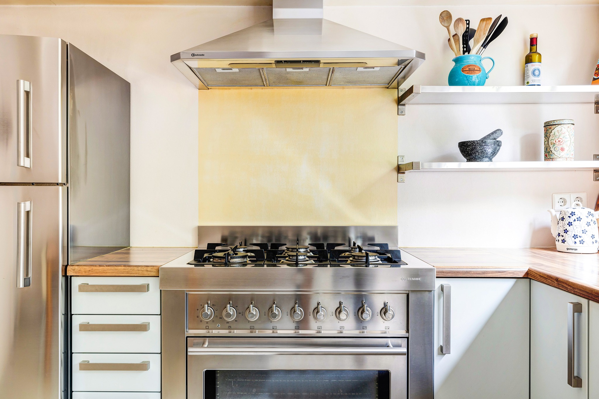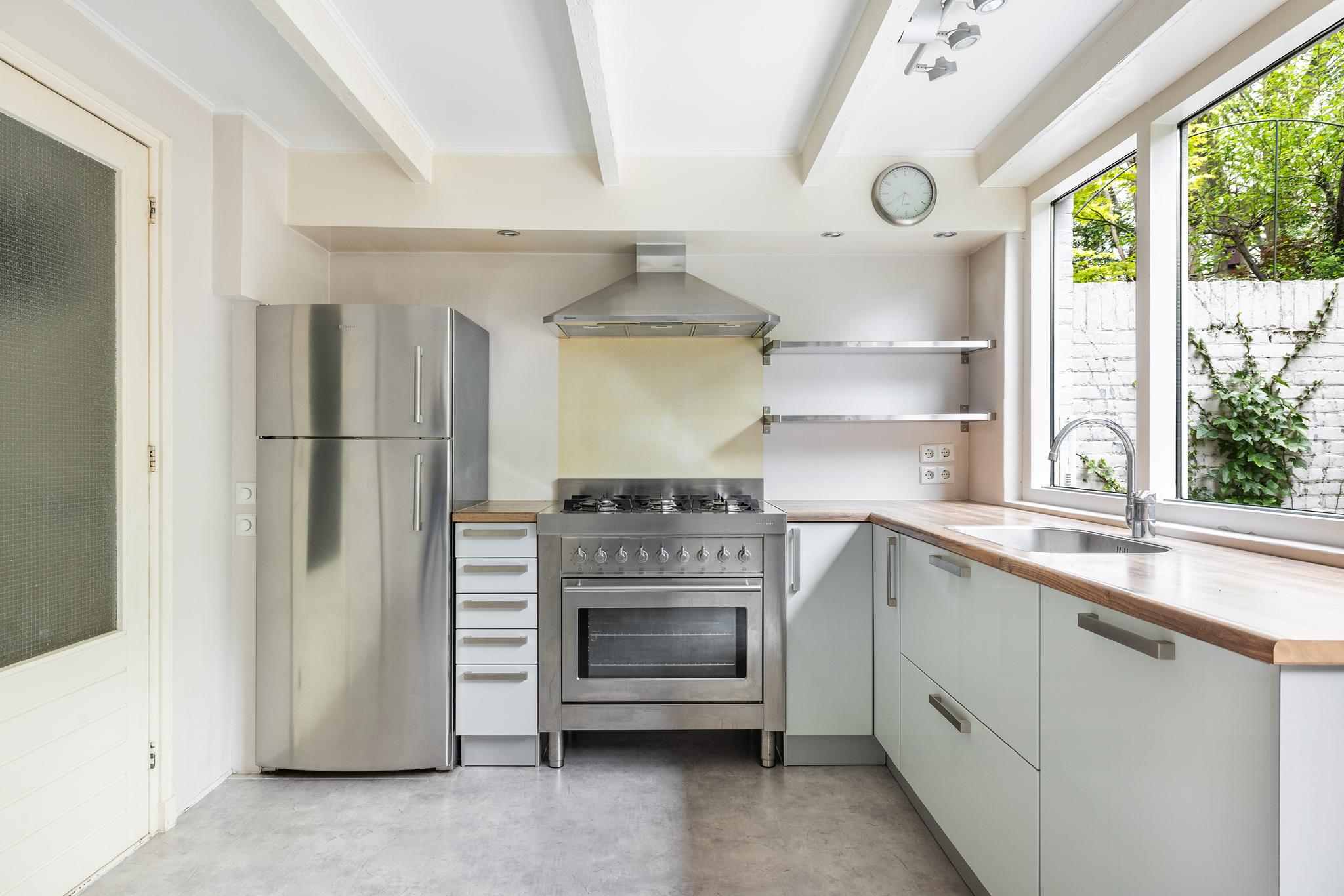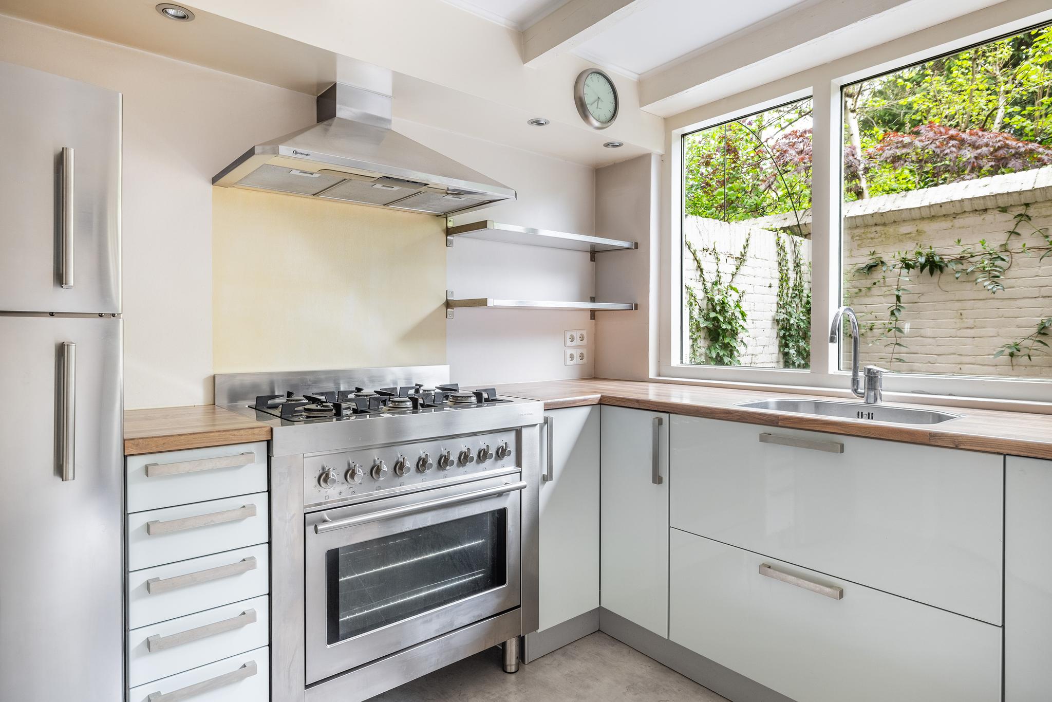 De keuken bevindt zich in een hoekopstelling en beschikt over een brede spoelbak, een kwalitatief hoogwaardige RVS koel/vries combinatie en gasfornuis (6 pit) met oven (beiden van het merk Solitaire), afzuigkap en vaatwasser.