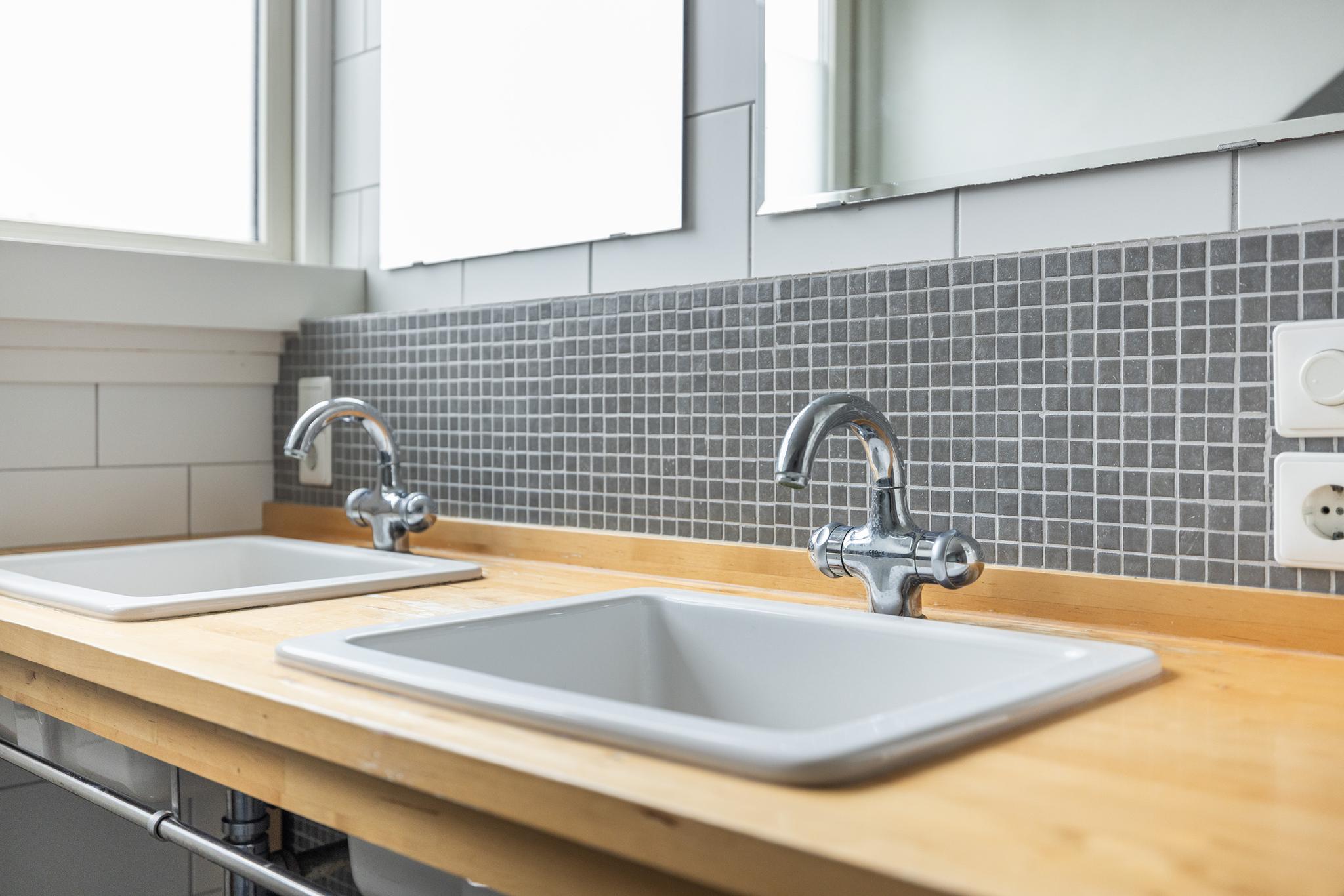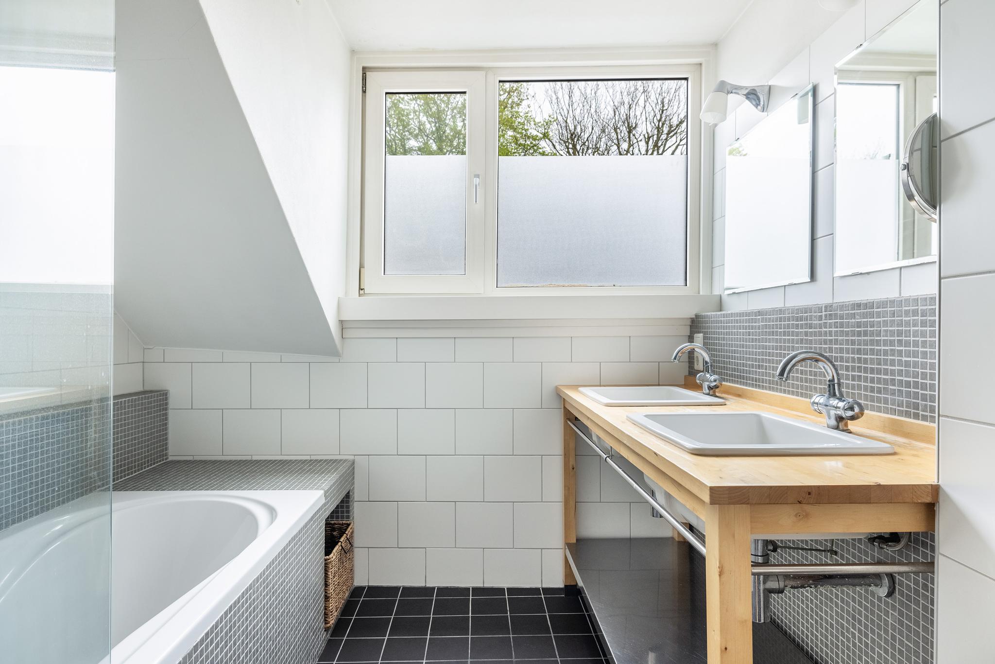 De ruime badkamer beschikt over een ligbad met douche, houten wasmeubel met dubbele waskom, twee spiegels met verwarming, toilet, elektrische vloerverwarming en mechanische ventilatie.