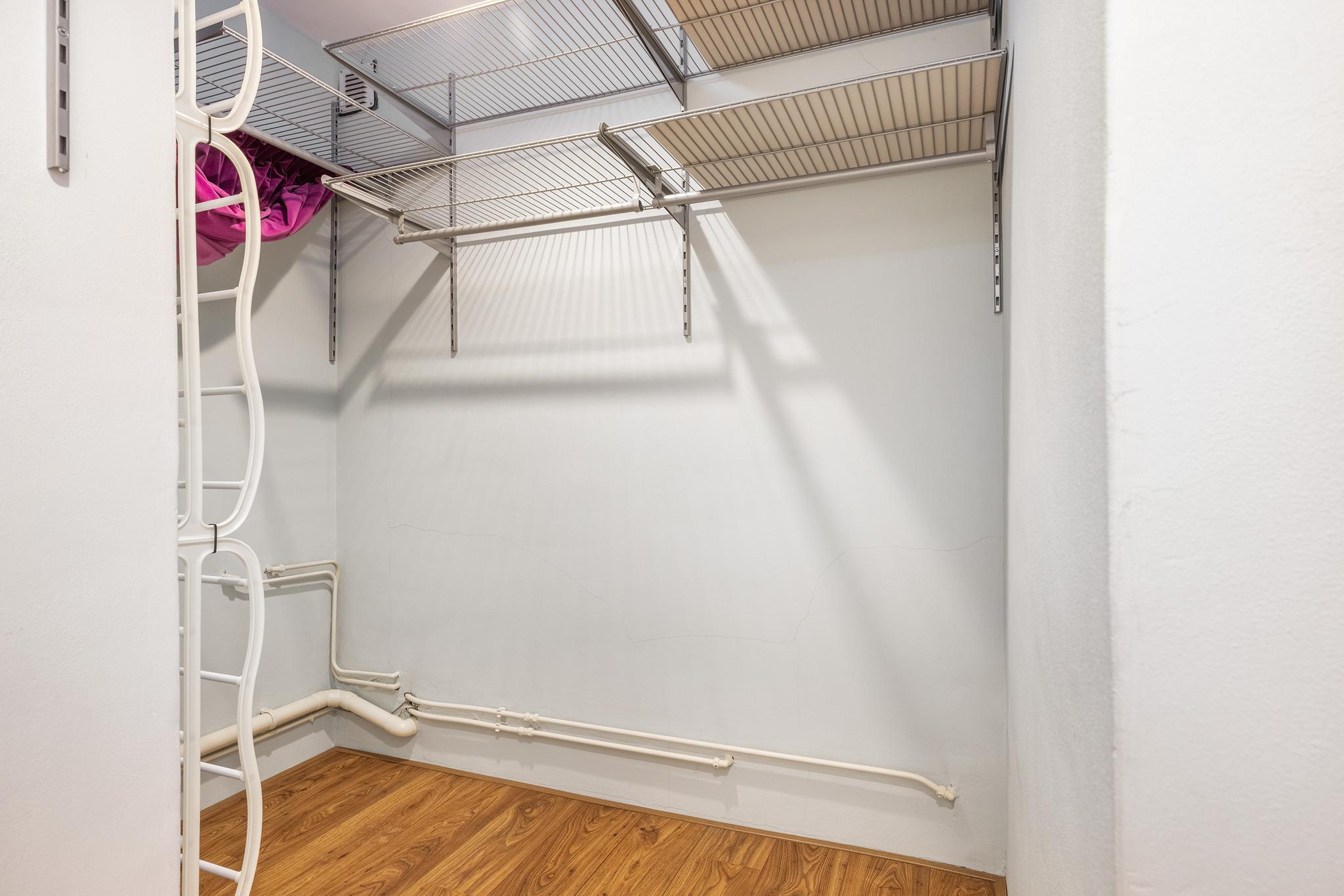 De inloopkast is inpandig, deze kamer biedt voldoende ruimte voor een uitgebreide garderobe.