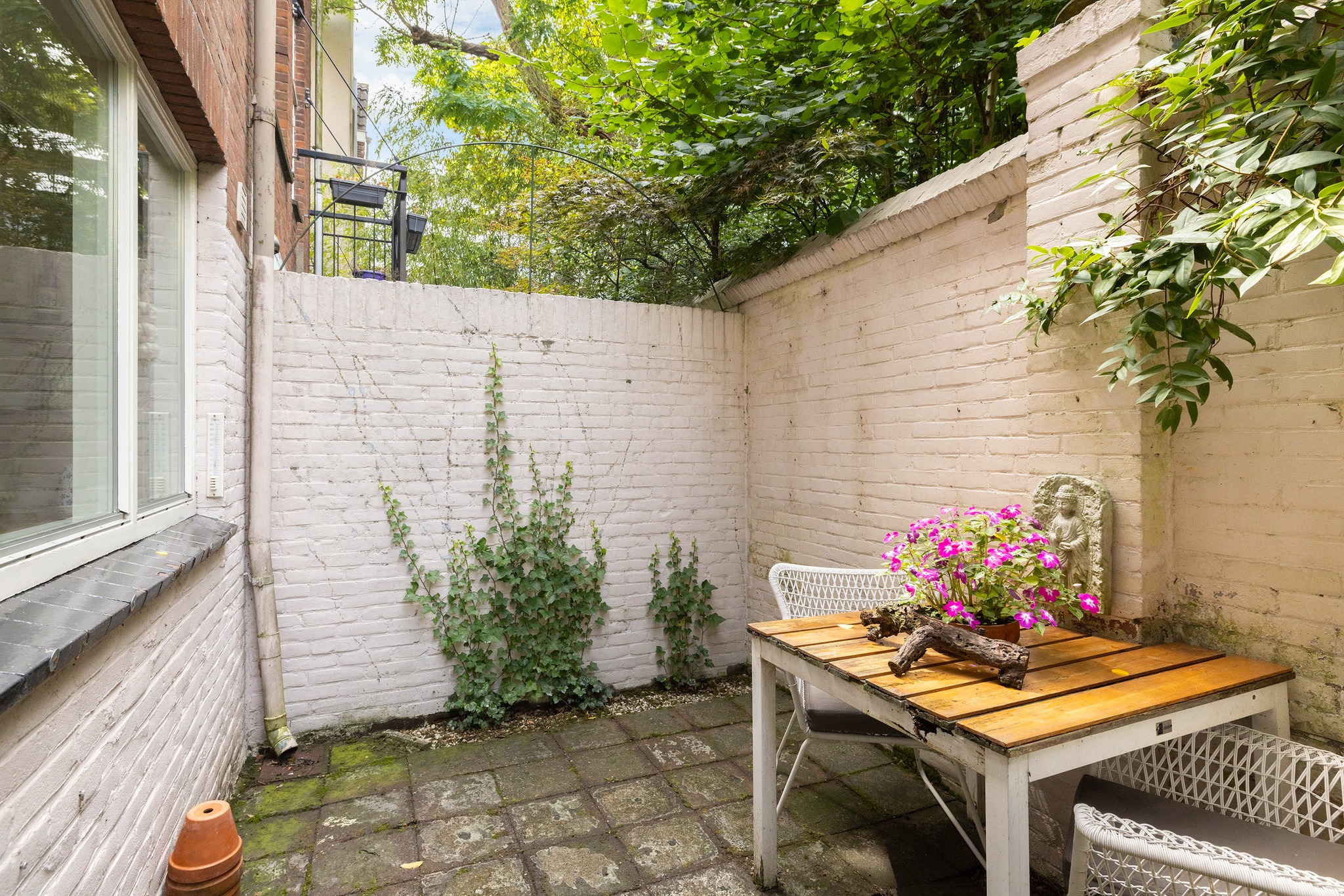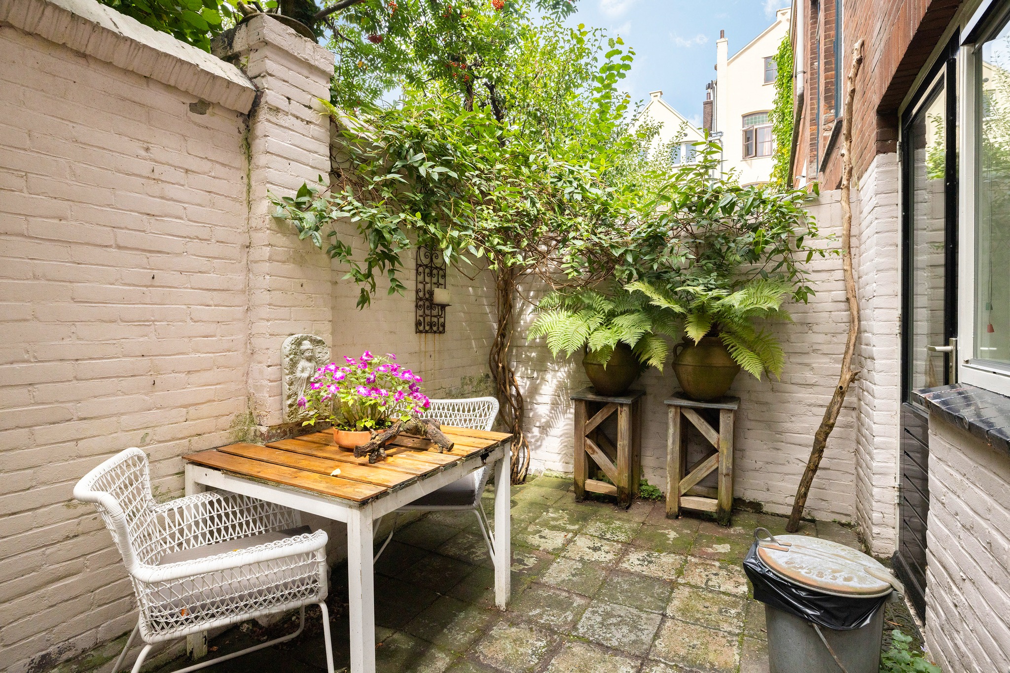 De buitenplaats biedt een beschutte en rustige plek om je even terug te trekken met een lekker kopje koffie of voor een gezellige BBQ met vrienden. Door de hoge stenen muur heb je hier ultieme privacy.