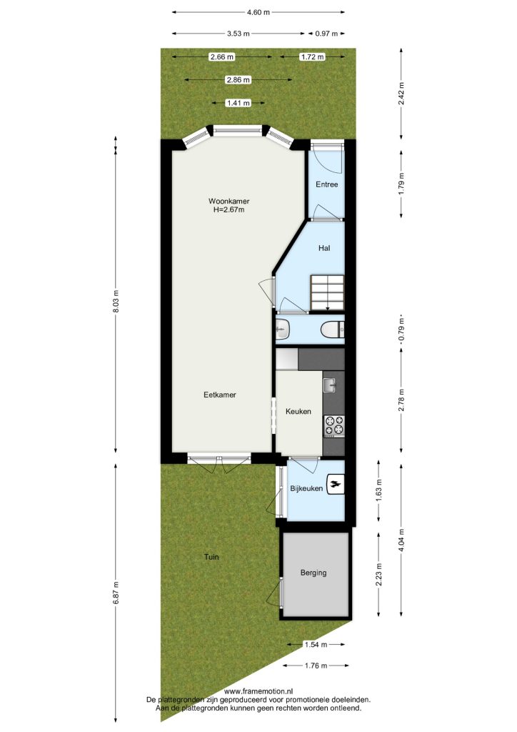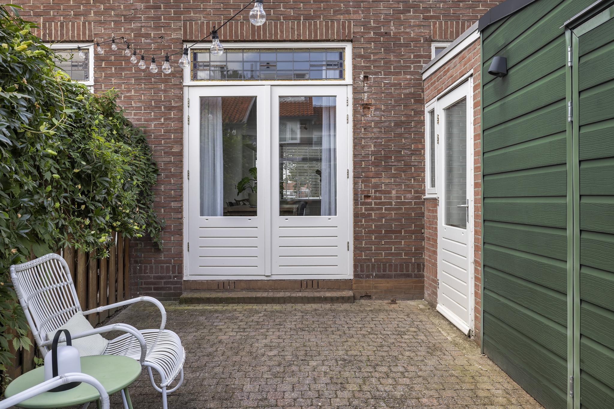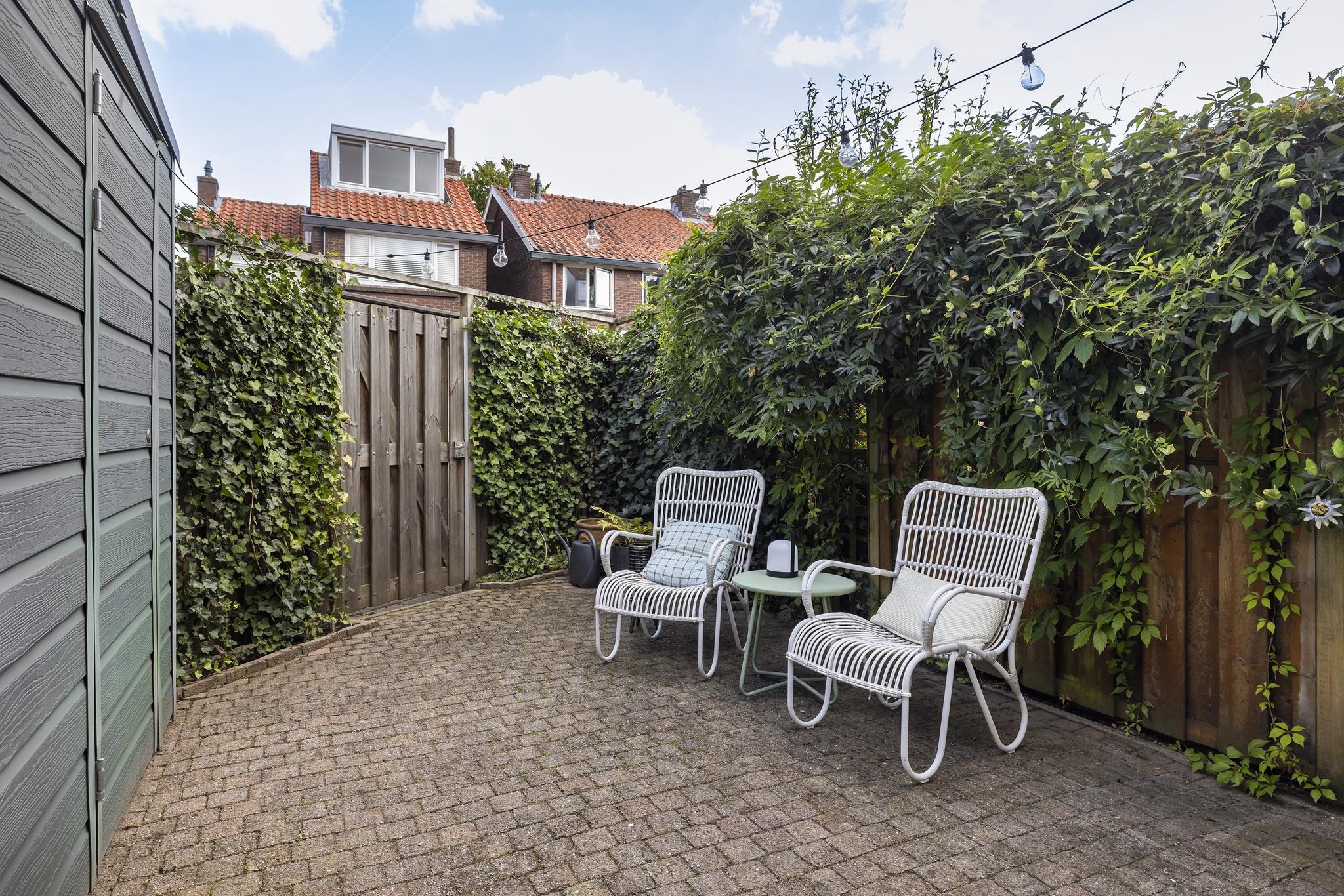 Knusse achtertuin met eigen achterom en kunststof aangebouwde berging met elektra.