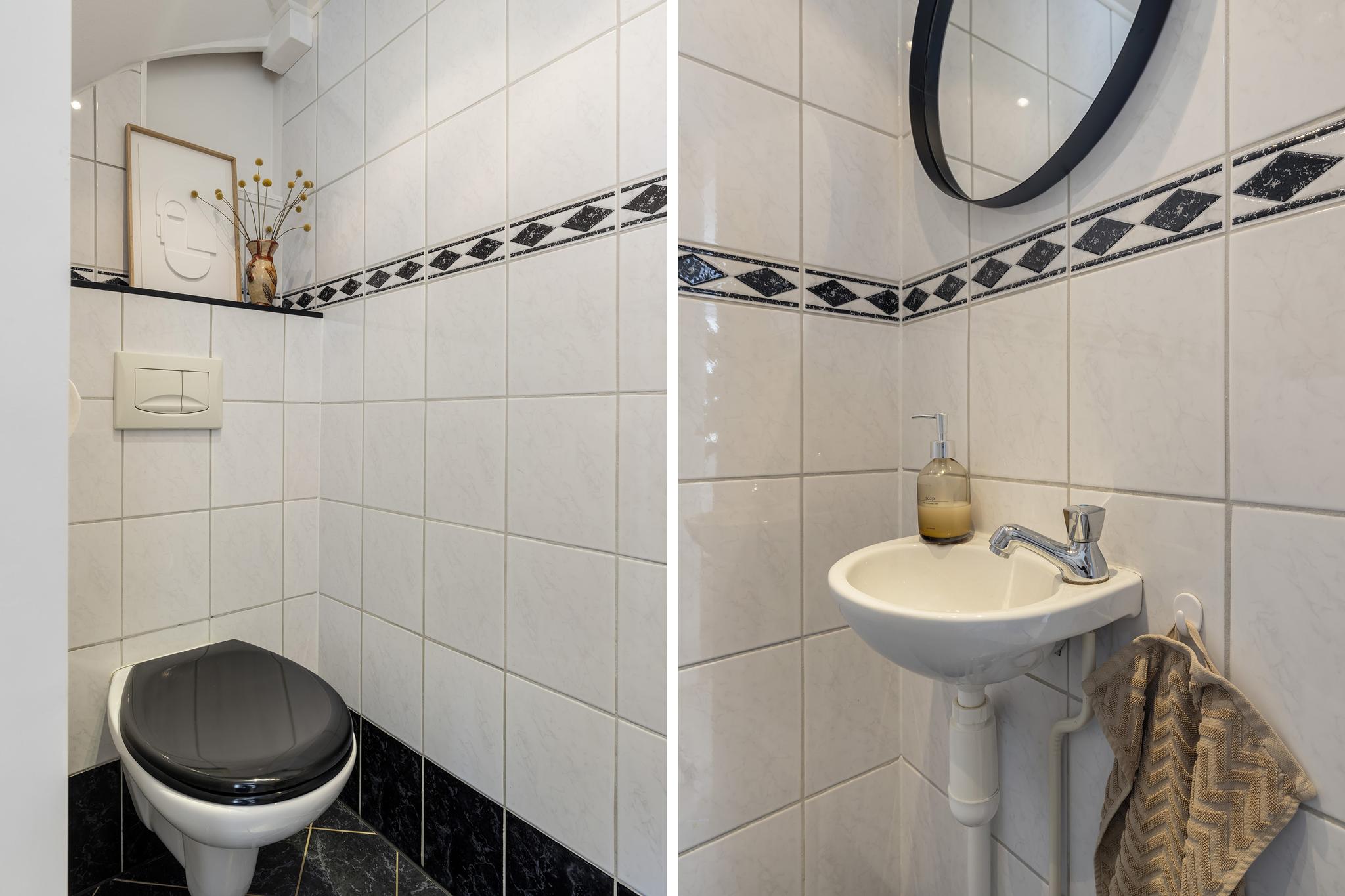 Toilet, vrijhangend en voorzien van fonteintje, geheel betegelde wanden, elektrische ventilatie, verlaagd plafond met spots.