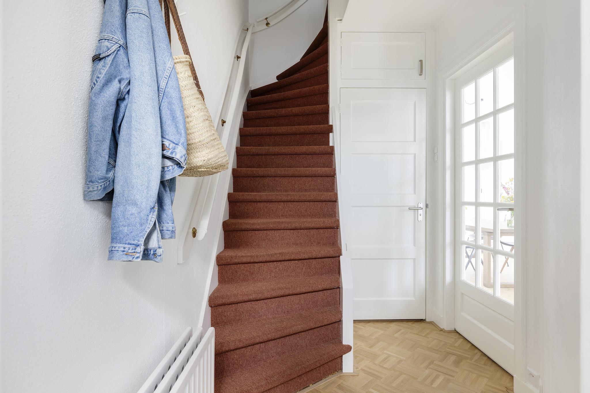 Hal met toilet, trapopgang en toegang tot de woonkamer.