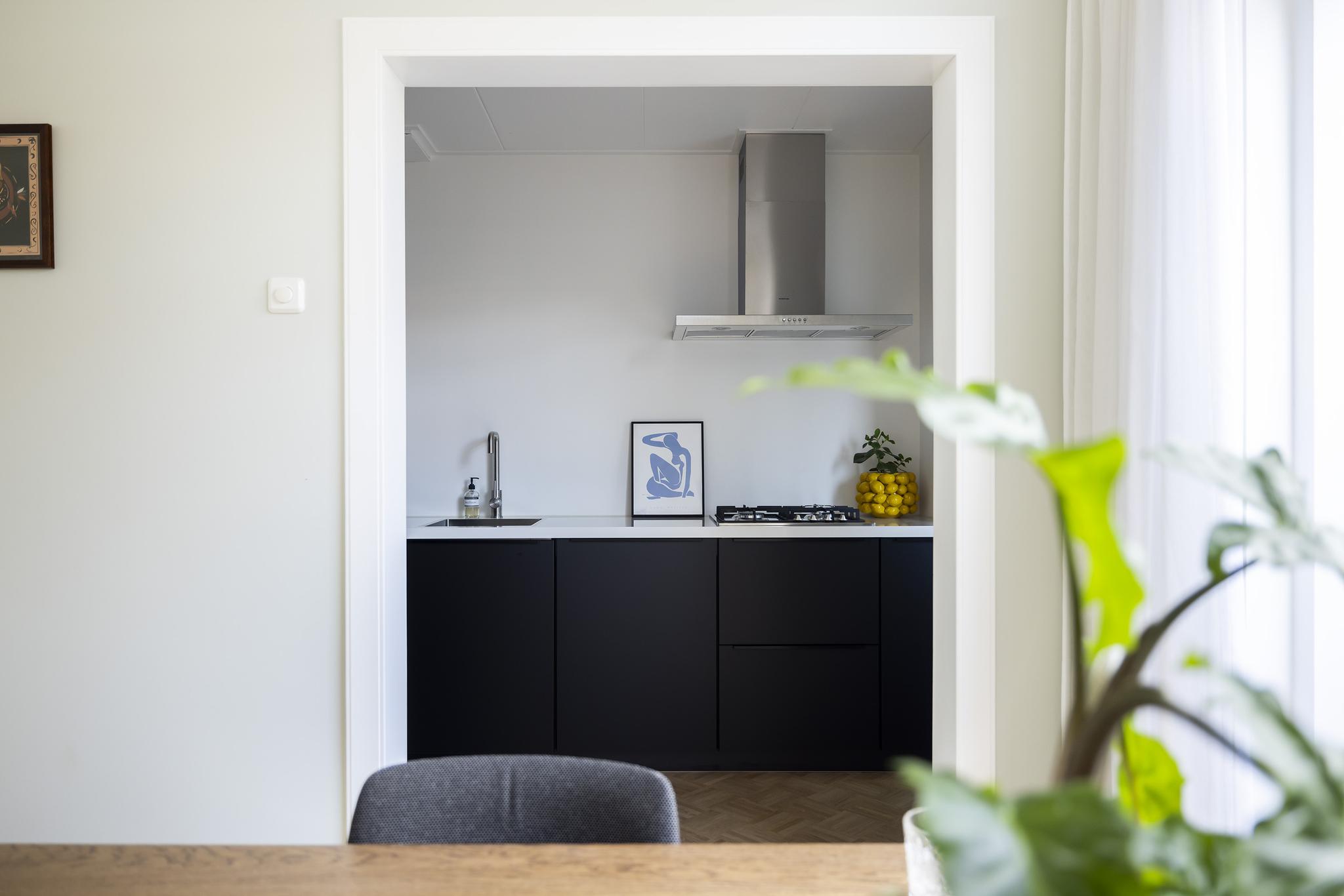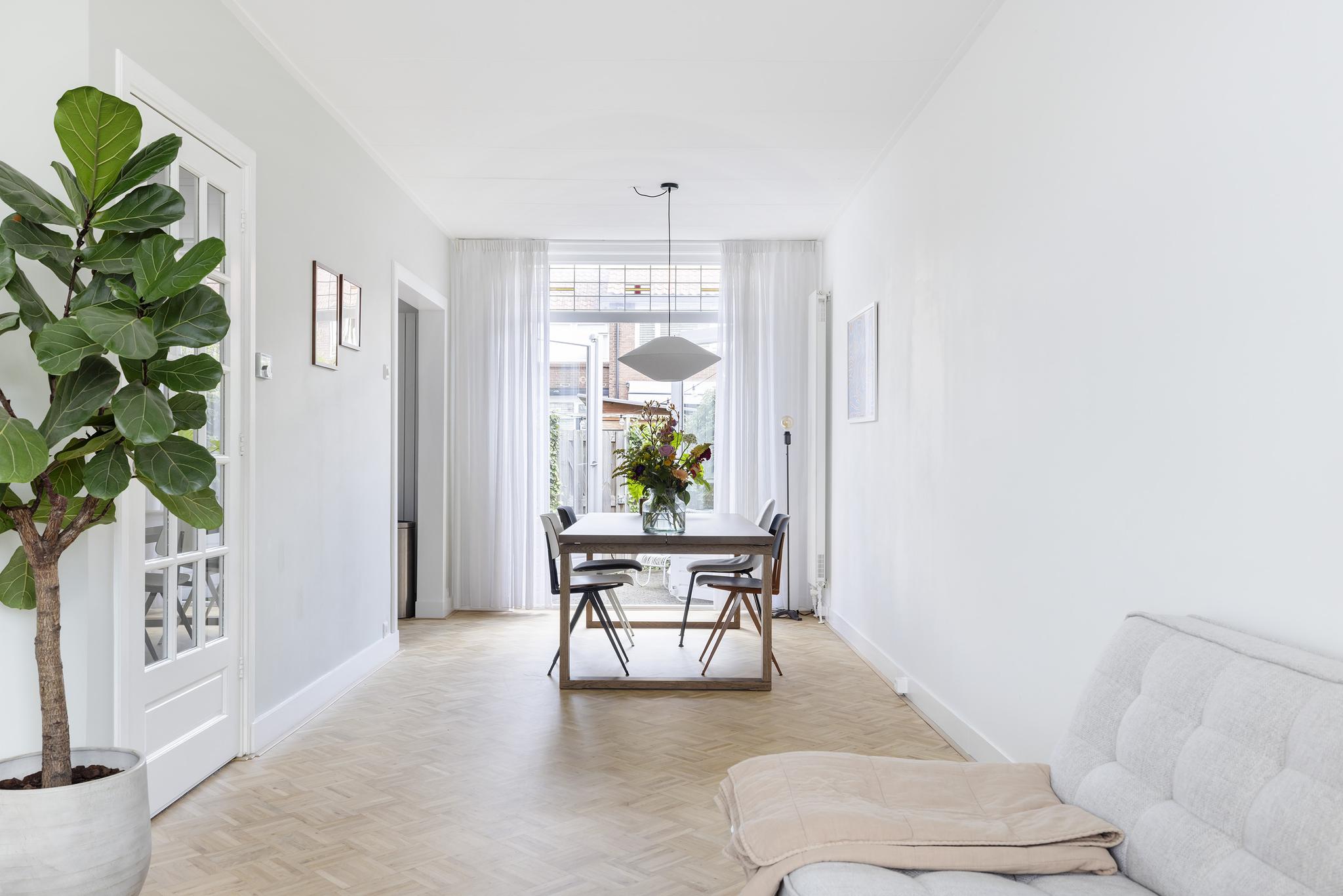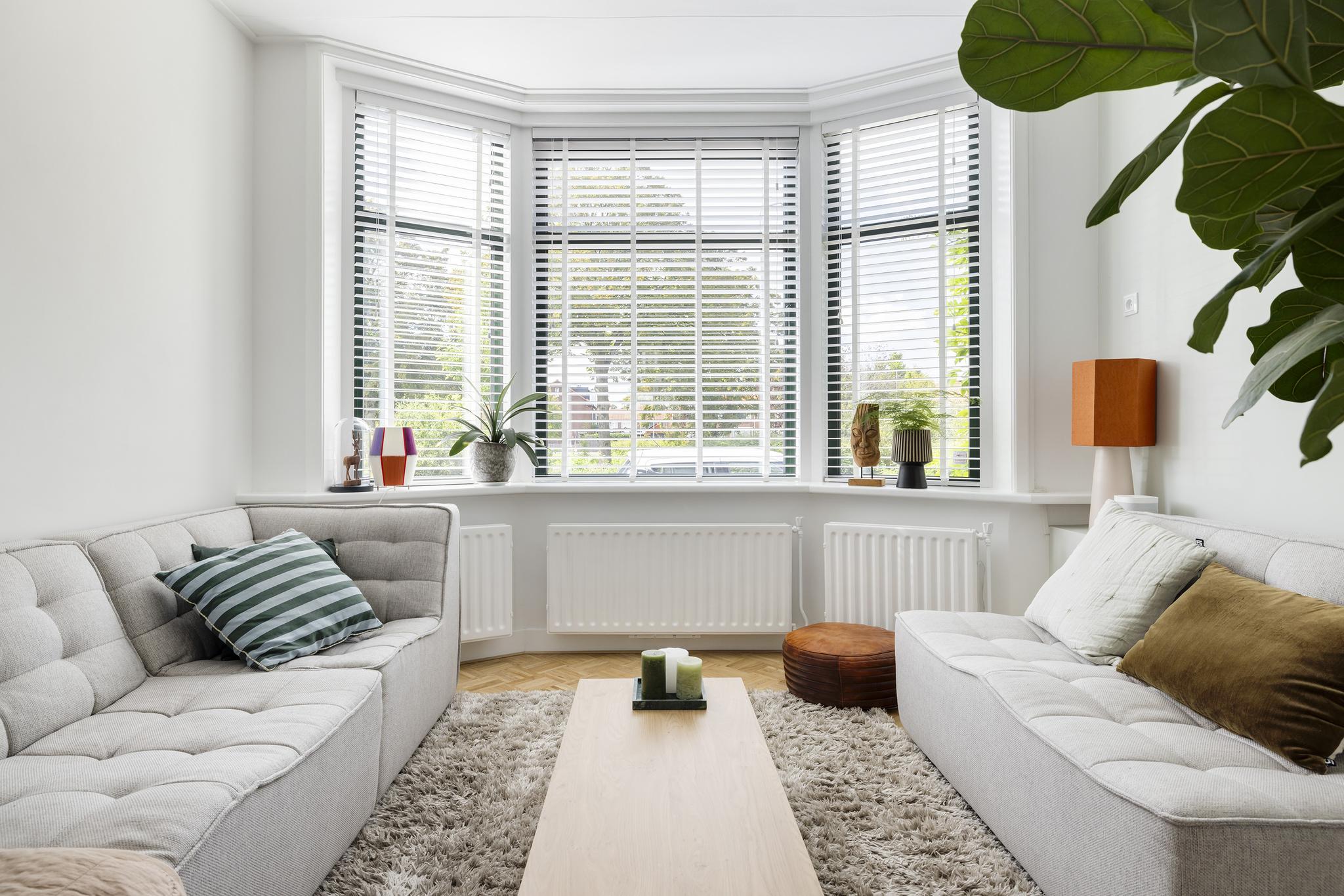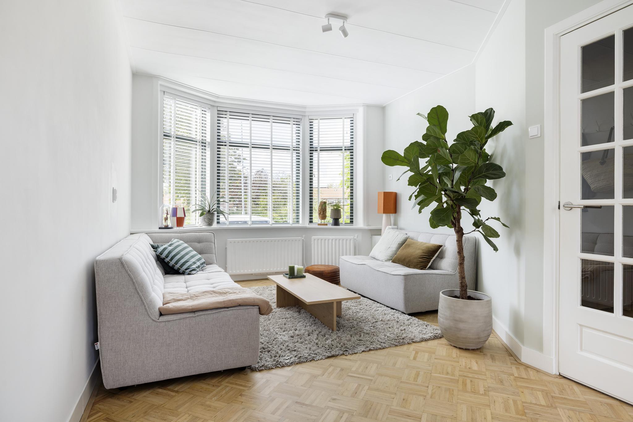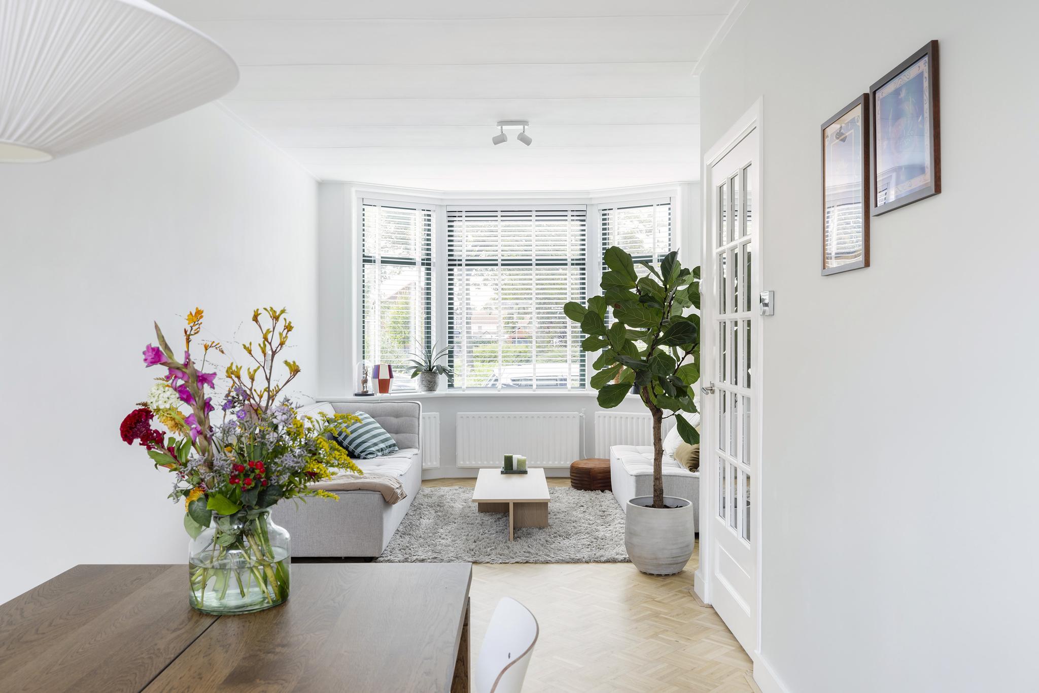 Ruime doorzon woonkamer met erker aan de voorzijde en openslaande deuren naar de tuin, aan de achterzijde open toegang tot de keuken. De mooie vloer die we in de hal tegenkwamen loopt helemaal door naar woonkamer en keuken, wanden zijn strak gestuct, een hele mooie basis dus!