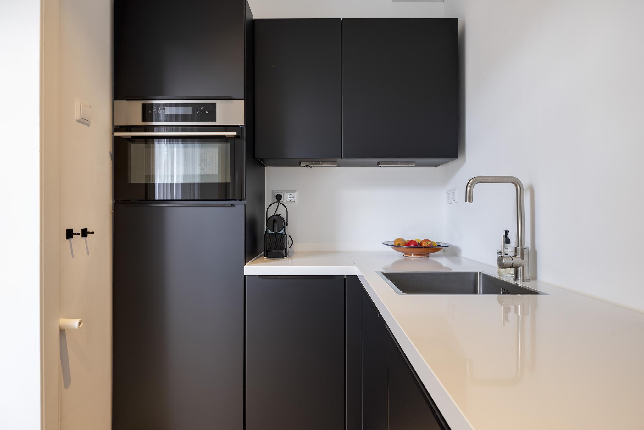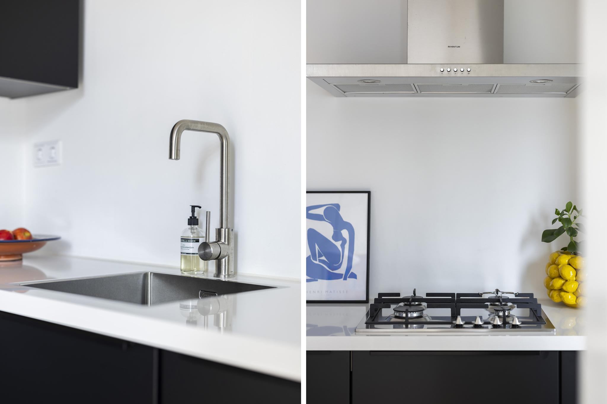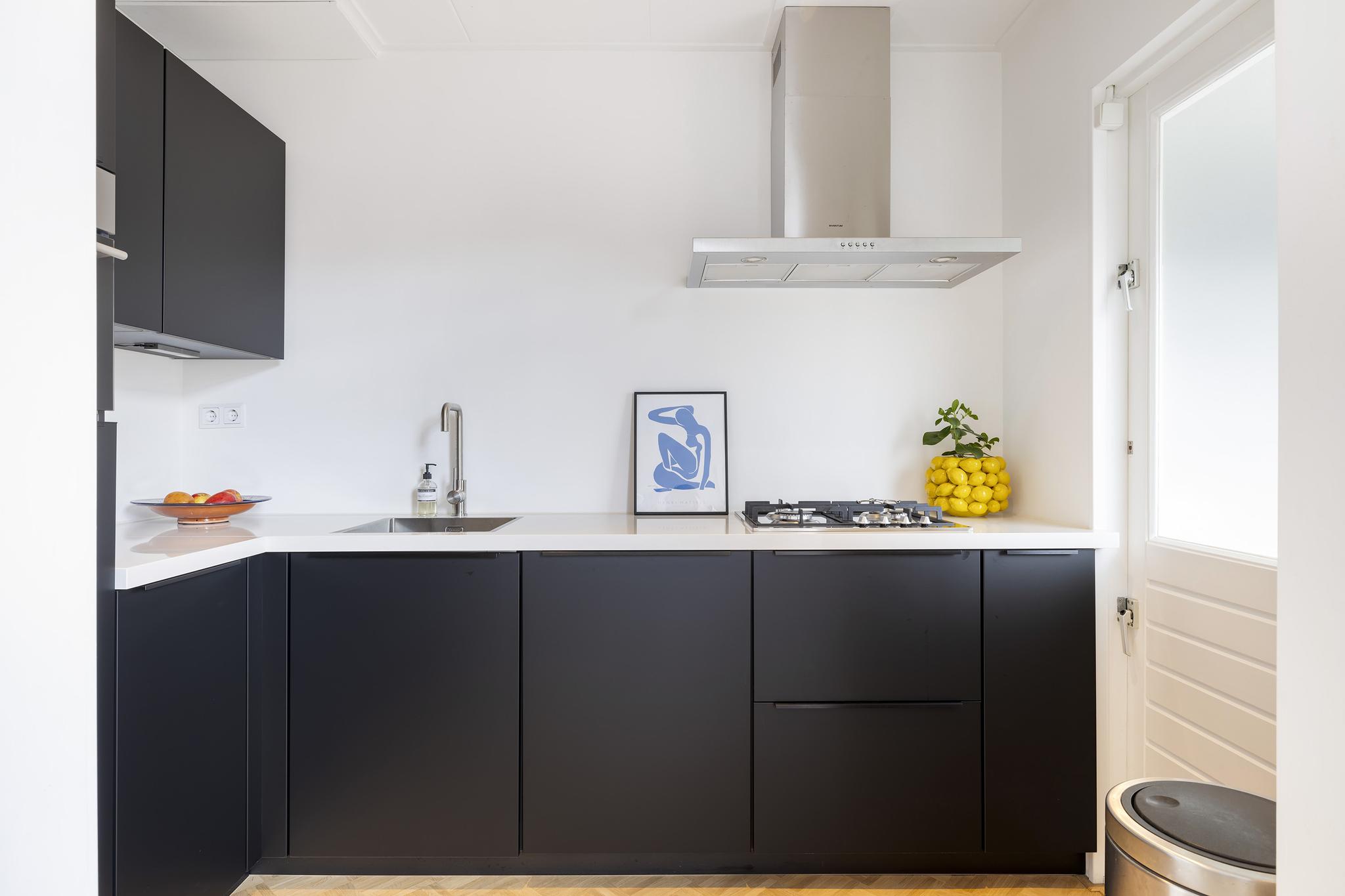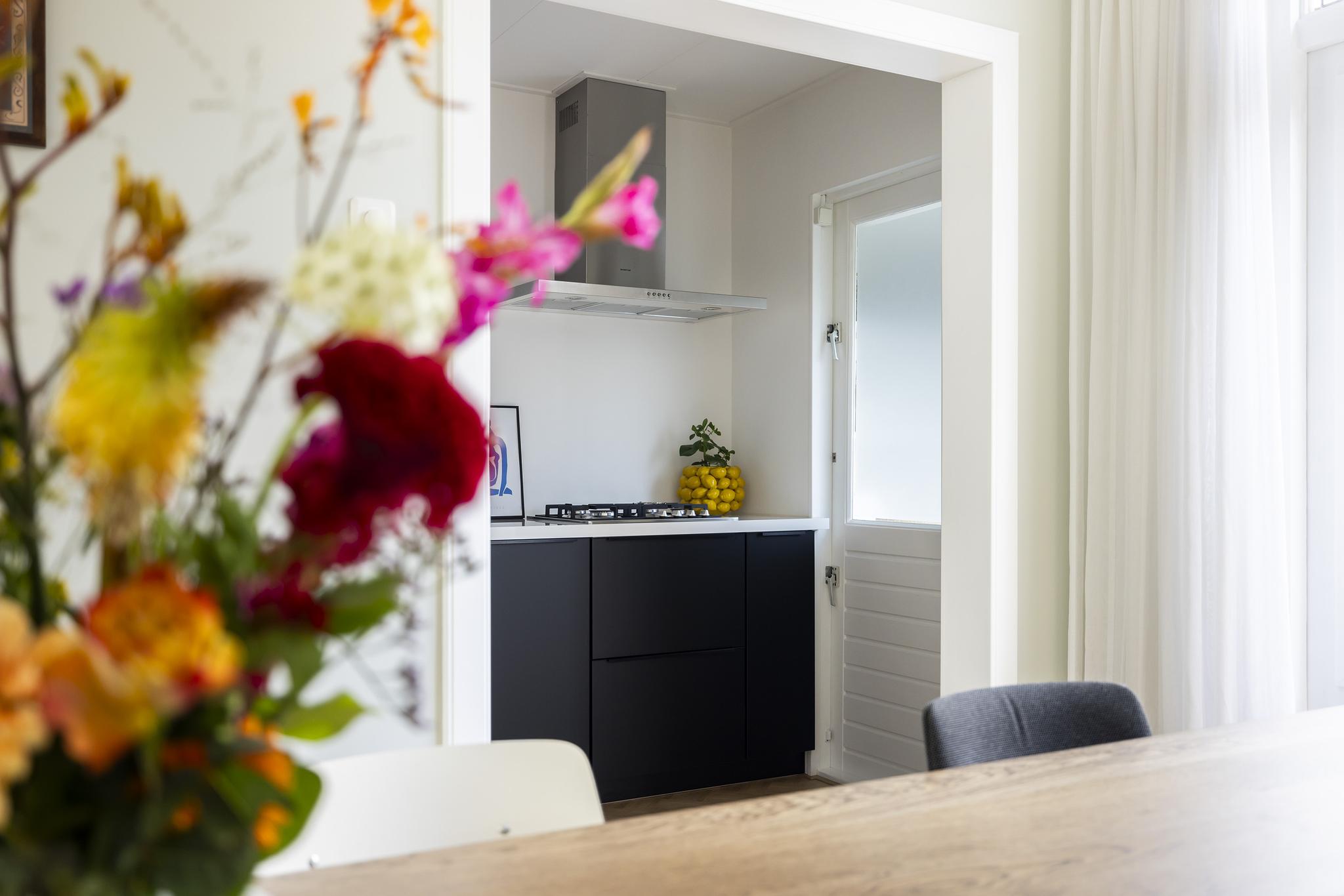 Keuken in hoekopstelling met 4 pits gaskookplaat, rvs schouw, vaatwasser, spoelbak, koelkast, combi-oven en toegang tot de bijkeuken.