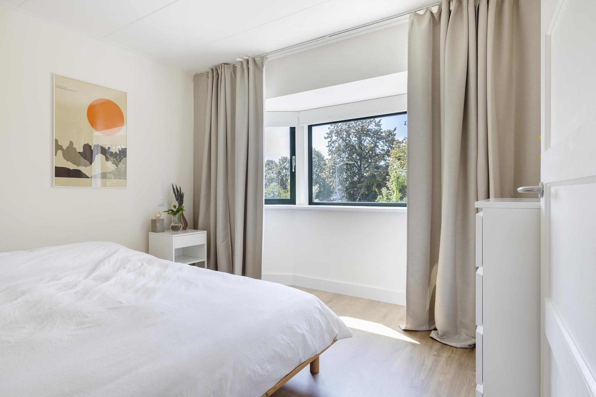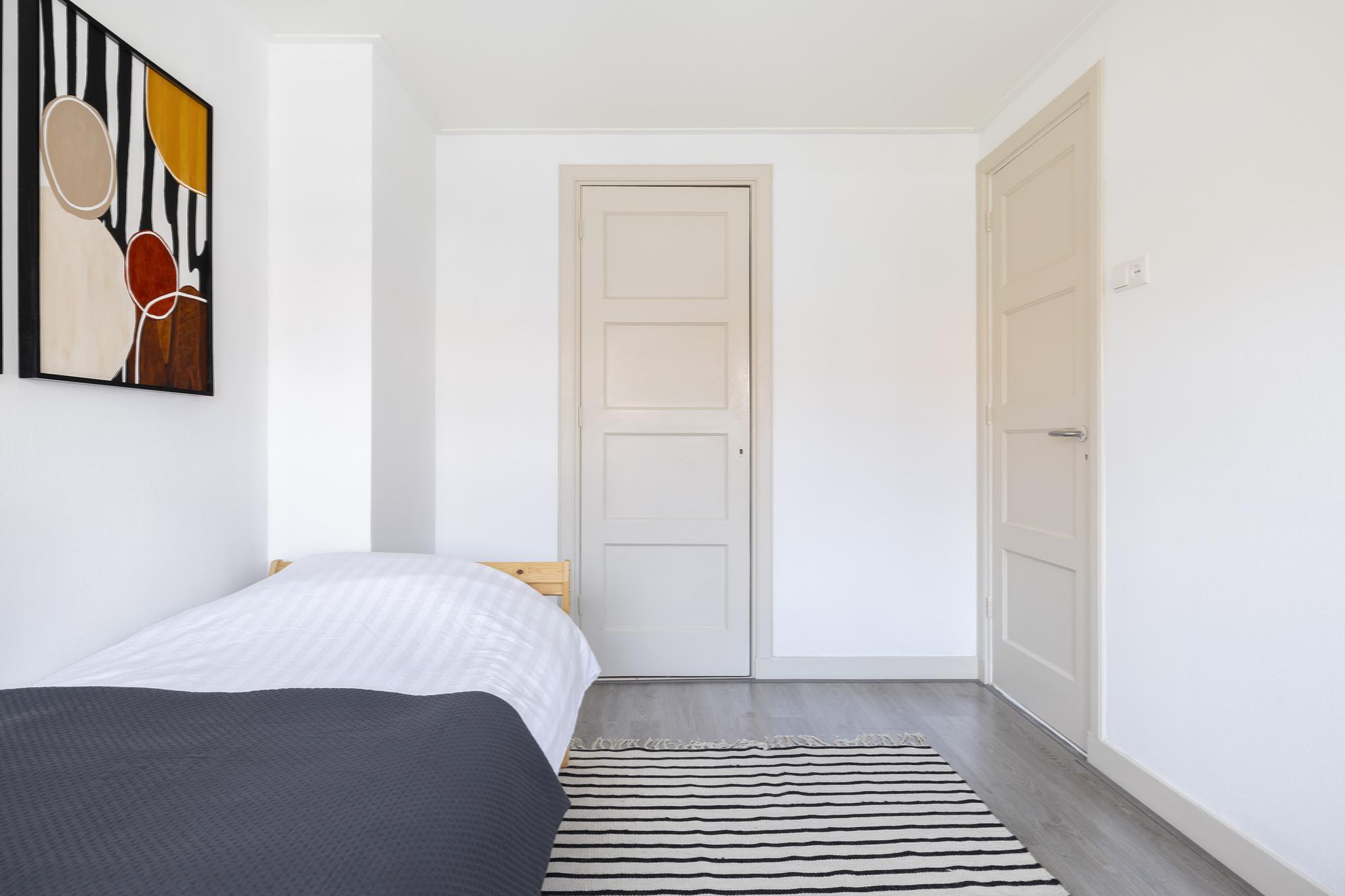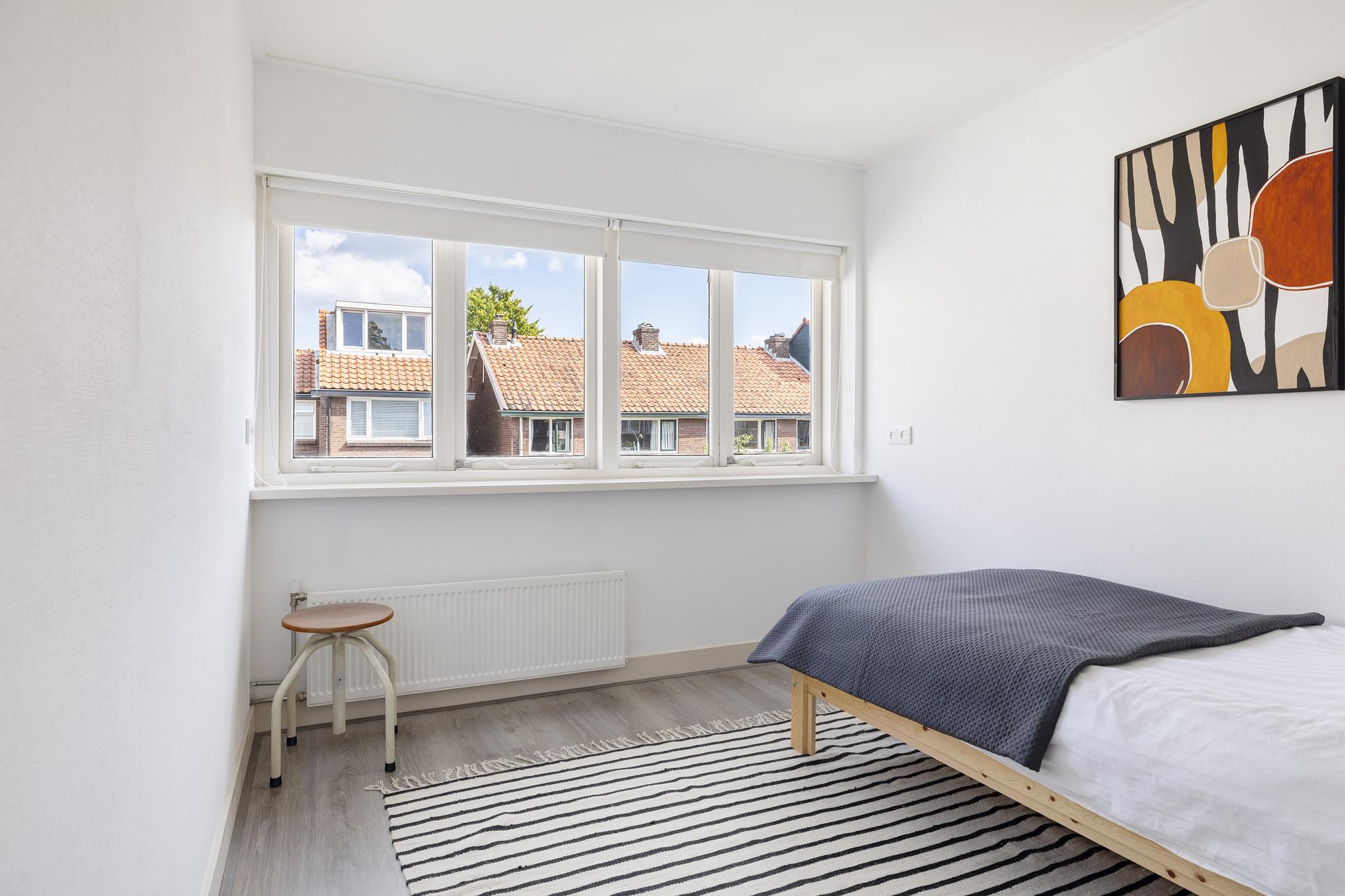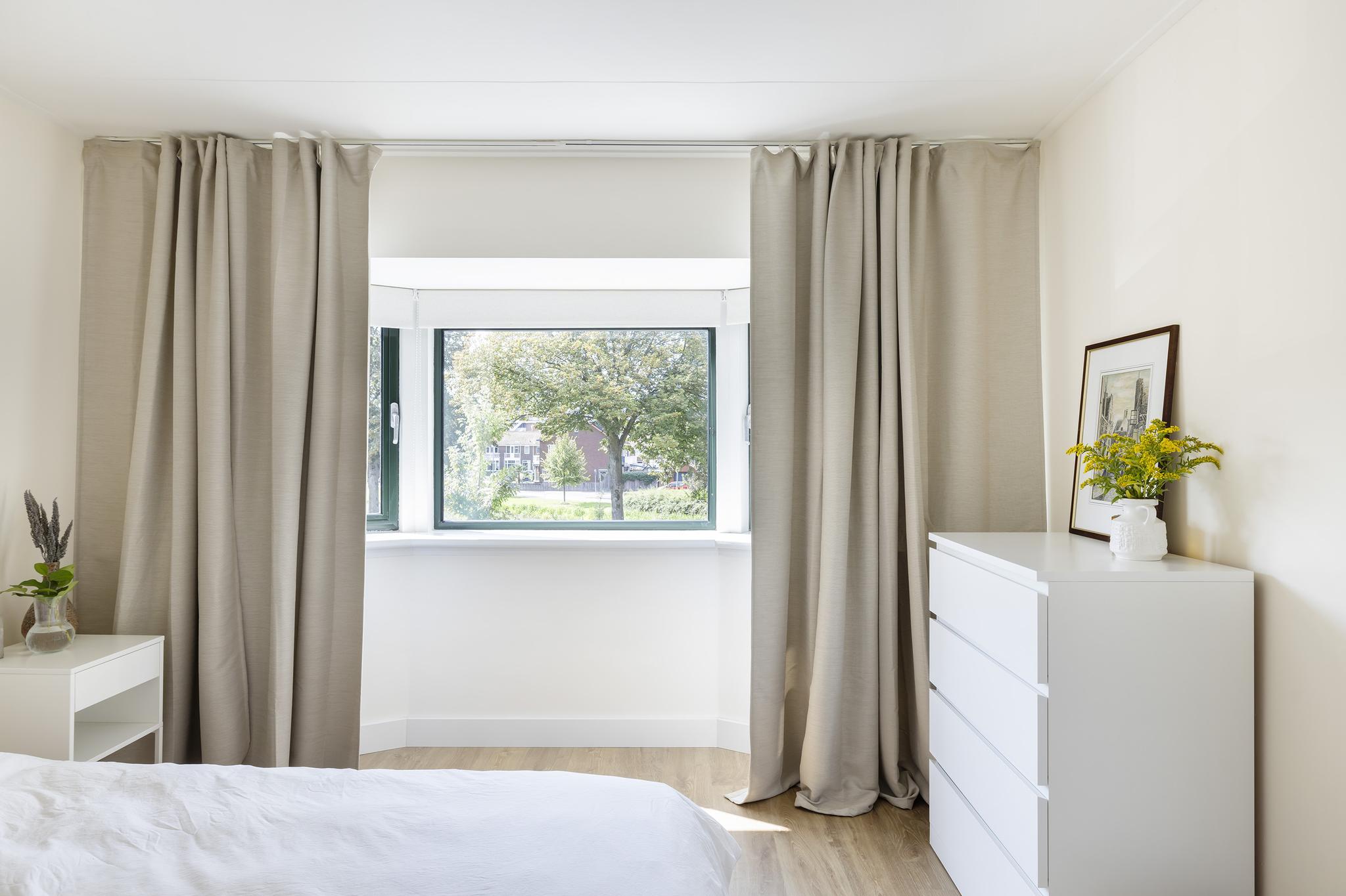 Slaapkamer 1 aan de voorzijde met erker en vaste kasten. De radiator is uit deze kamer weggehaald maar is uiteraard terug te plaatsen voor de liefhebber.