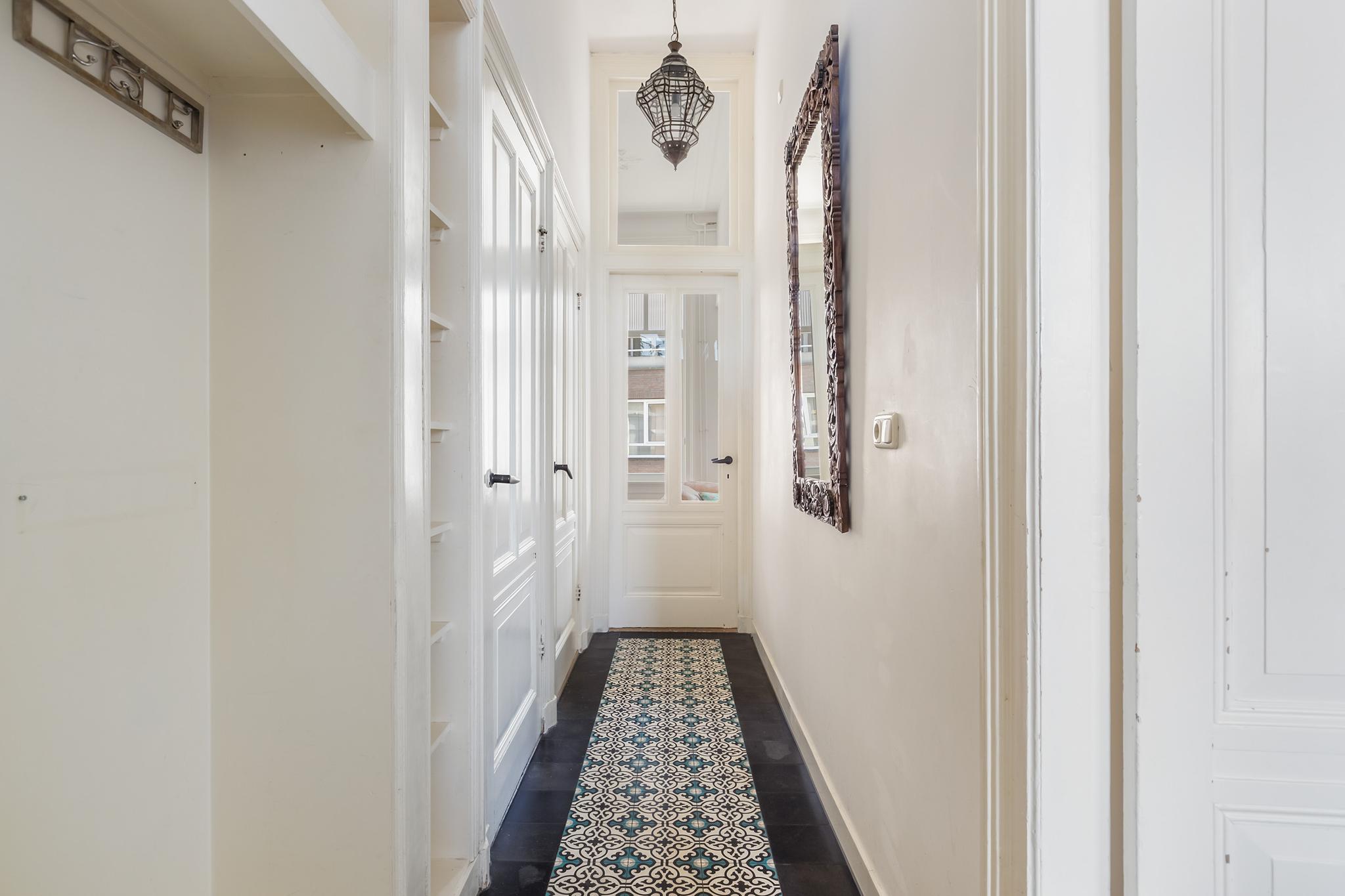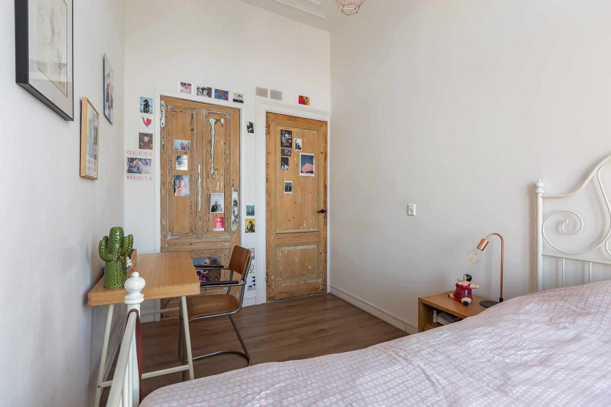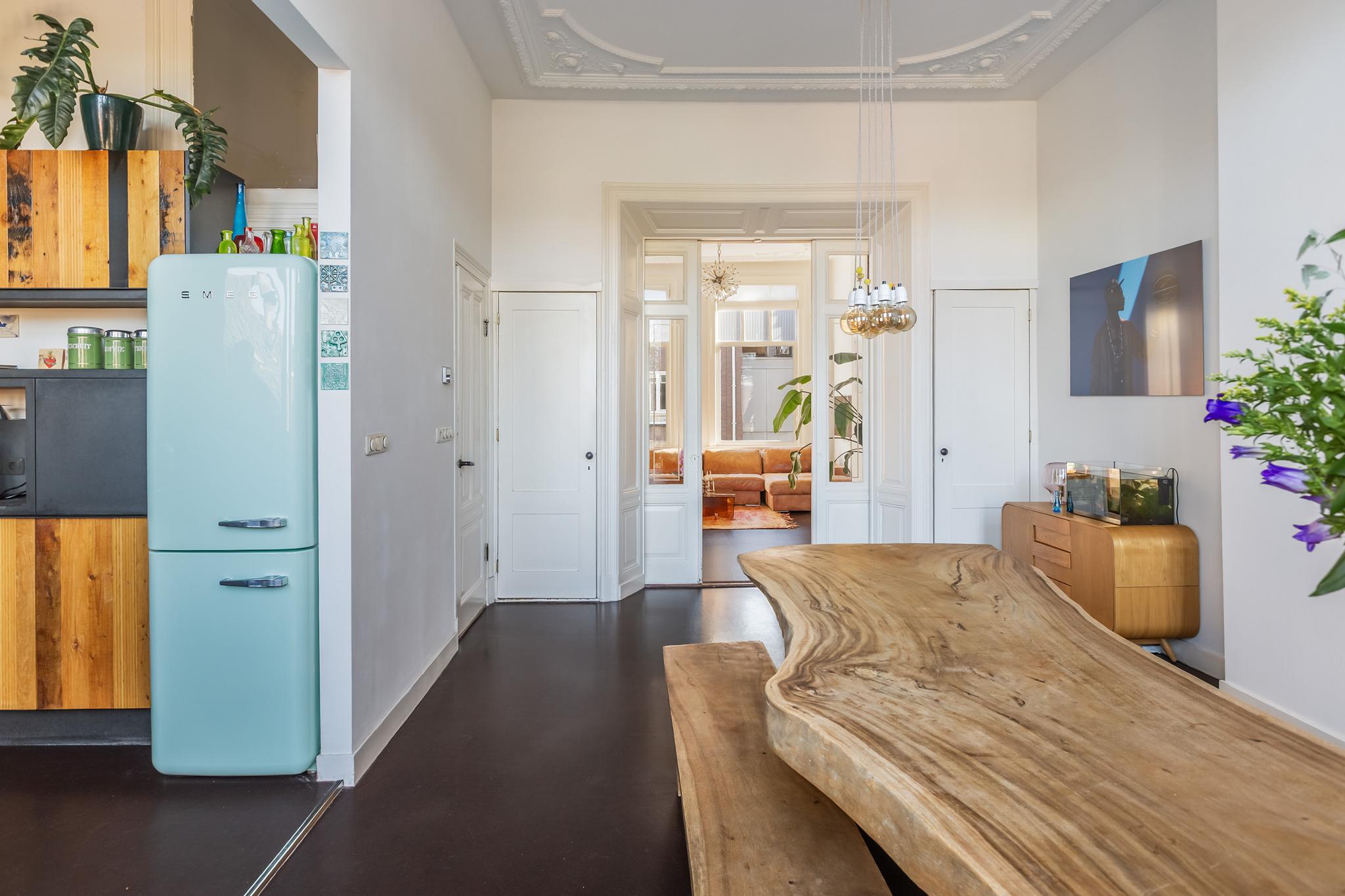 De hoge ornamentenplafonds geven elke ruimte grandeur, terwijl de grote raampartijen zorgen voor een zee aan licht. Klassieke en suite deuren verbinden de kamers met elkaar en behouden tegelijkertijd die fijne knusse sfeer. De keuken is stoer en eigentijds, een plek die uitnodigt tot koken, borrelen en lange avonden tafelen. De strak afgewerkte badkamer sluit daar naadloos op aan, en met vier ruime slaapkamers is er plek genoeg voor een gezin, een werkplek aan huis, of logees.