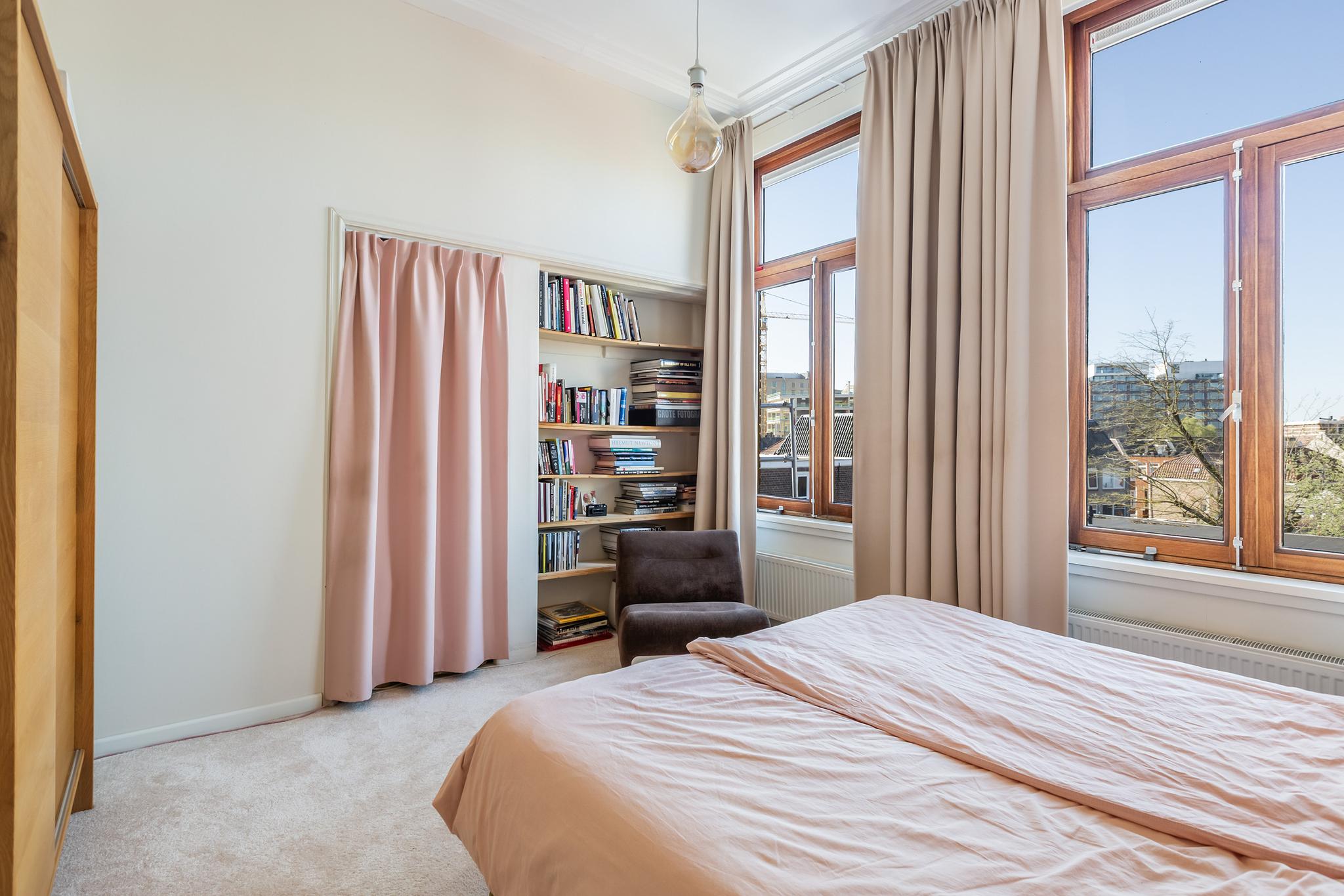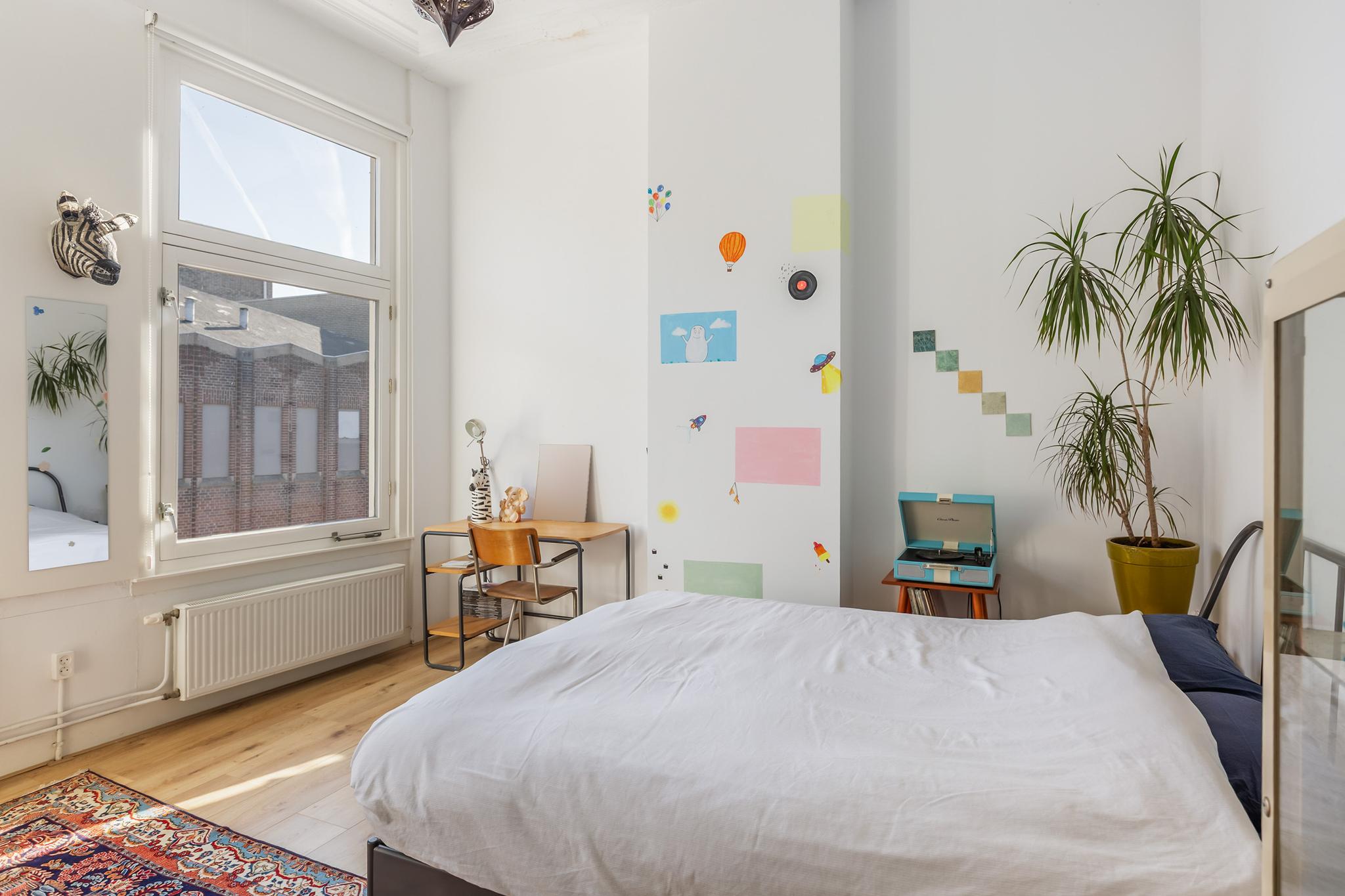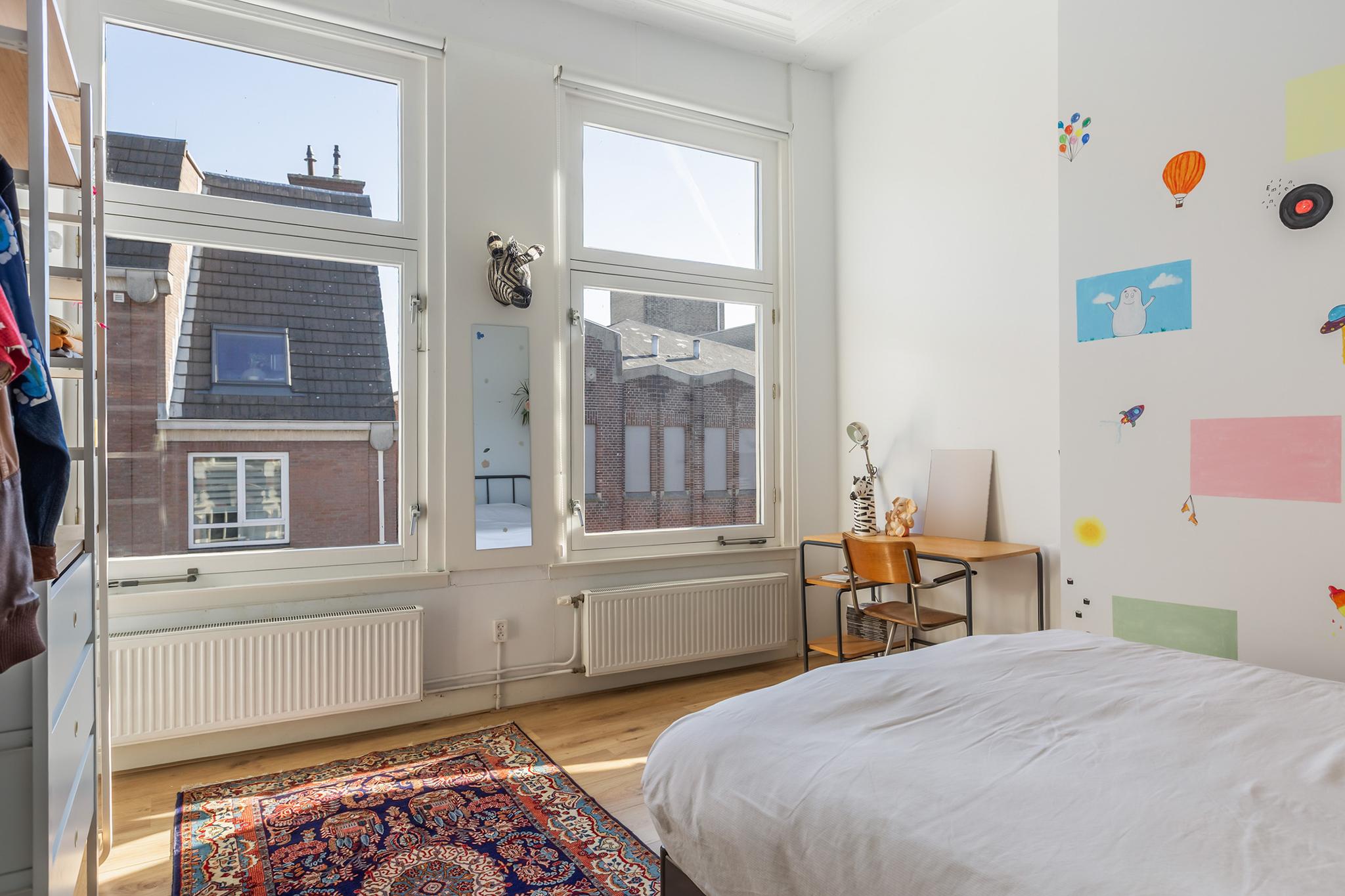 De hoge ornamentenplafonds geven elke ruimte grandeur, terwijl de grote raampartijen zorgen voor een zee aan licht. Klassieke en suite deuren verbinden de kamers met elkaar en behouden tegelijkertijd die fijne knusse sfeer. De keuken is stoer en eigentijds, een plek die uitnodigt tot koken, borrelen en lange avonden tafelen. De strak afgewerkte badkamer sluit daar naadloos op aan, en met vier ruime slaapkamers is er plek genoeg voor een gezin, een werkplek aan huis, of logees.