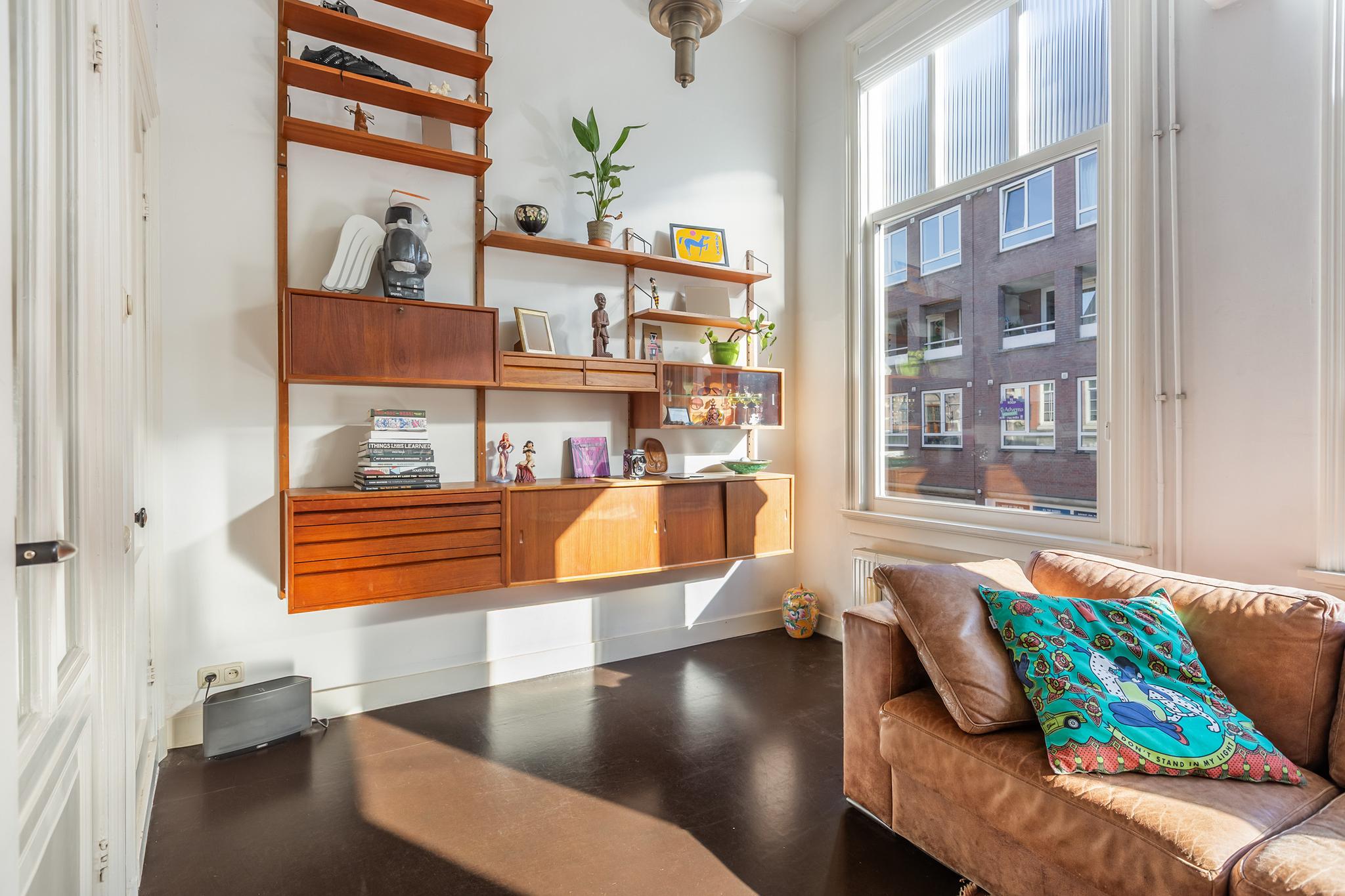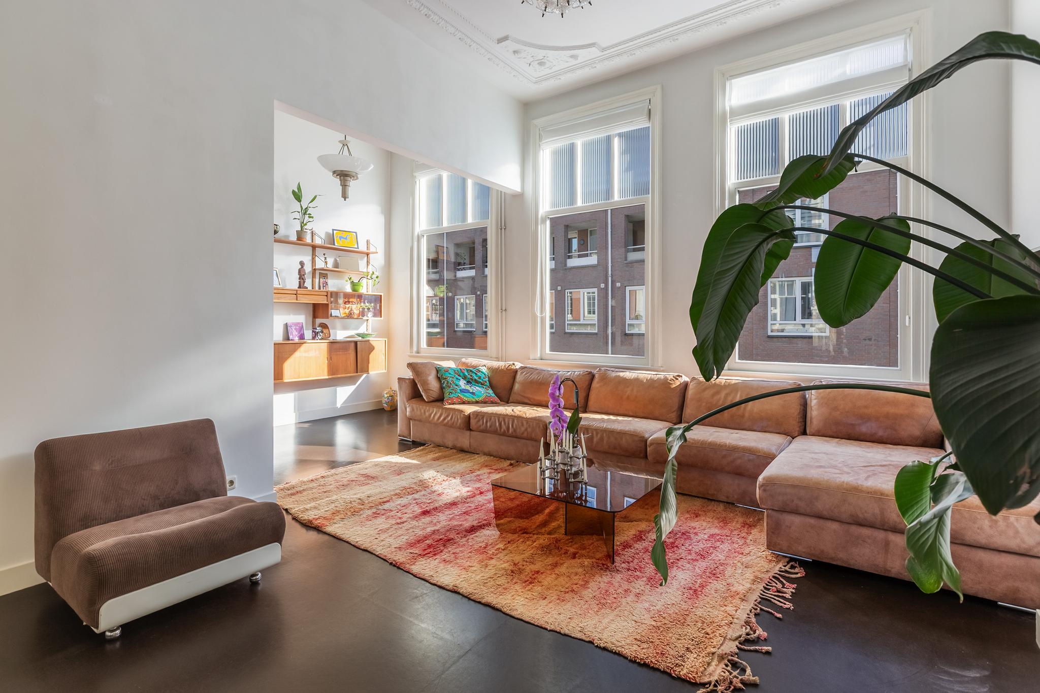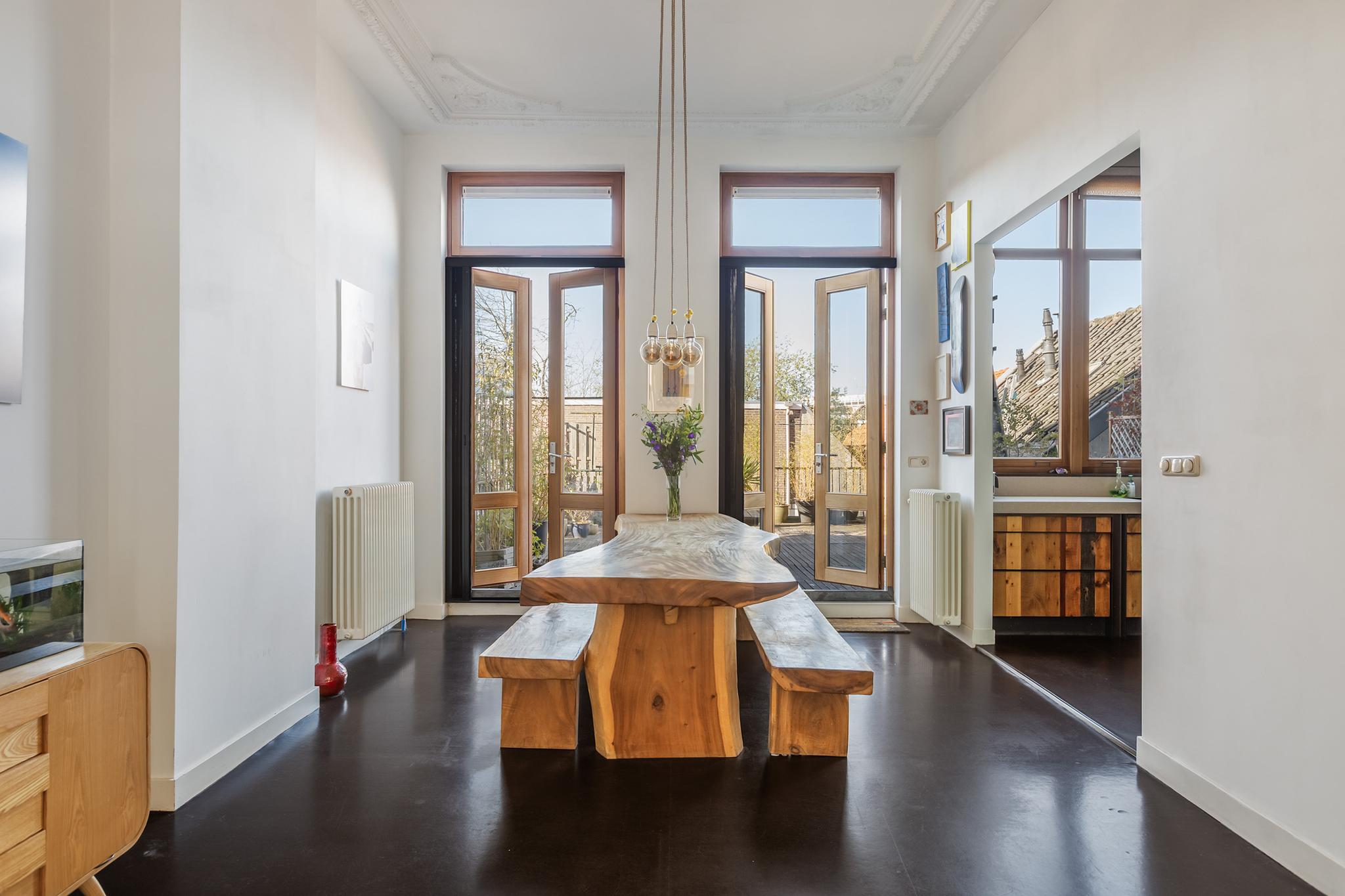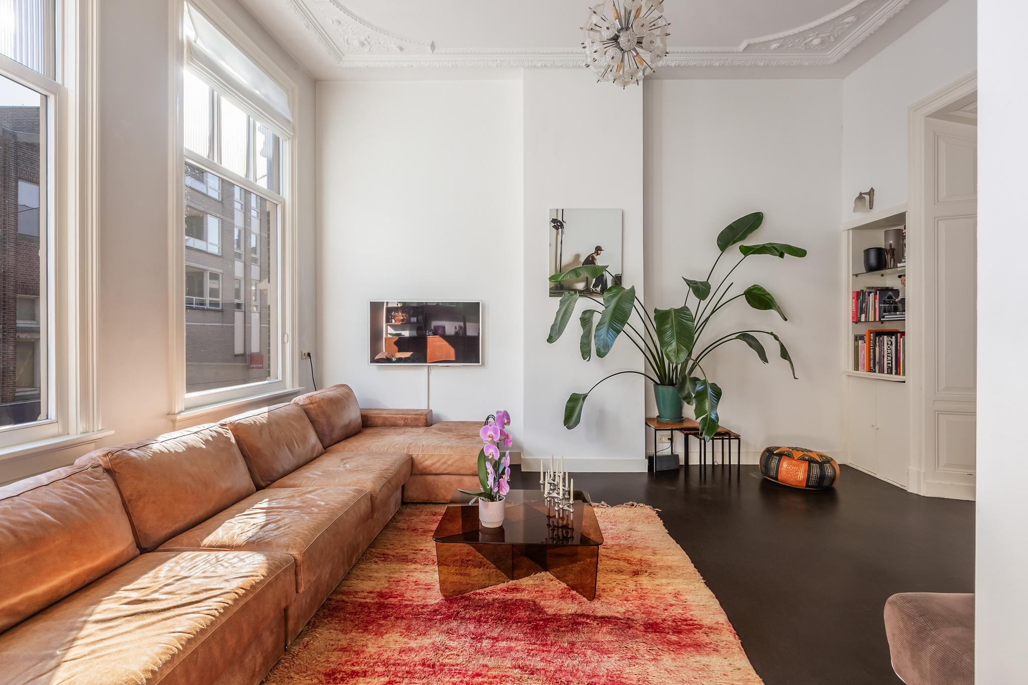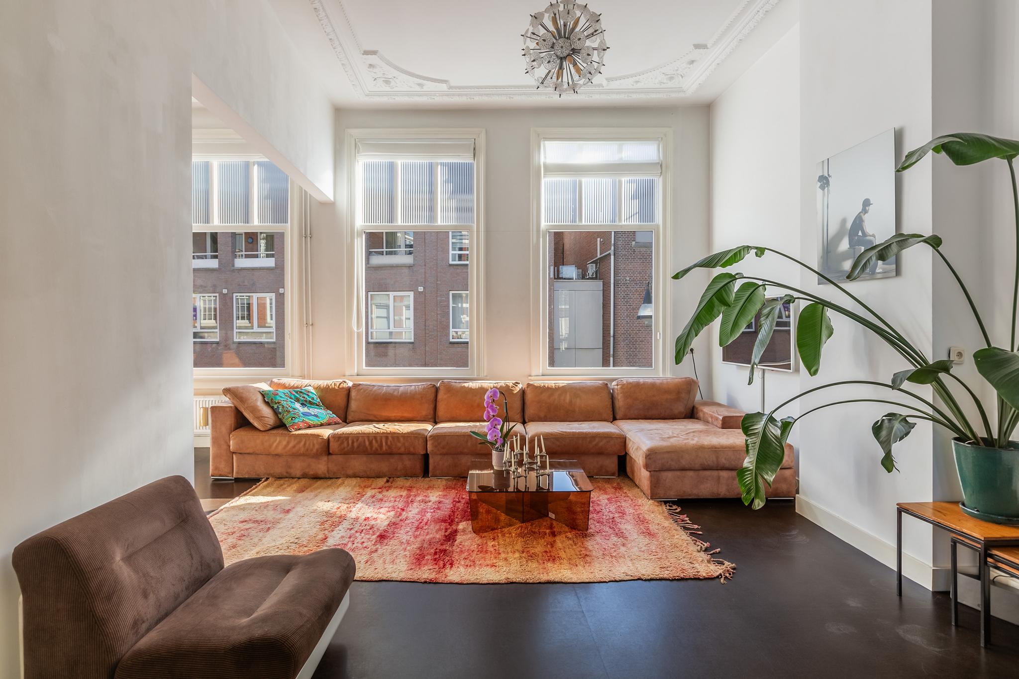 De woonkamer is echt een heerlijke ruimte met zeer veel licht. De suite scheiding is natuurlijk fantastisch tezamen met de hoge ornamenten plafonds. De vloer is afgewerkt met linoleum, aan de achterzijde 2x openslaande deuren naar het enorme dakterras, wat een luxe in de stad!