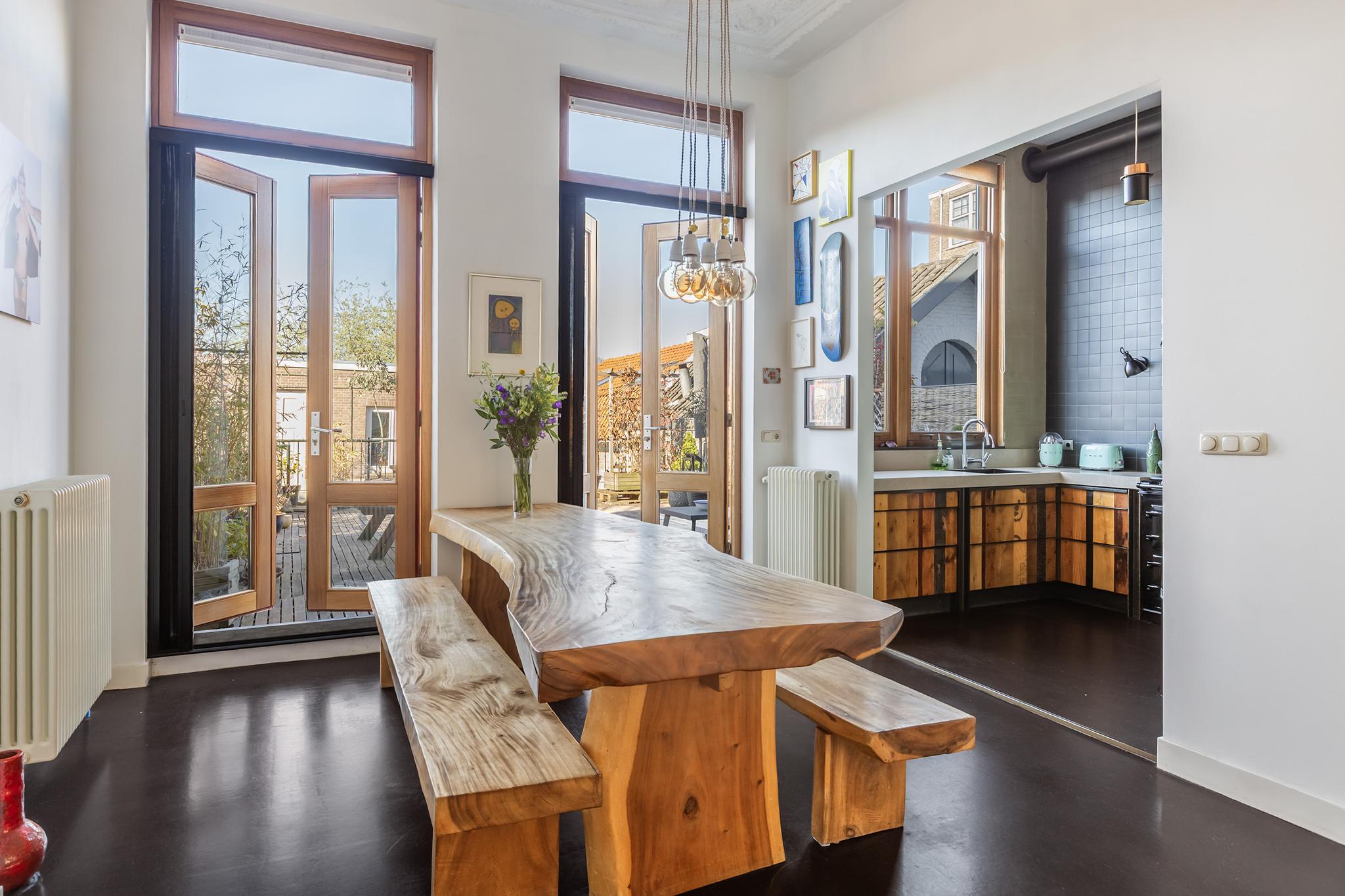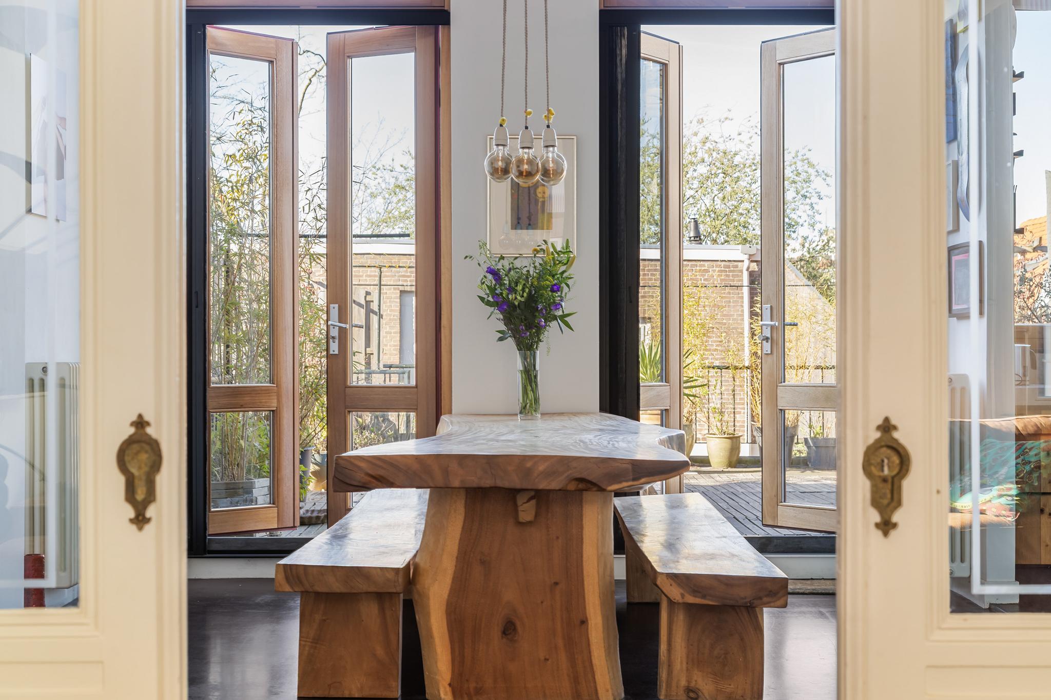 De houten eettafel en eet bank zijn uit Indonesië verscheept en door de eigenaar zelf uitgezocht, deze blijven in de woning achter.