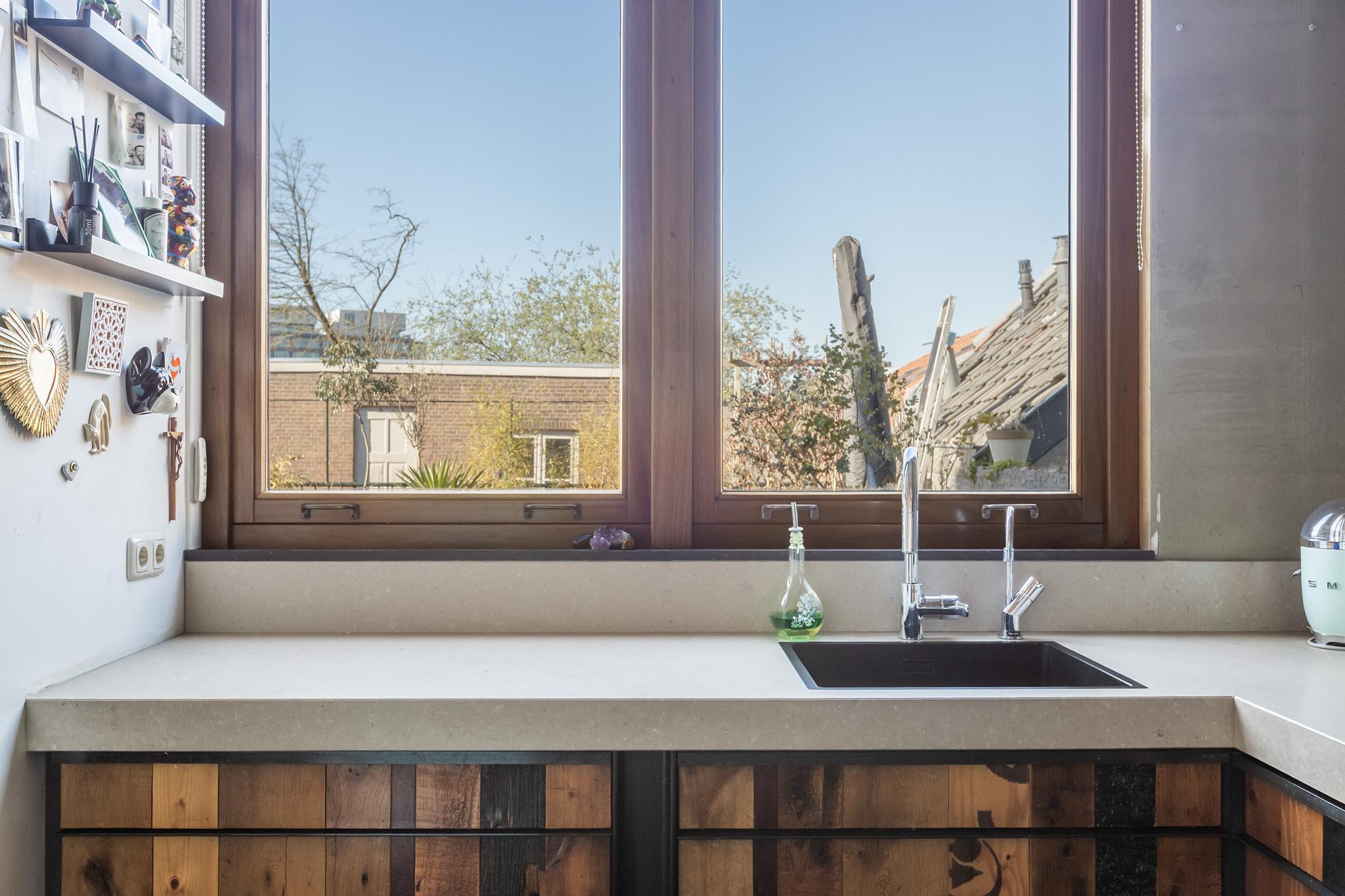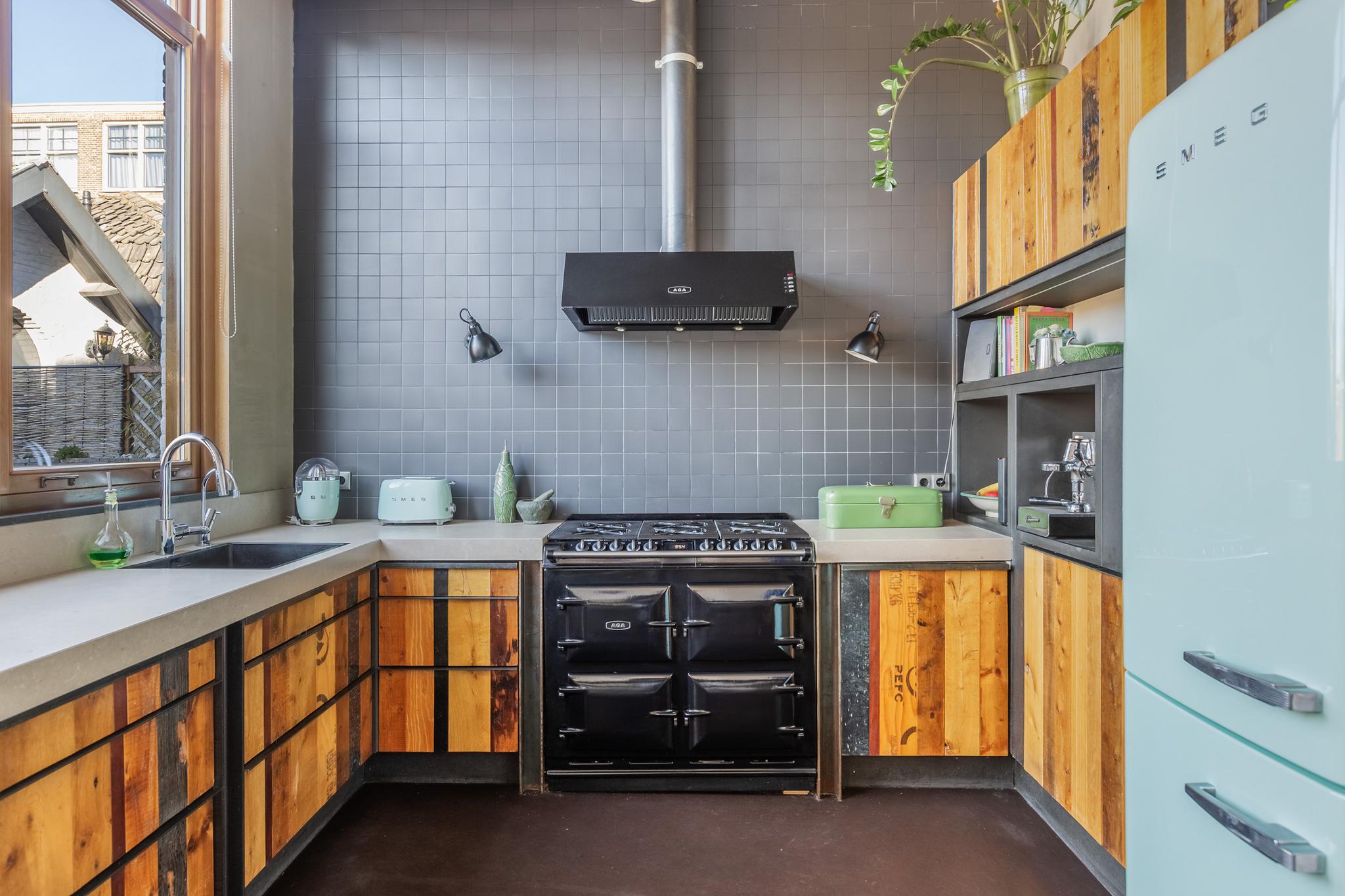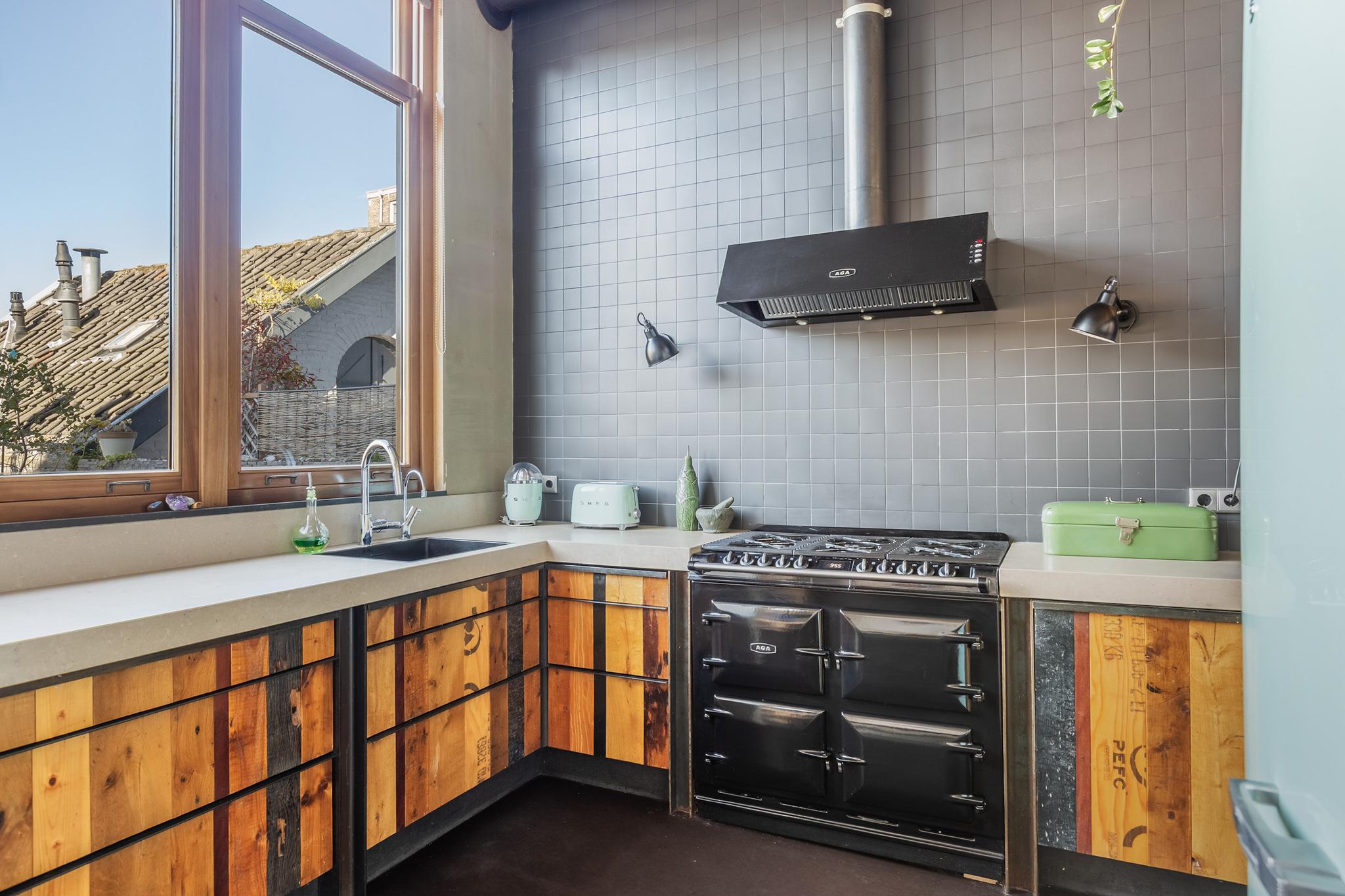 De open keuken kijkt uit over het dakterras en heeft een industriële look. De keuken is op maat gemaakt in een U opstelling met afzuigkap, groot 6 pits gaskooktoestel met maar liefst 4 ovens, spoelbak met Quooker kraan, vaatwasser en een dik composiet werkblad.