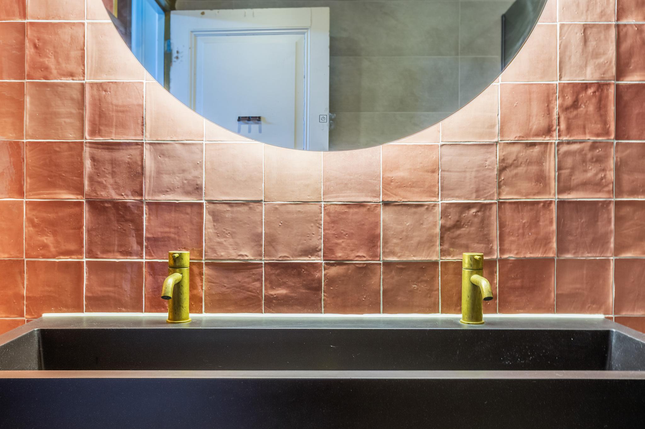 Toilet, vrijhangend en voorzien van een fonteintje, gedeeltelijk betegelde wanden.
