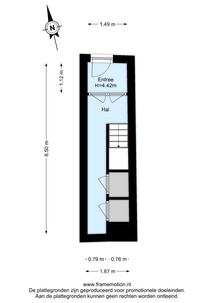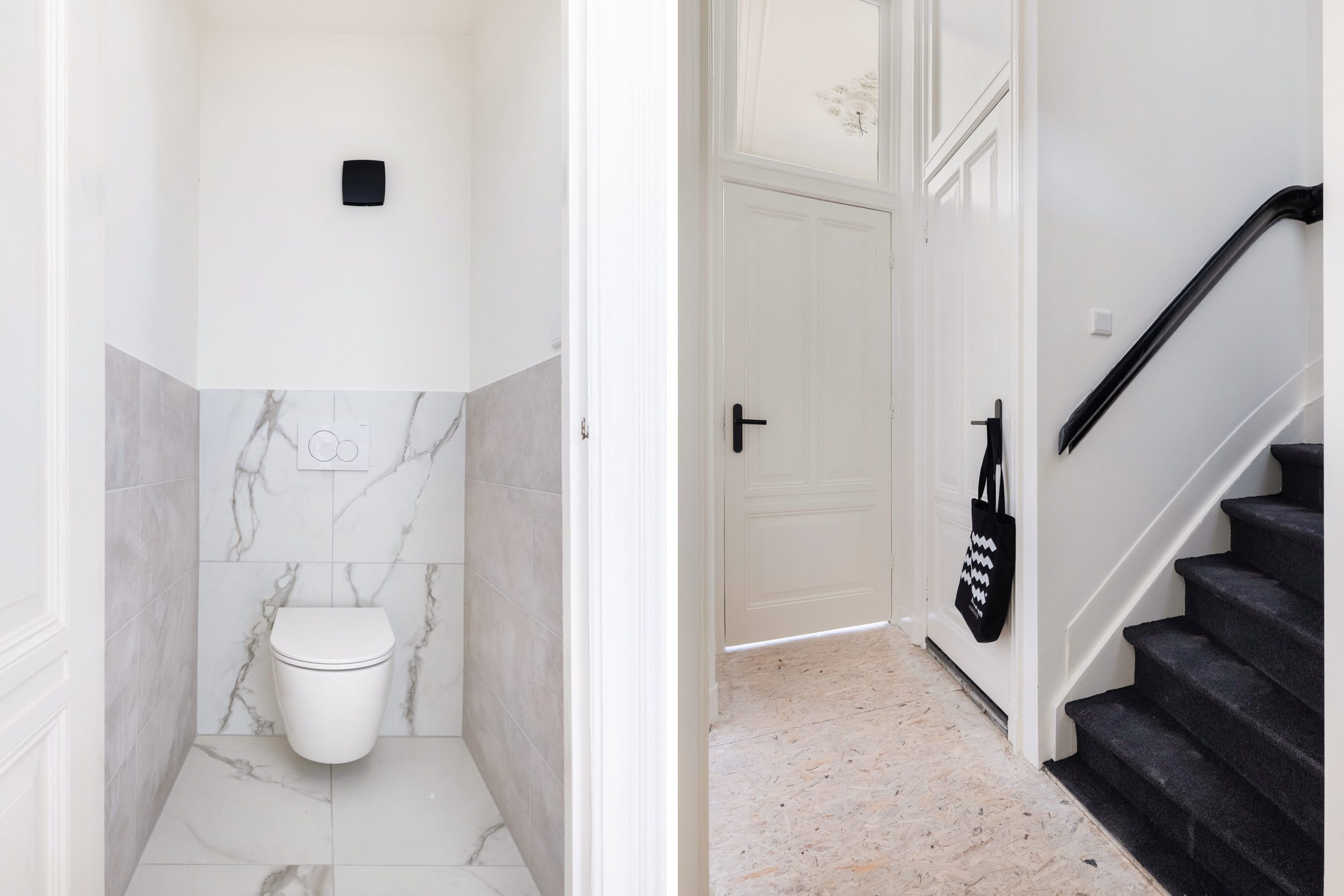 Entree in de hal van de woning met ruimte voor de garderobe, toegang tot het toilet, de woonkamer en de trapopgang naar de tweede verdieping.