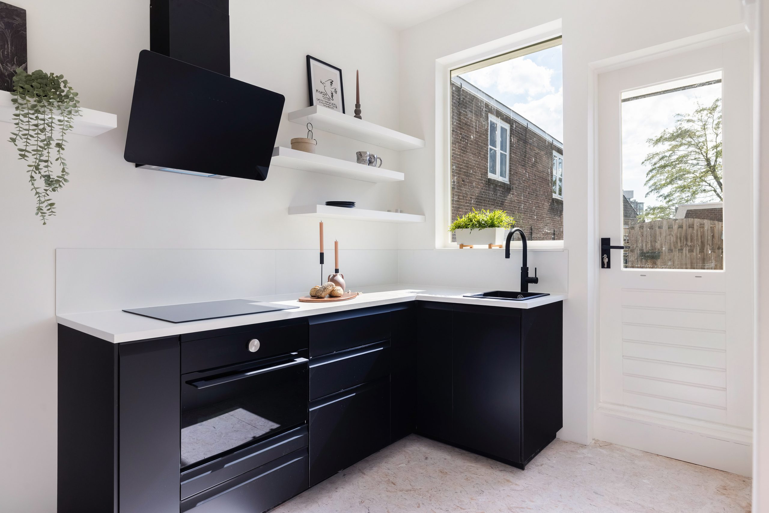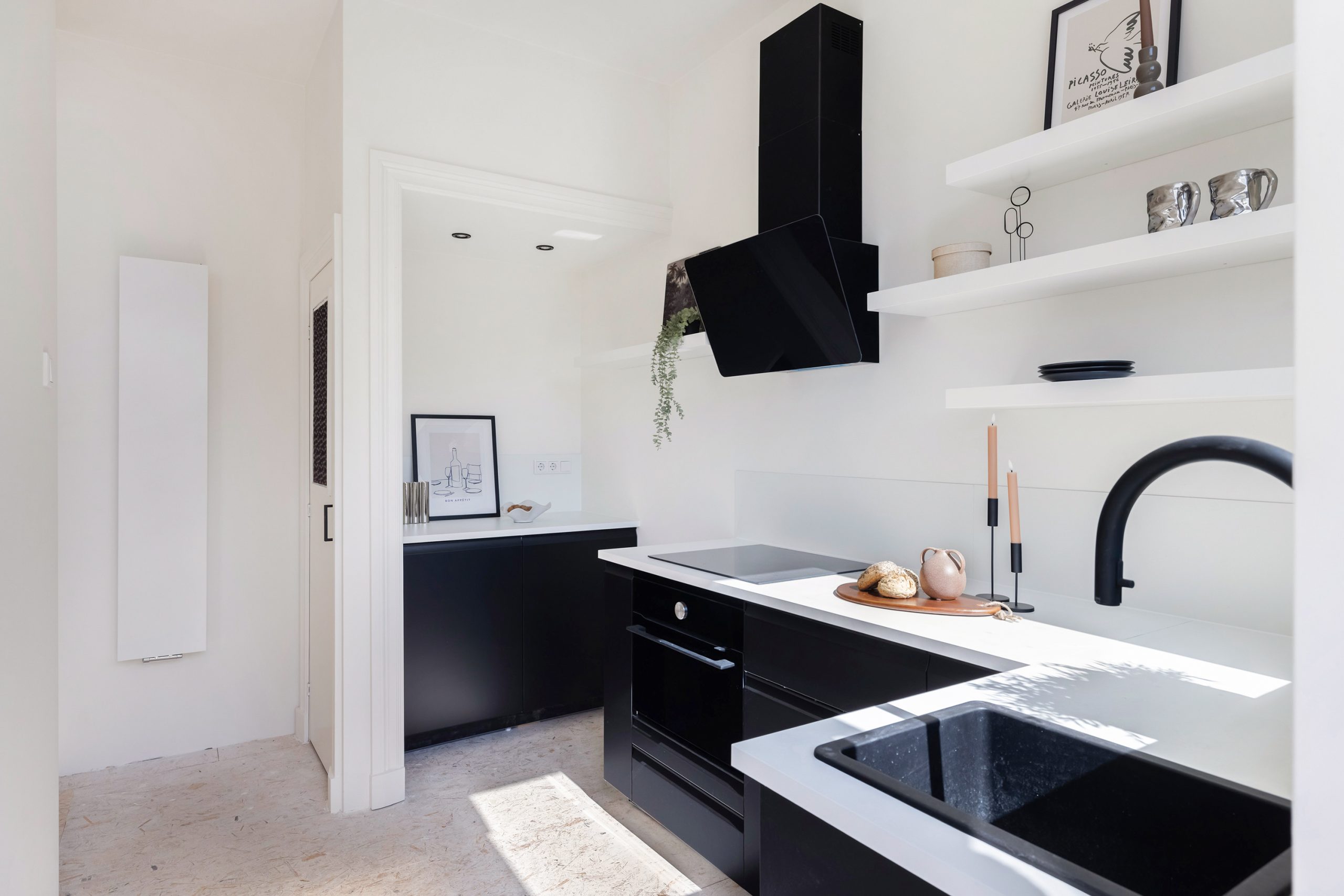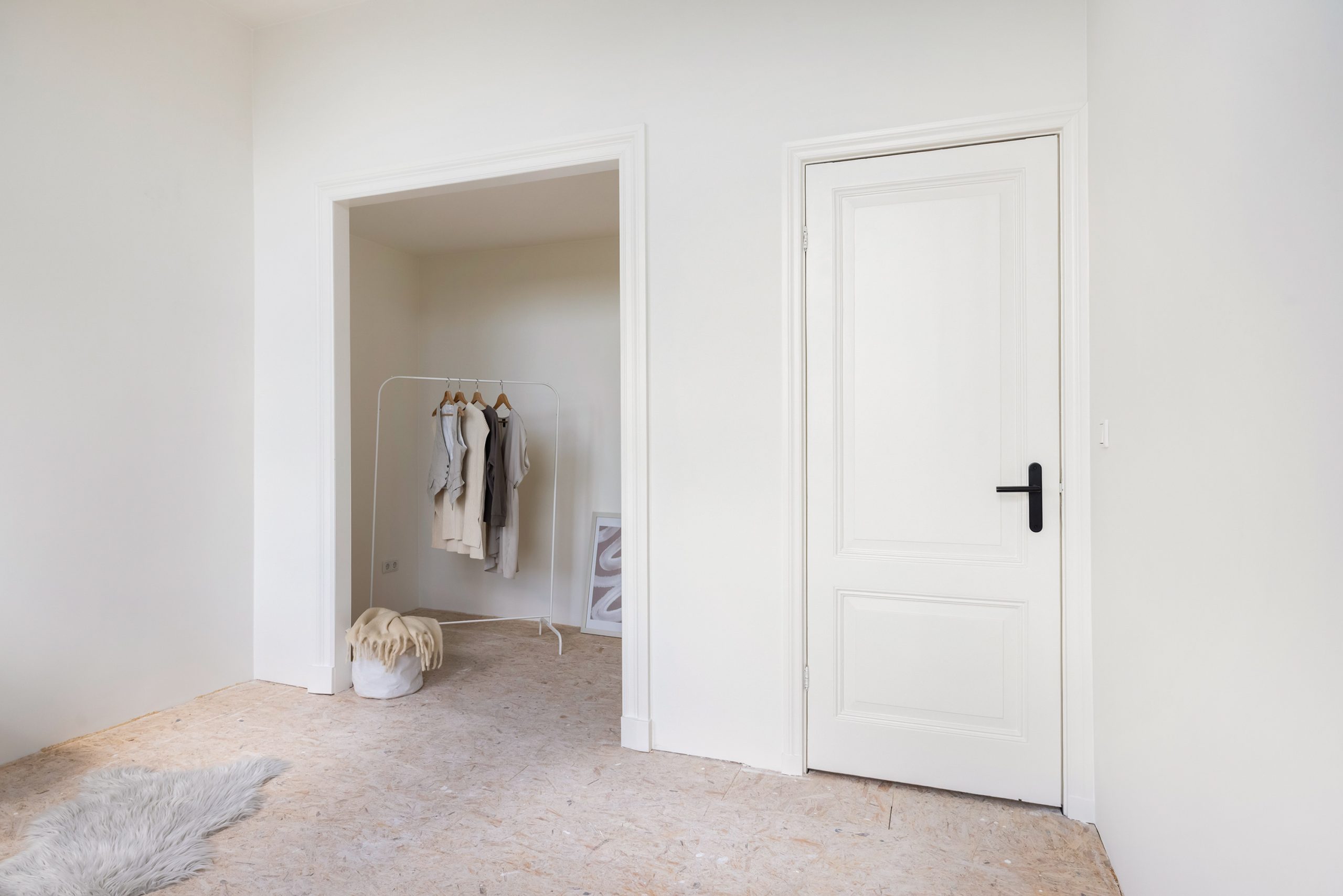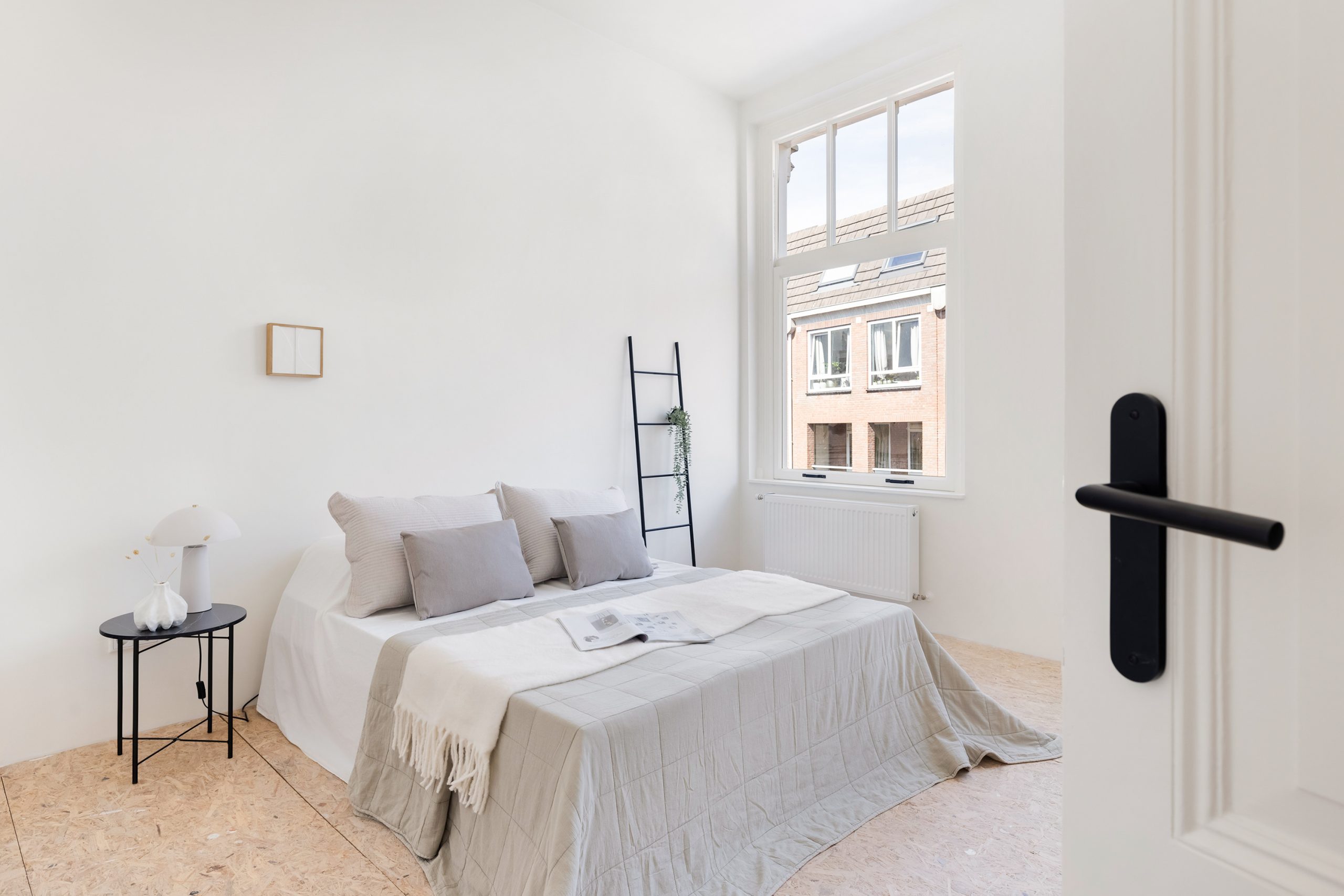 Aan de voorzijde is nu een gezellige zitkamer gecreëerd en achterin is de eetkamer met moderne zwarte keuken; via de keuken stap je zó het ruime balkon op. De vloer is momenteel afgewerkt met OSB-platen, een ideale & strakke basis om jouw eigen vloer (en sfeer) overheen te leggen. Extra plus: er is nog een handige kamer op deze verdieping die zich perfect leent als werk- of hobbyruimte.