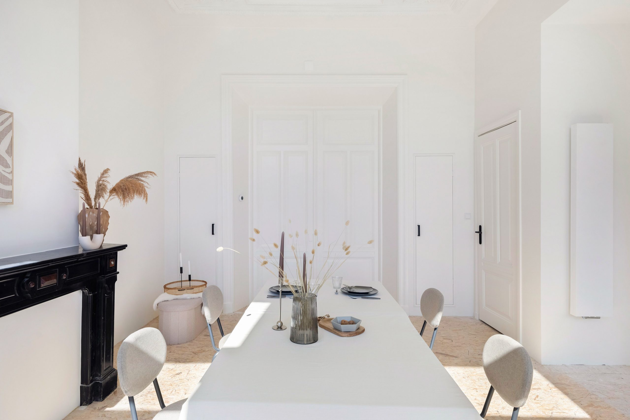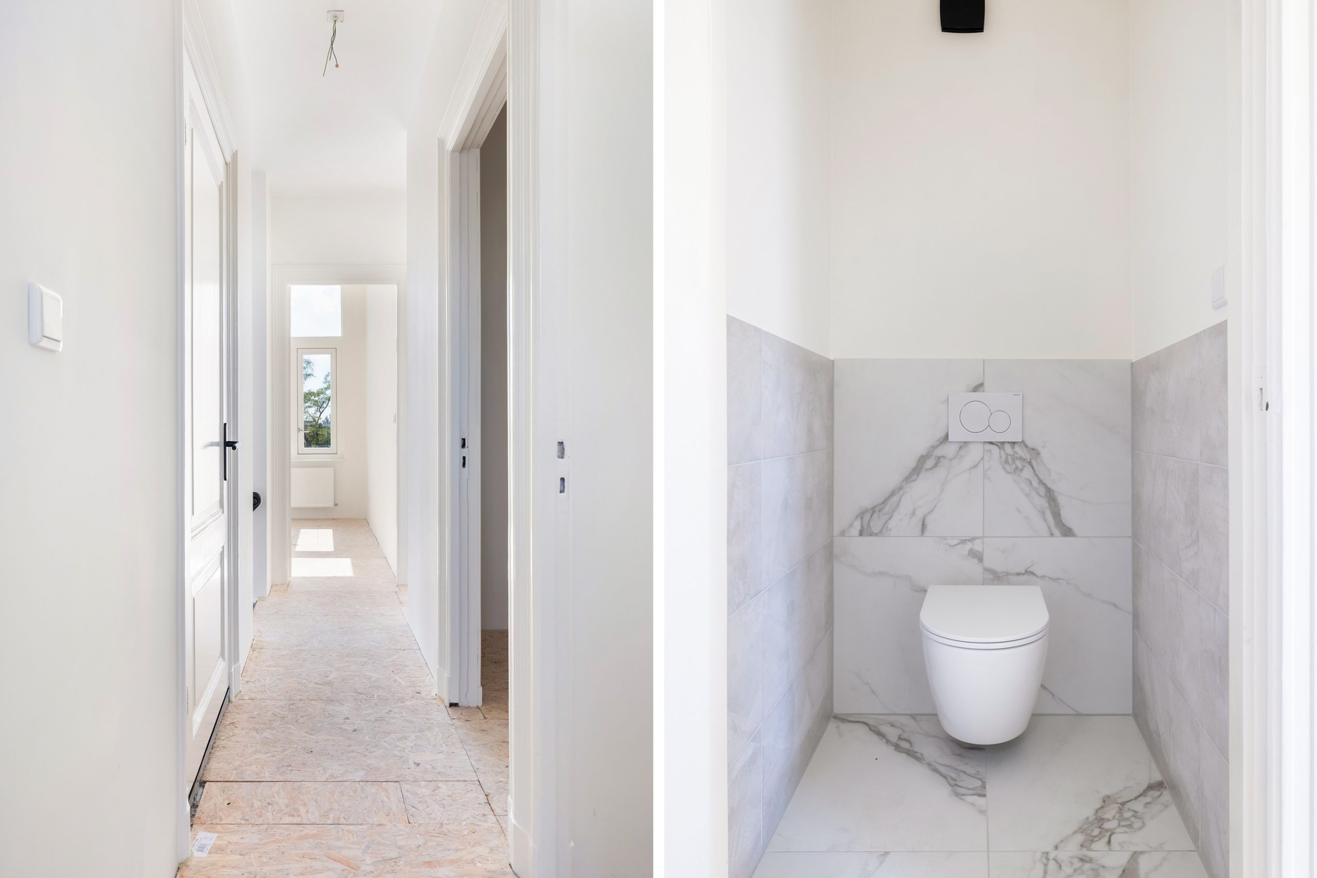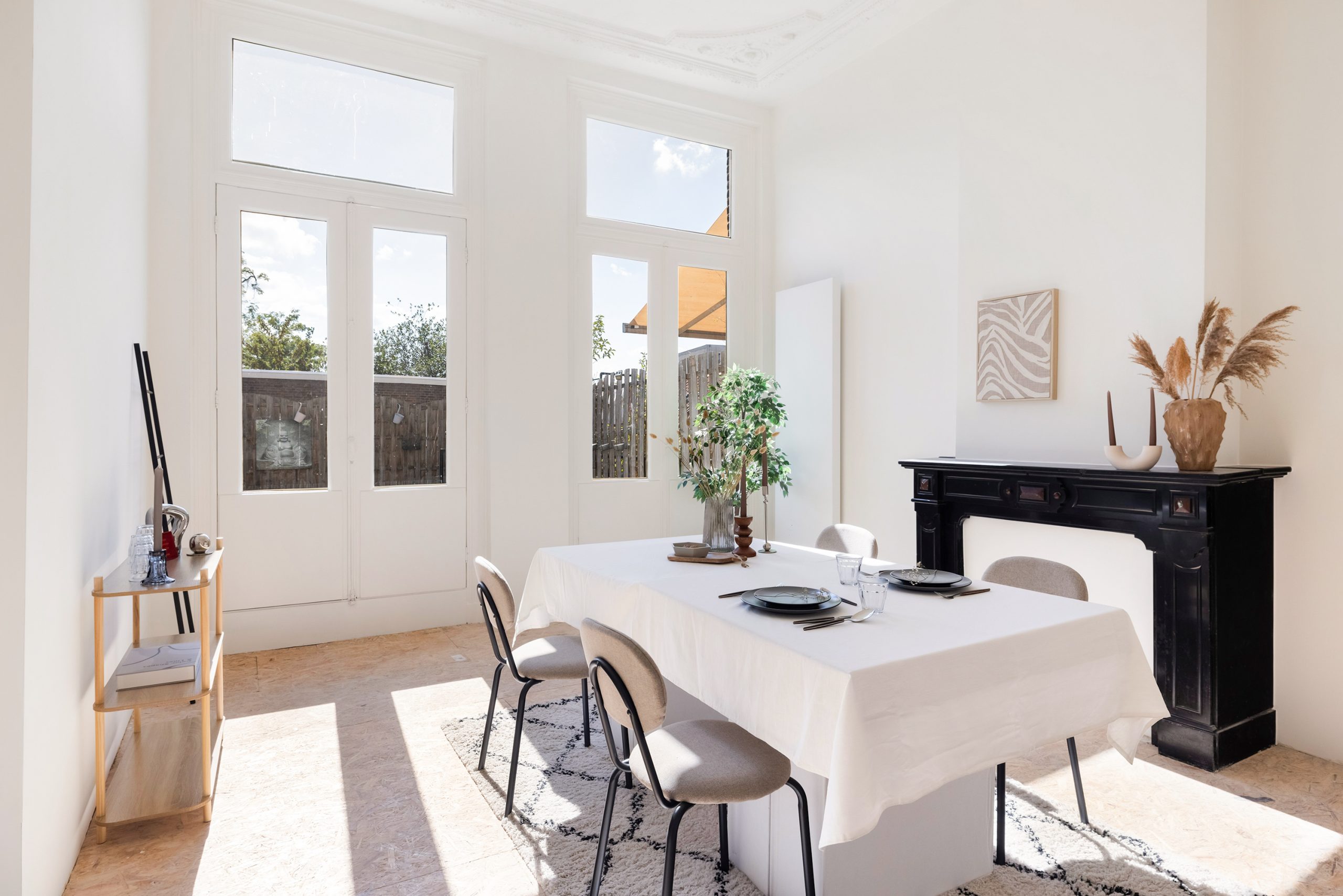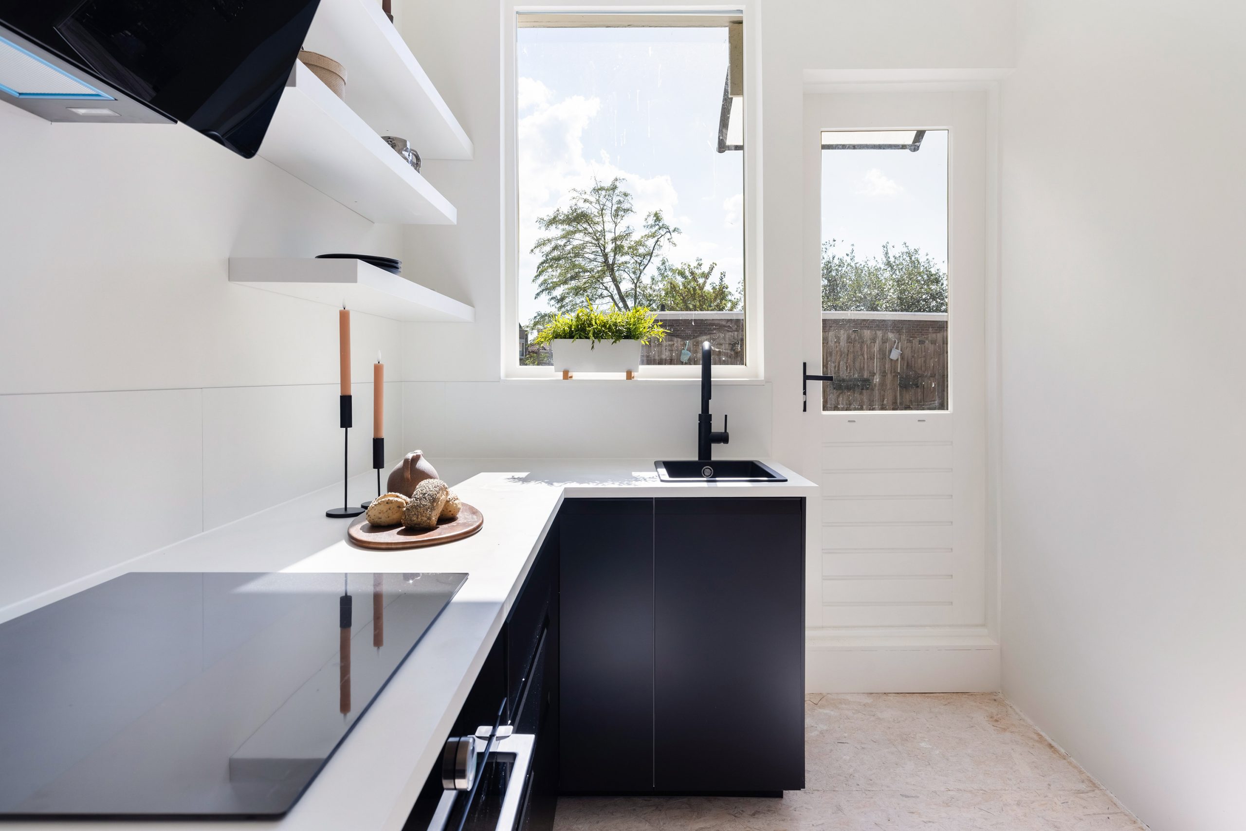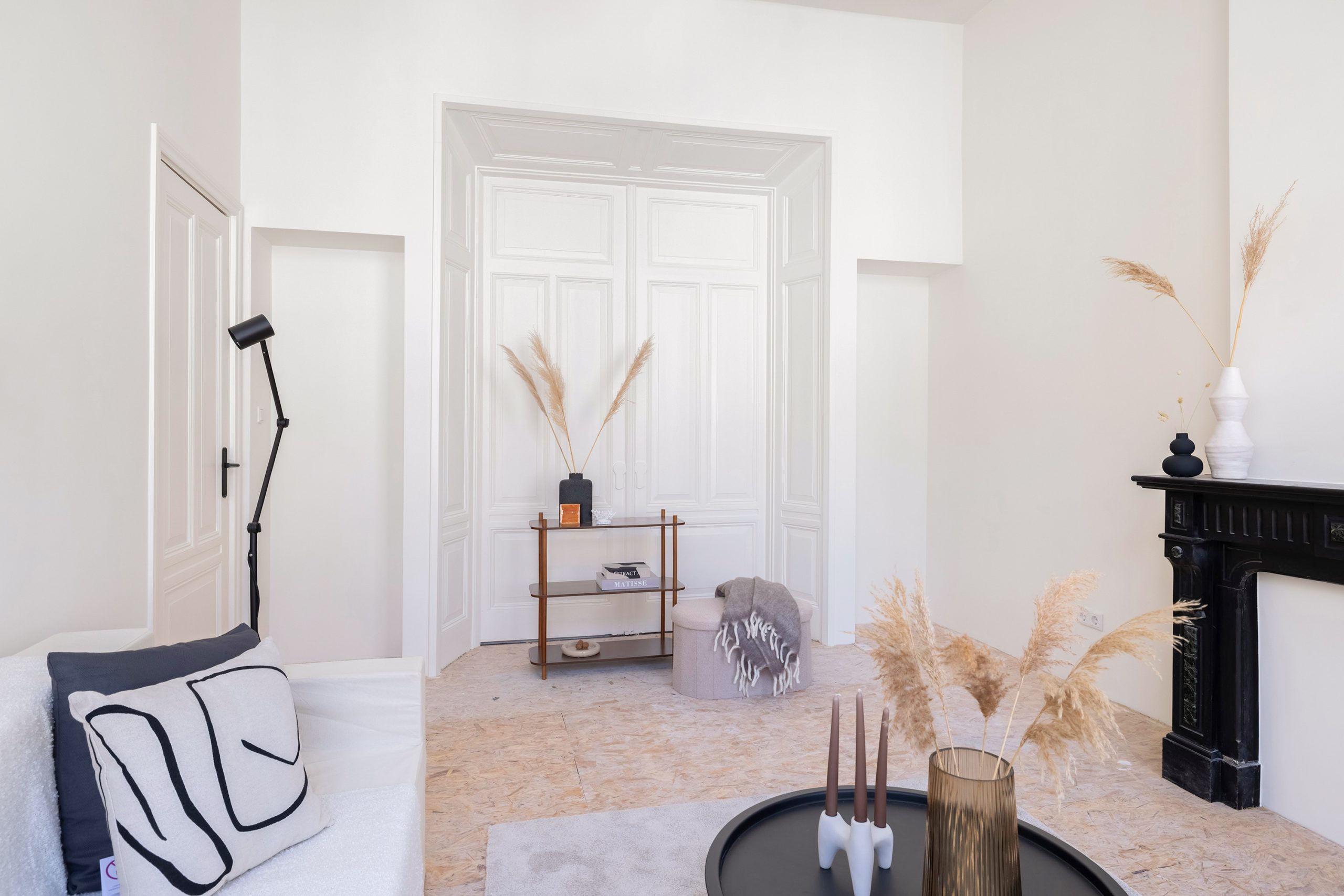 Aan de voorzijde is nu een gezellige zitkamer gecreëerd en achterin is de eetkamer met moderne zwarte keuken; via de keuken stap je zó het ruime balkon op. De vloer is momenteel afgewerkt met OSB-platen, een ideale & strakke basis om jouw eigen vloer (en sfeer) overheen te leggen. Extra plus: er is nog een handige kamer op deze verdieping die zich perfect leent als werk- of hobbyruimte.