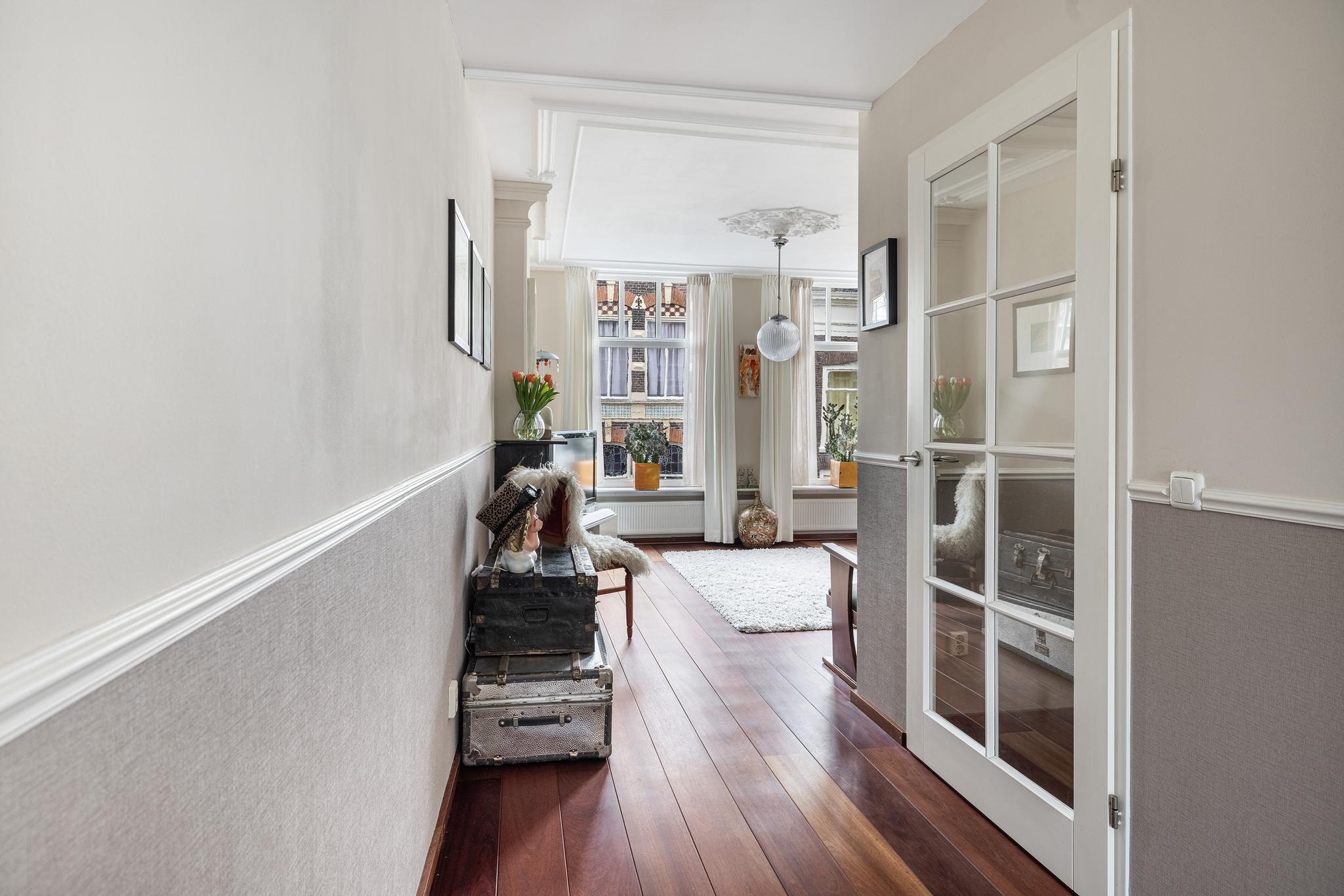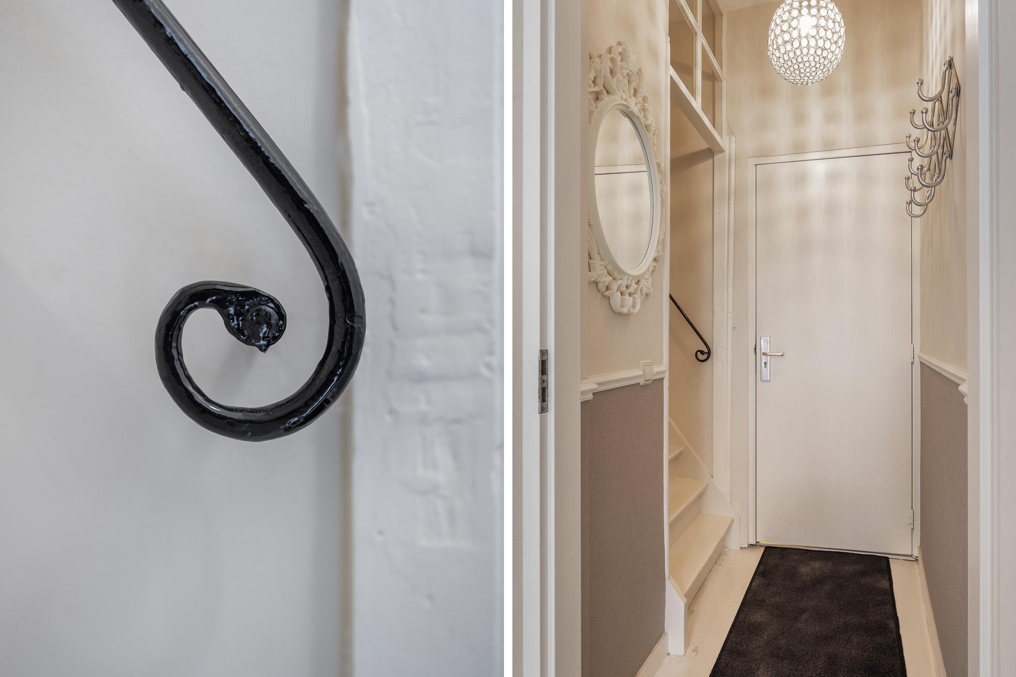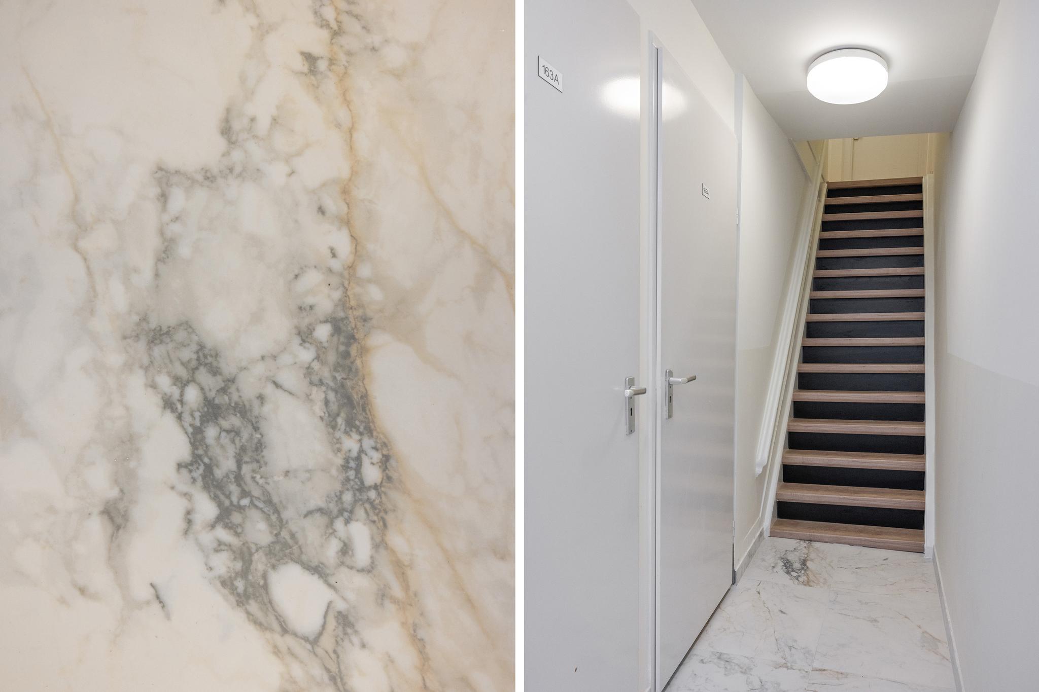Gemeenschappelijke hal met meterkast (6 groepen, 2 aardlekschakelaars, meters), trap naar 1e verdieping. De entree is recent opgefrist en voorzien van een mooie marmeren vloer en eikenhouten traptreden.