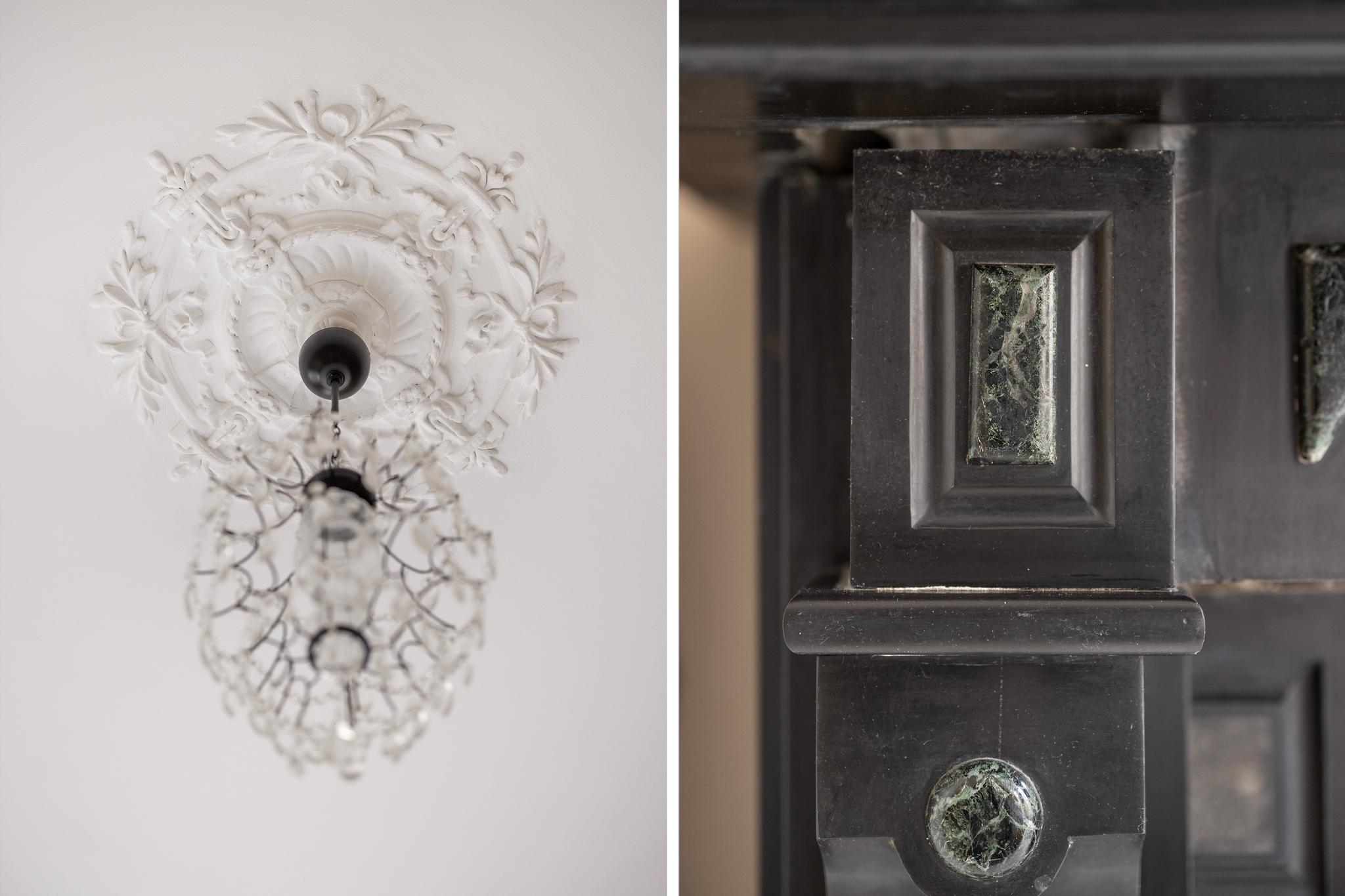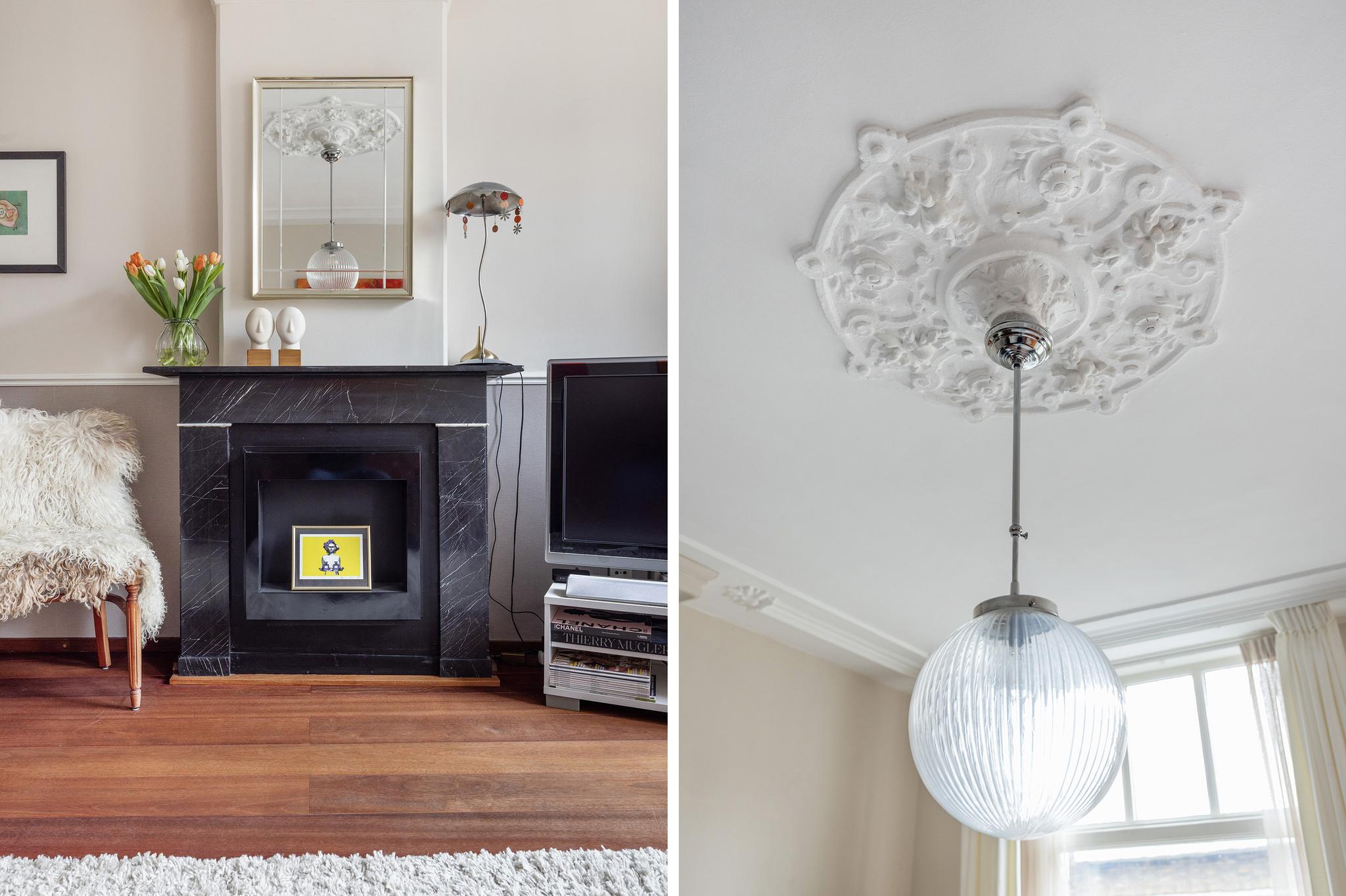 - Prachtige karakteristieke ornamentenplafonds en marmeren schouwen in woon- en slaapkamer;