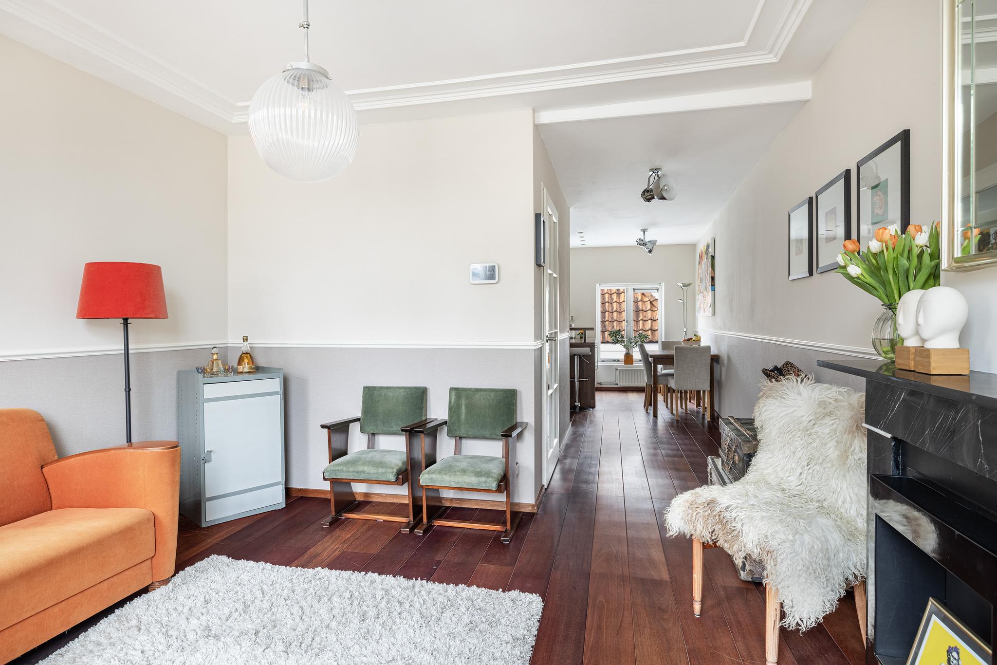 De woonkamer beschikt over karakteristiek ornamentenplafond, hijsramen (enkel glas) en een marmeren schouw met een moderne waxhaard en is verder afgewerkt met een mooie parketvloer.
