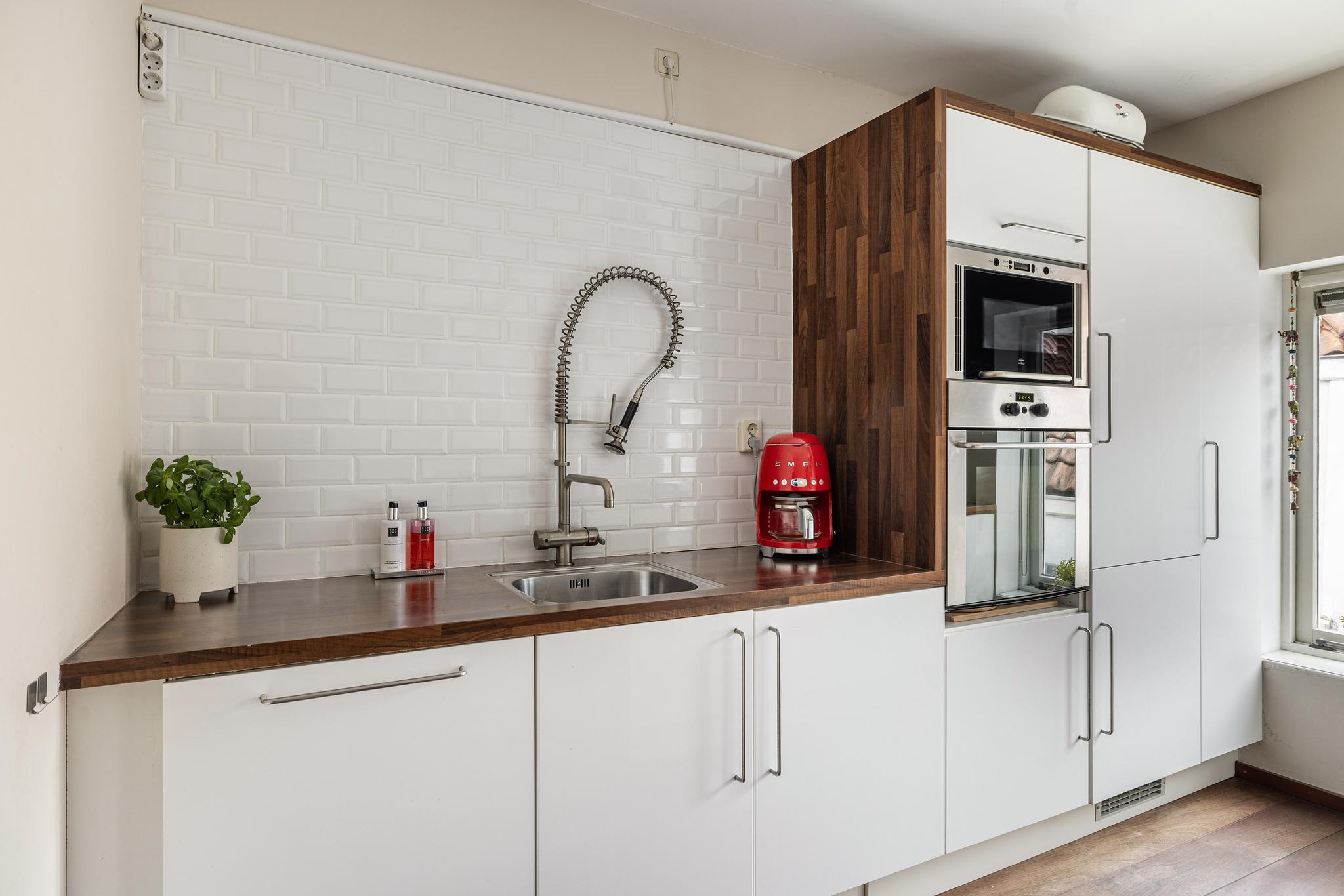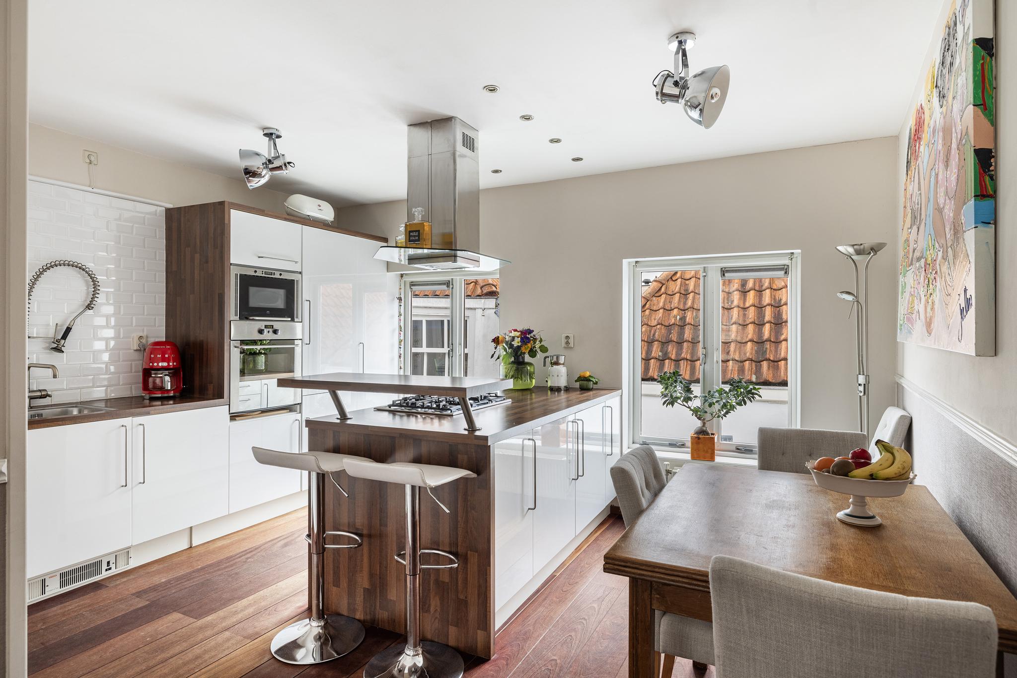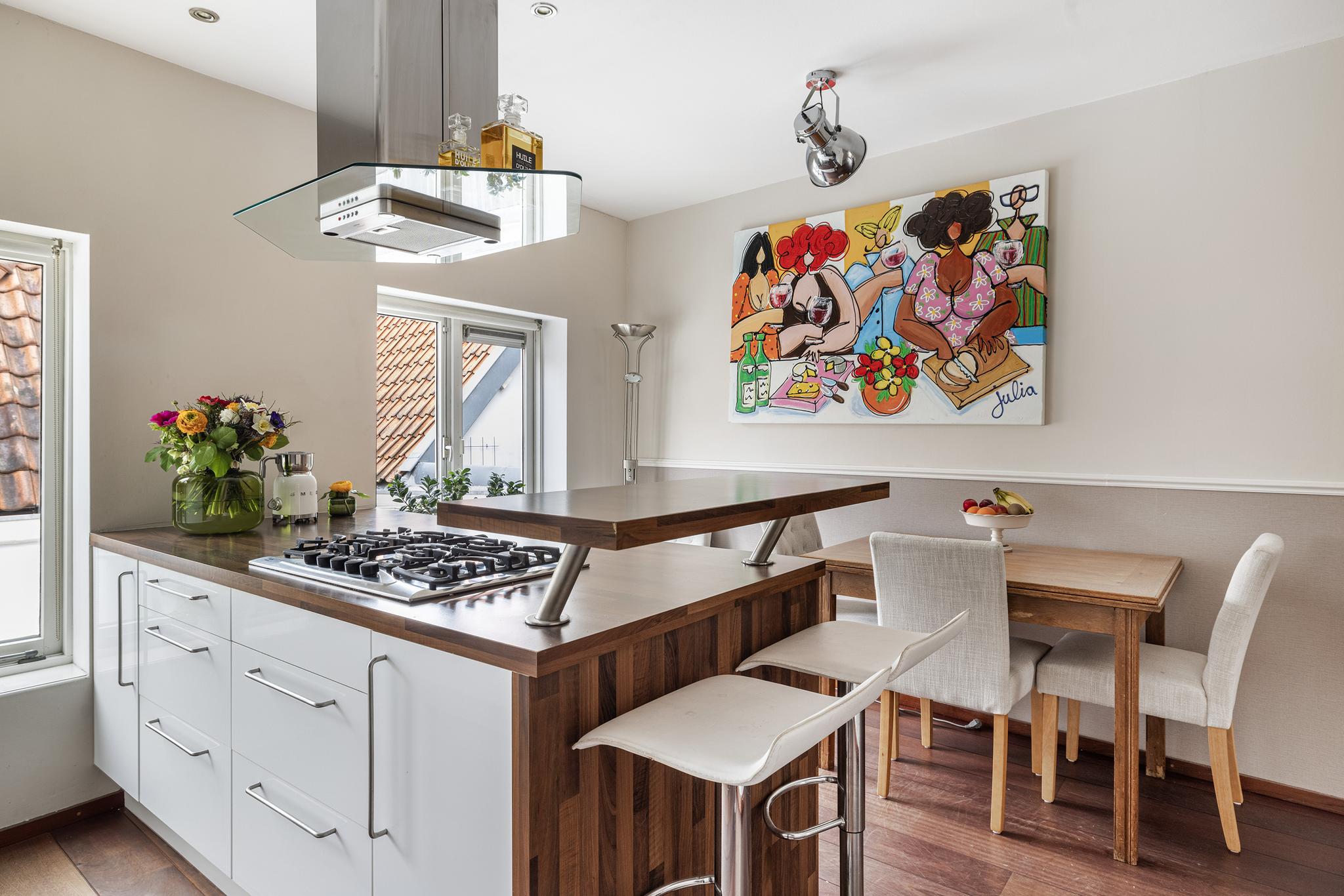 De leefkeuken is de ideale ruimte om te ontspannen na een dag werken, te borrelen met vrienden of te genieten van een goede maaltijd. De keuken bestaat uit een wandopstelling met kook(schier)eiland, en beschikt over een 5-pit gaskookplaat met afzuigschouw, oven, magnetron, vaatwasser, horeca-kraan, koelkast, vriezer, apothekerskast en genoeg bergruimte. De keuken is afgewerkt met een houten werkblad en metro-tegeltjes. Met een verhoogd blad aan het kookeiland is een gezellige bar gecreëerd.