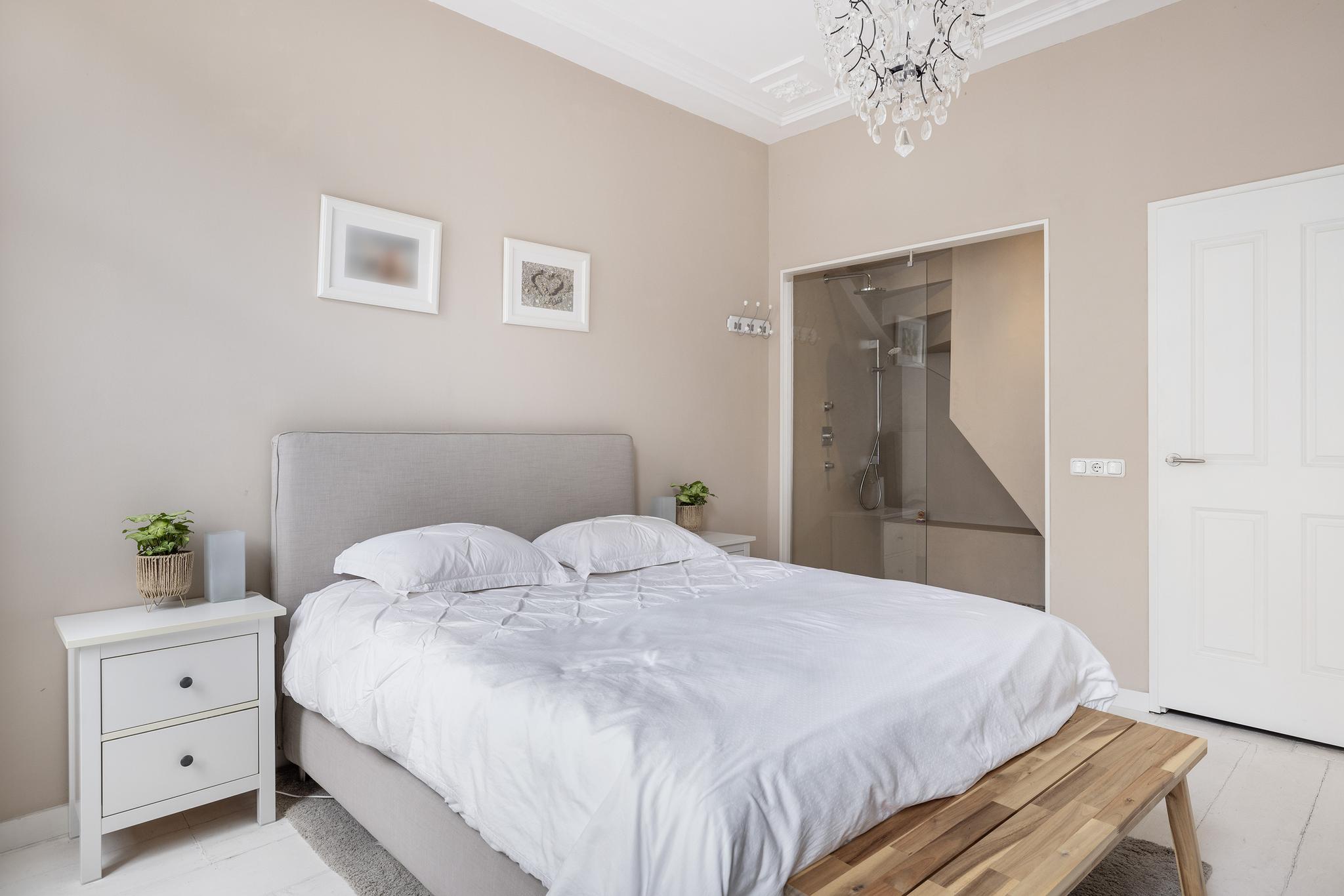Royale slaapkamer met badkamer en-suite. Deze prachtige kamer geeft echt het hotelsuite-gevoel en is voorzien van karakteristiek ornamentenplafond, marmeren schouw, glad gestukte wanden en een houten vloer.