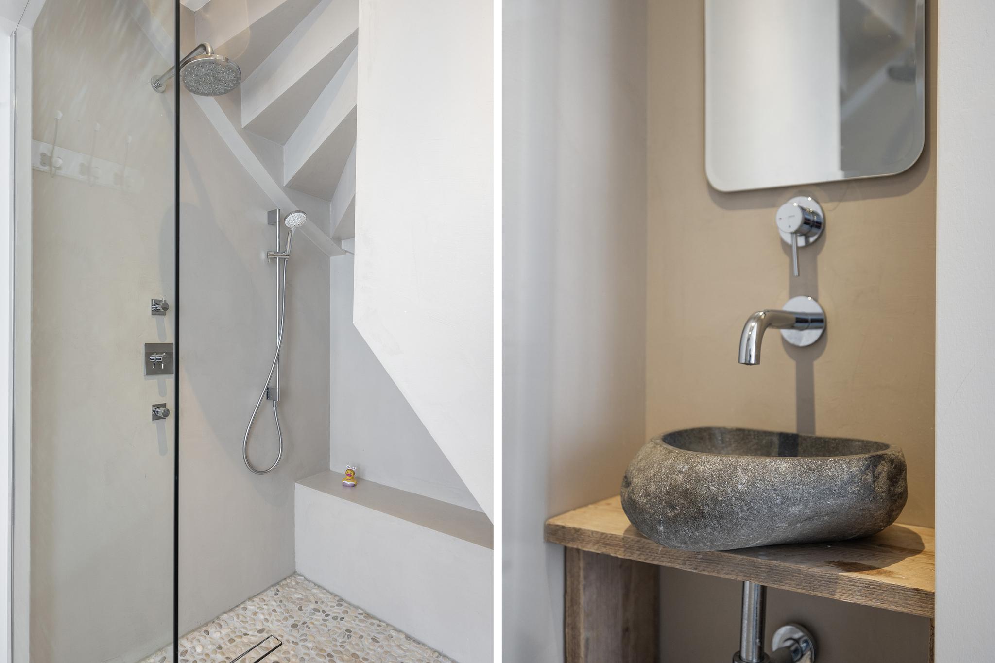 De badkamer en-suite is middels een glazen wand gescheiden van de slaapkamer en voorzien van een inloopdouche met in de wand verwerkte kraan en regendouche en een natuurstenen waskom.